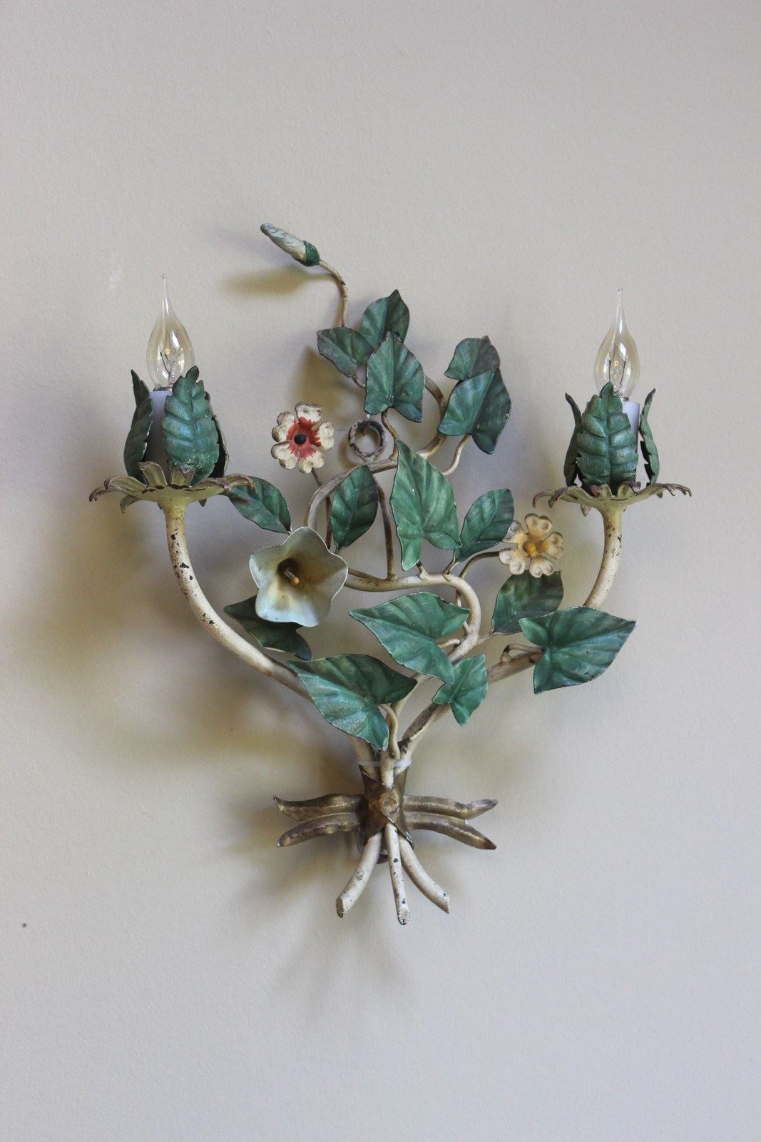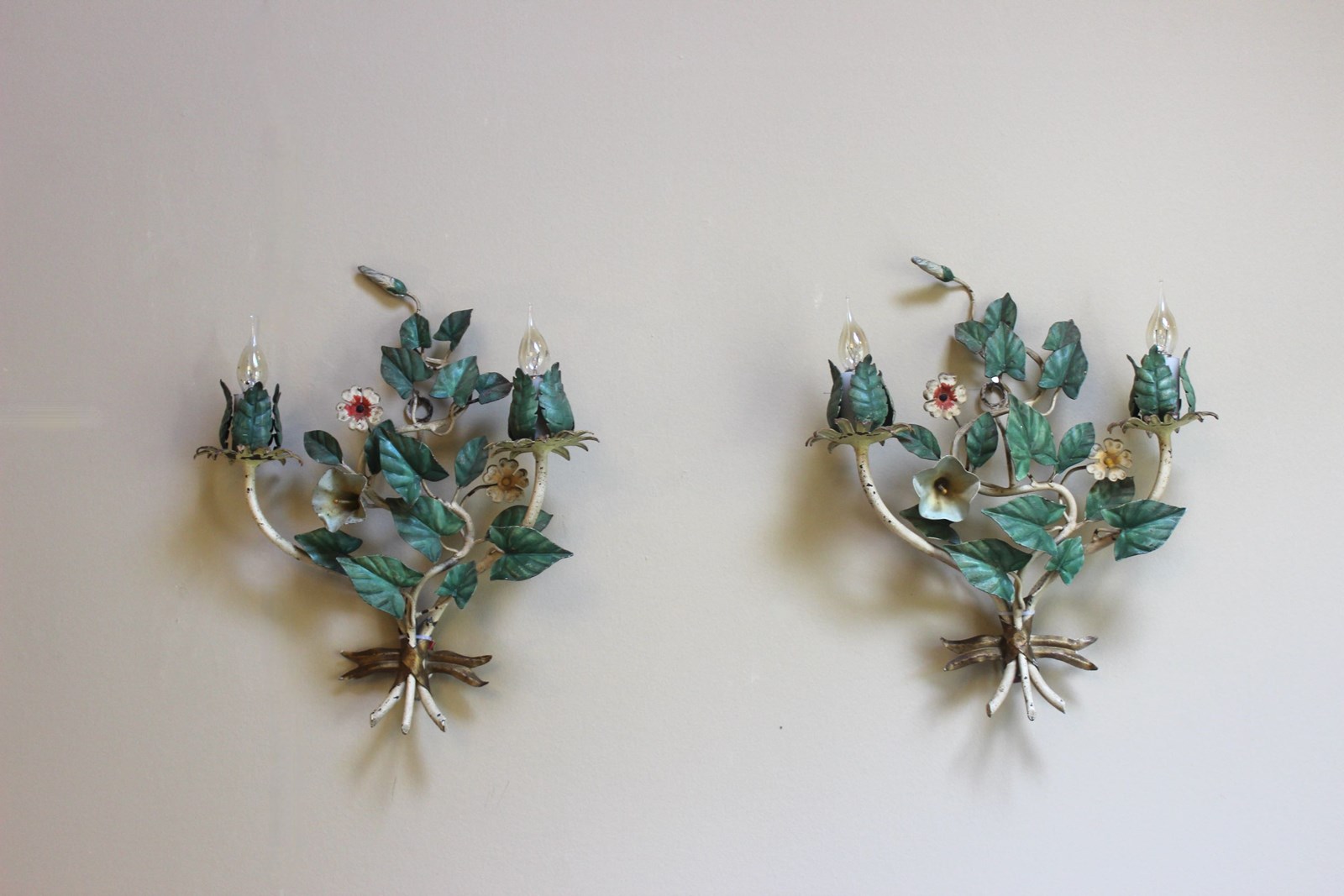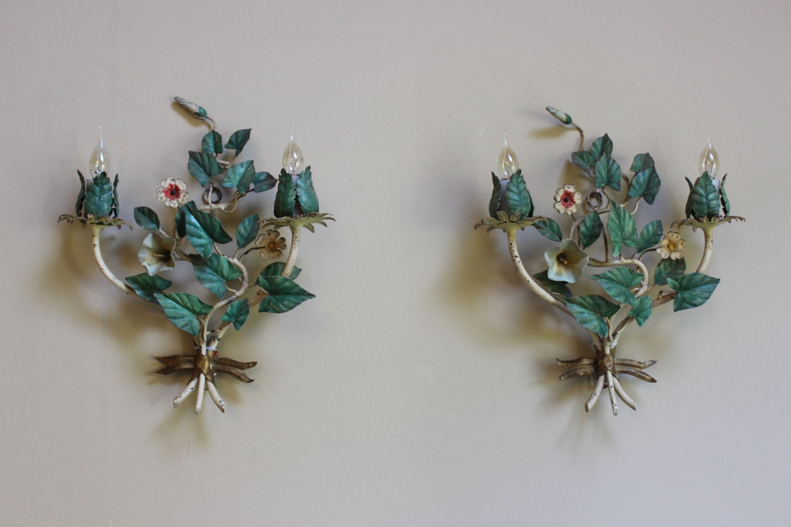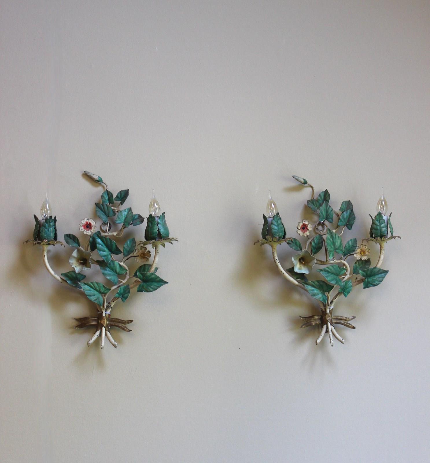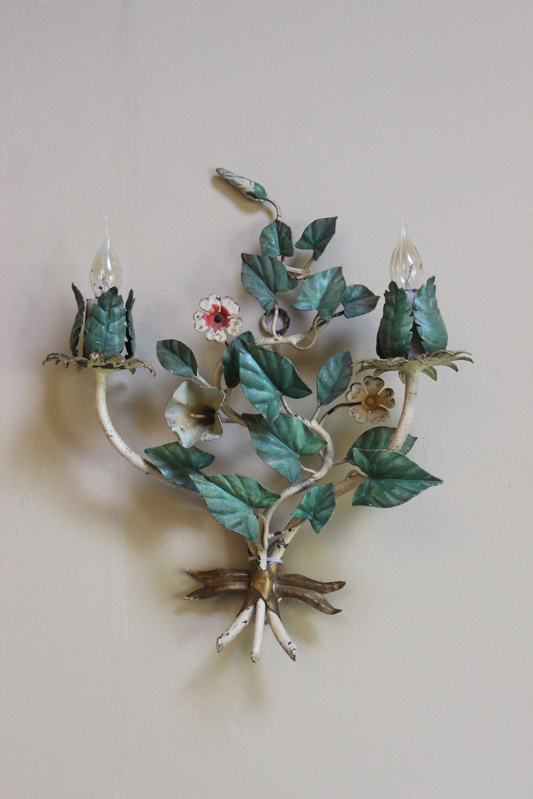 Elegant pair of mid century French twin branch flat to the wall ivy leaf sconces with 8 cms projection