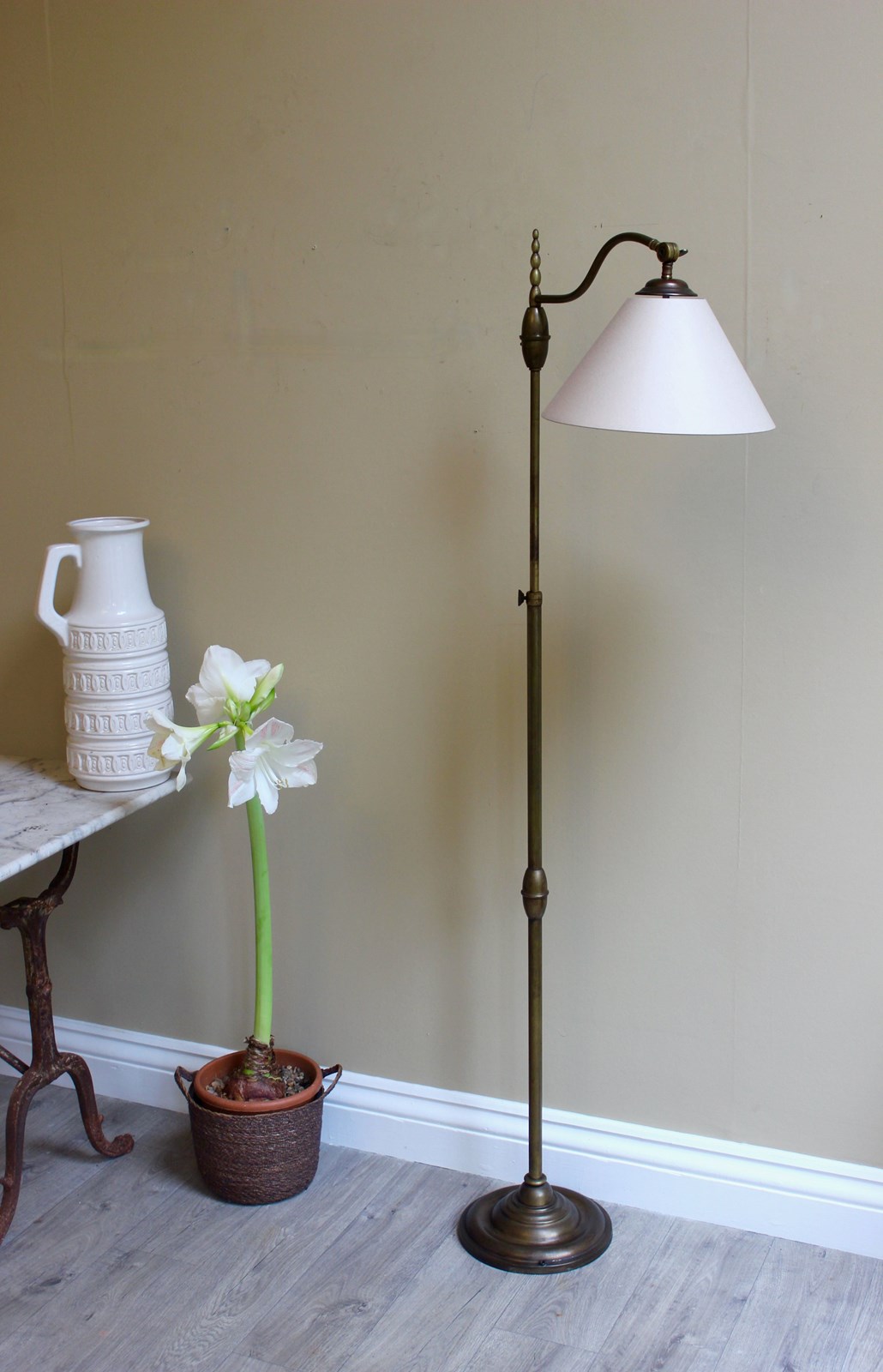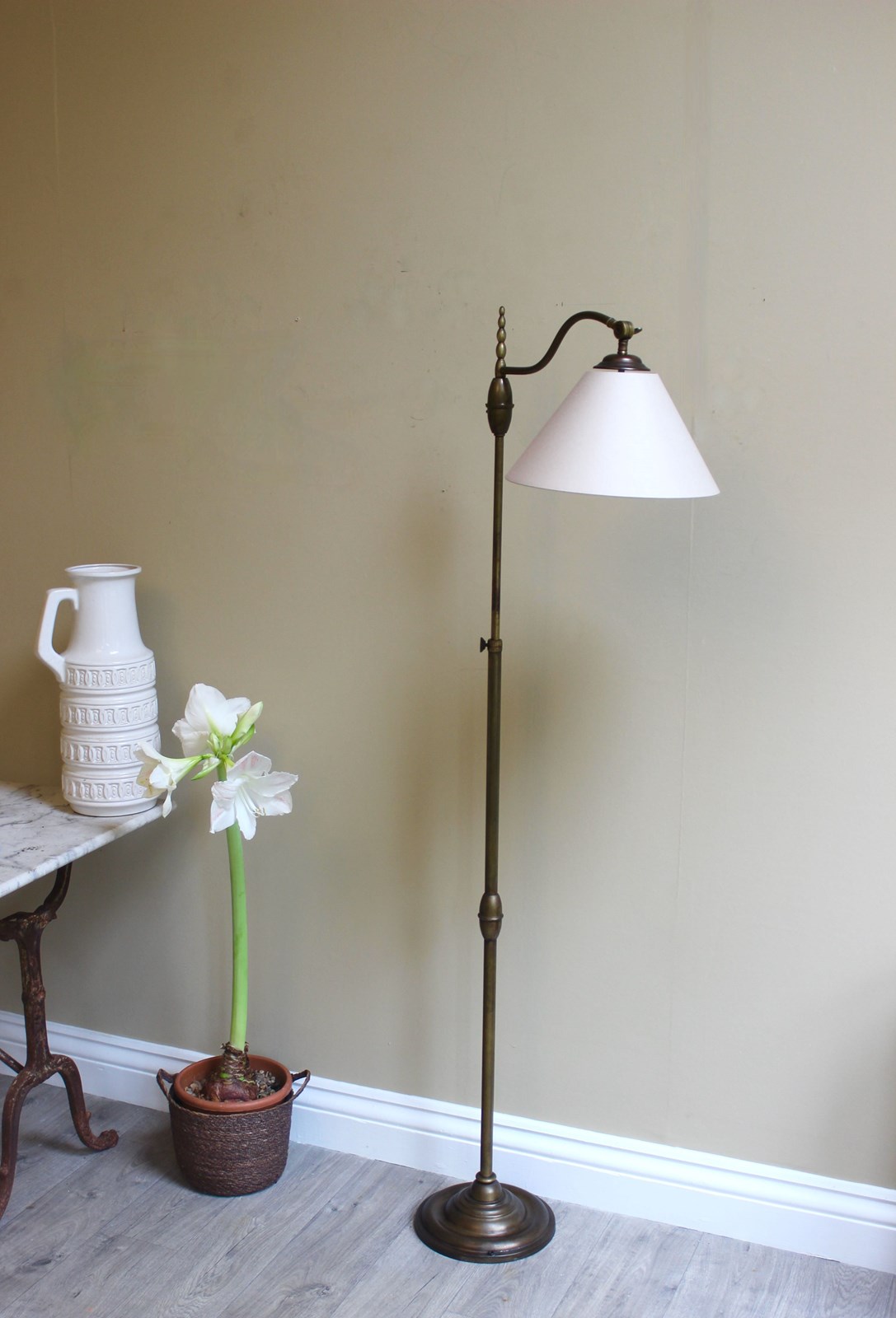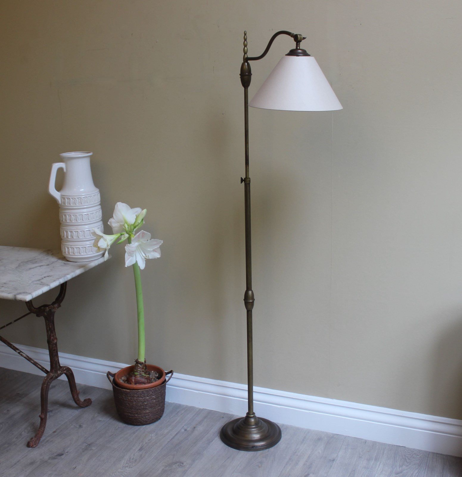 Height adjustment is from 160 cms down to approx 130 cms and the shade has adjustable positions for reading - perfect for beside a chair orsofa or in a library