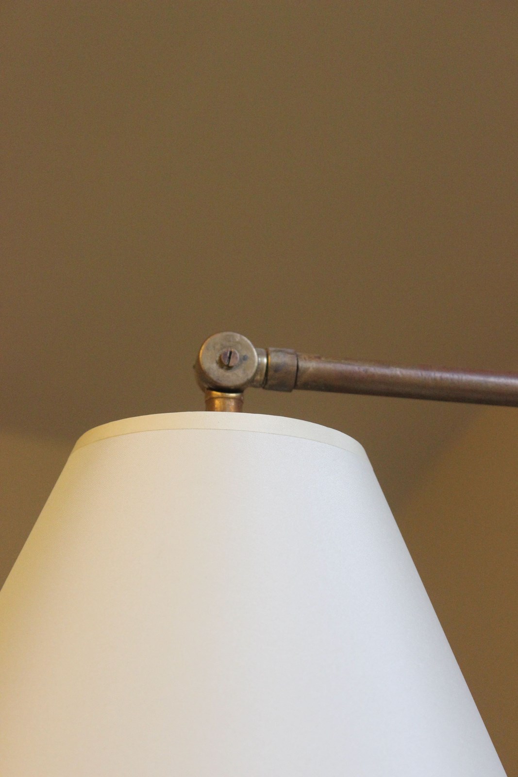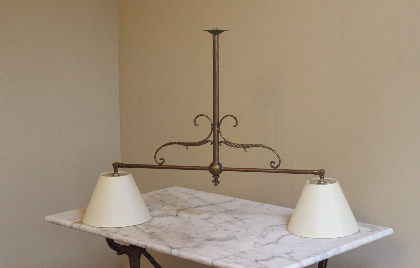 Pair of English early 20th C brass and copper counter lights or electroliers measuring 50 cms high to a fluted ceiling plate ad 70 cms wide end to end - please note - the height can be adjusted if required by the addition of additional brass tubing ( please ask ). These have been suspended on a chain for photographic purposes. Useful for above kitchen counters or in games rooms.