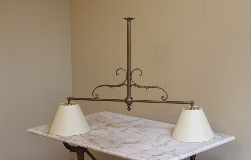 Pair of English early 20th C brass and copper counter lights or electroliers measuring 50 cms high to a fluted ceiling plate ad 70 cms wide end to end - please note- the height can be adjusted if required by the addition of additional brass tubing ( please ask ) - these have been suspended on a chain for photographic purposes . Useful for above kitchen counters or in games rooms