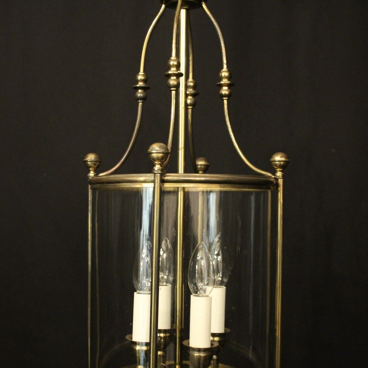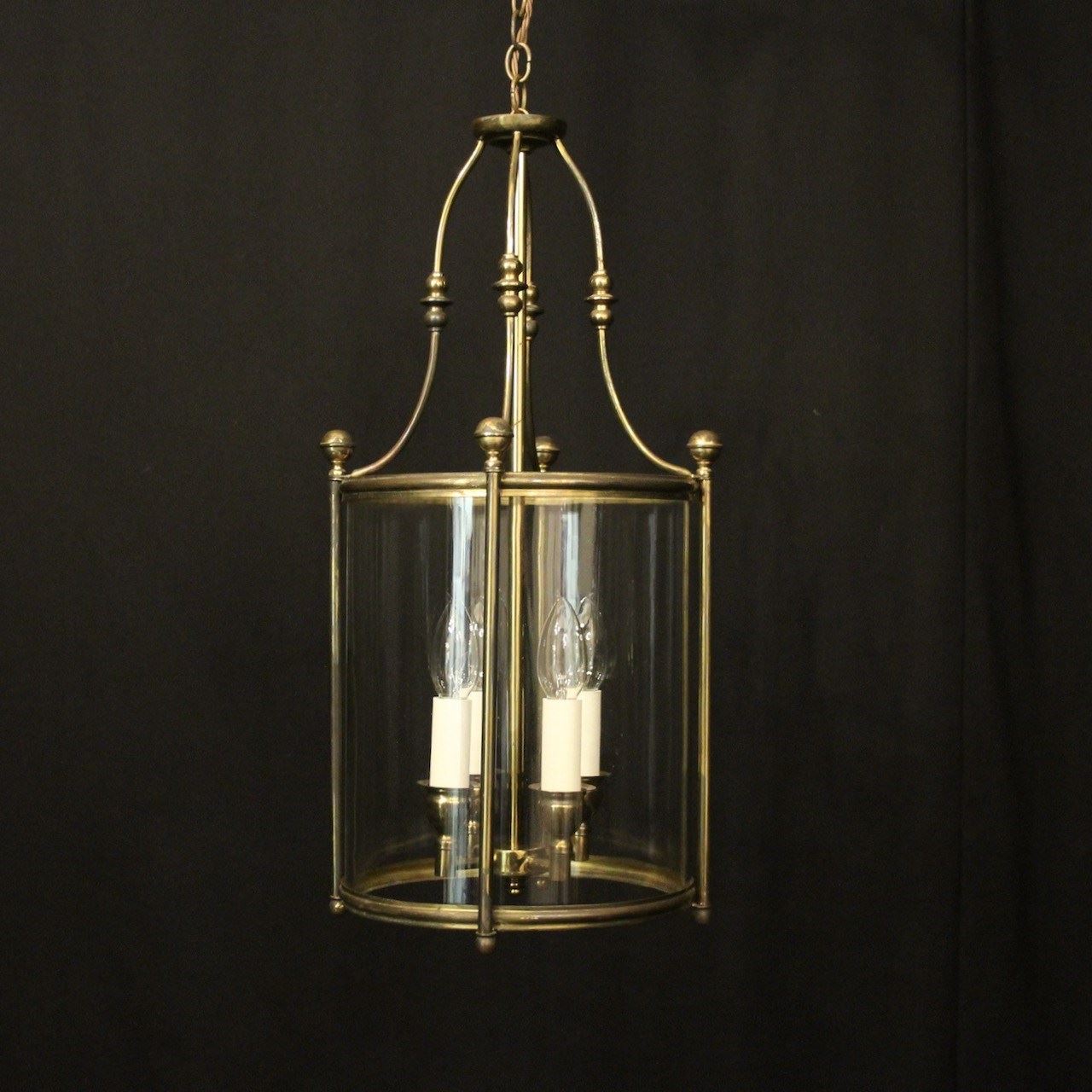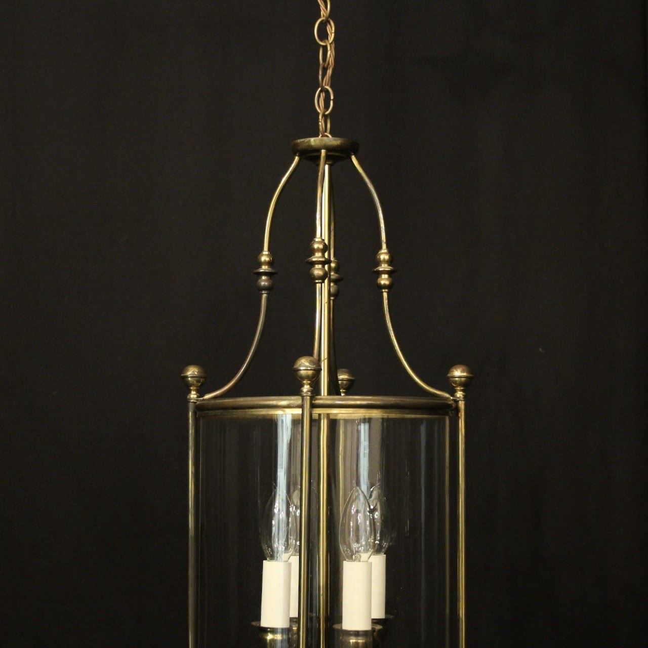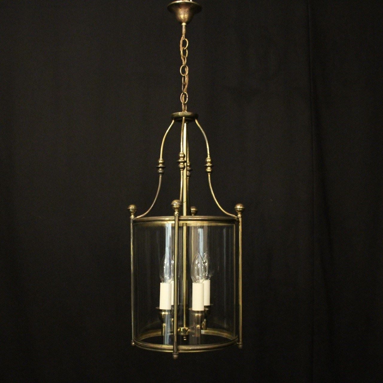 An English faded gilded brass four light hall lantern, the four light fittings with bulbous candle sconces, surrounded by a single convex glass panel, held within a simple banded framework with ball finials and scrolling canopy, having the original chain and ceiling rose. Fully rewired and PAT tested. All our lanterns come with bulbs and ceiling fixings.
