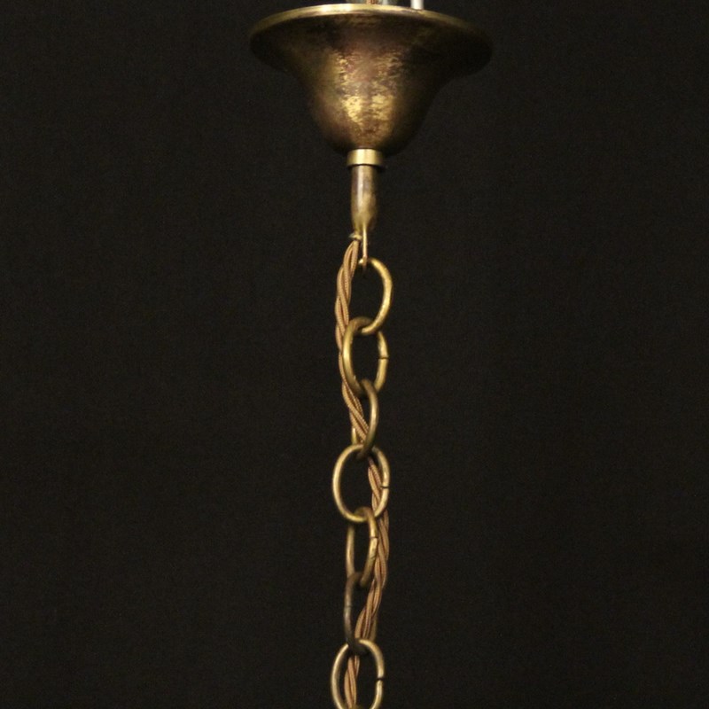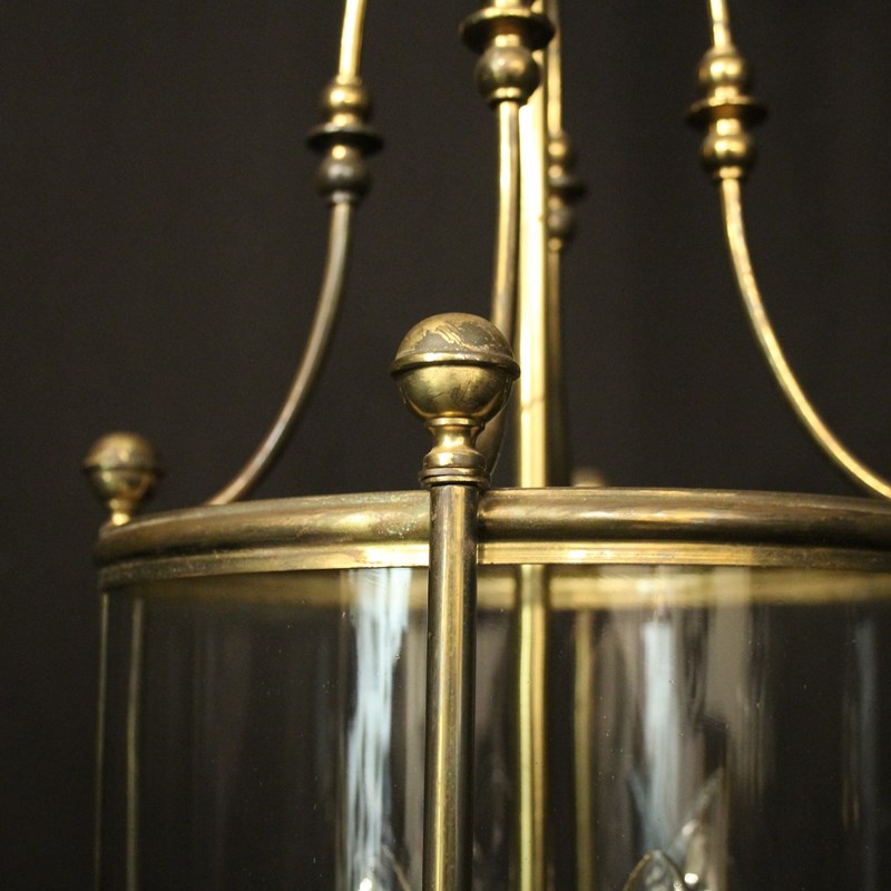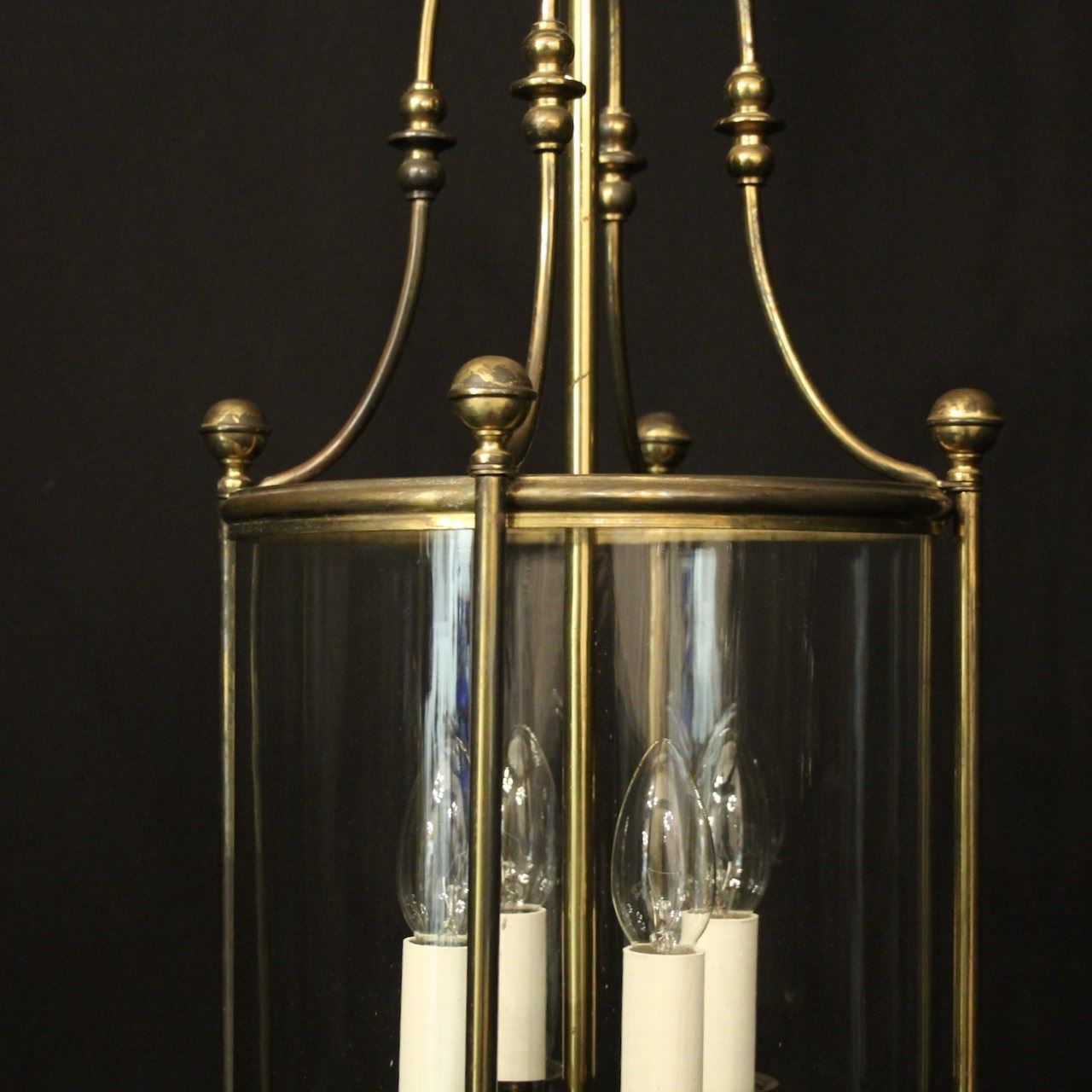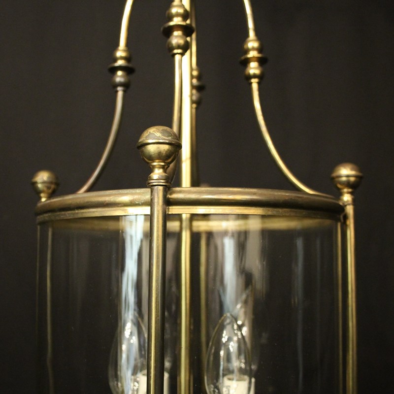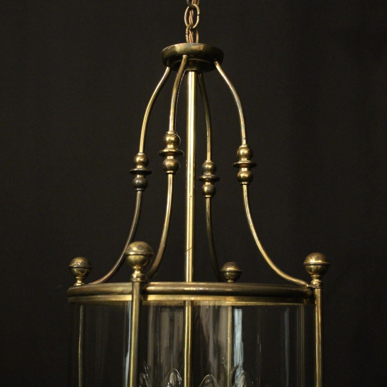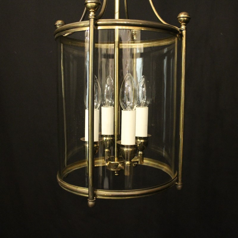 An English faded gilded brass four light hall lantern, the four light fittings with bulbous candle sconces, surrounded by a single convex glass panel, held within a simple banded framework with ball finials and scrolling canopy, having the original chain and ceiling rose. Fully rewired and PAT tested. All our lanterns come with bulbs and ceiling fixings.