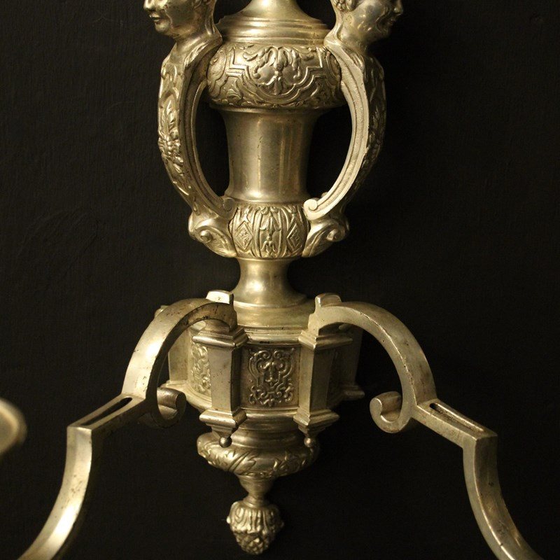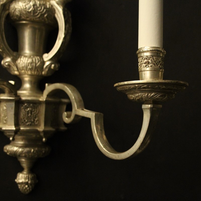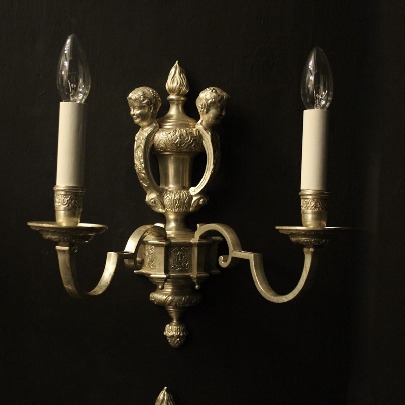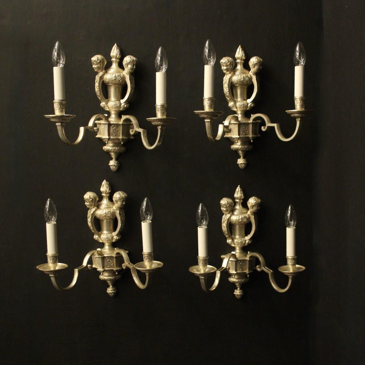 A nice English set of 4 silvered brass twin arm Knole antique wall lights, the square gauge scrolling arms with decoratively etched circular drip pans and etched candle sconces, issuing from an ornate twin mask cherub surmounts, lovely silver patination and very well cast. Fully rewired and PAT tested. All our wall lights come with aged brass screws or brackets for fixing and spare bulbs.