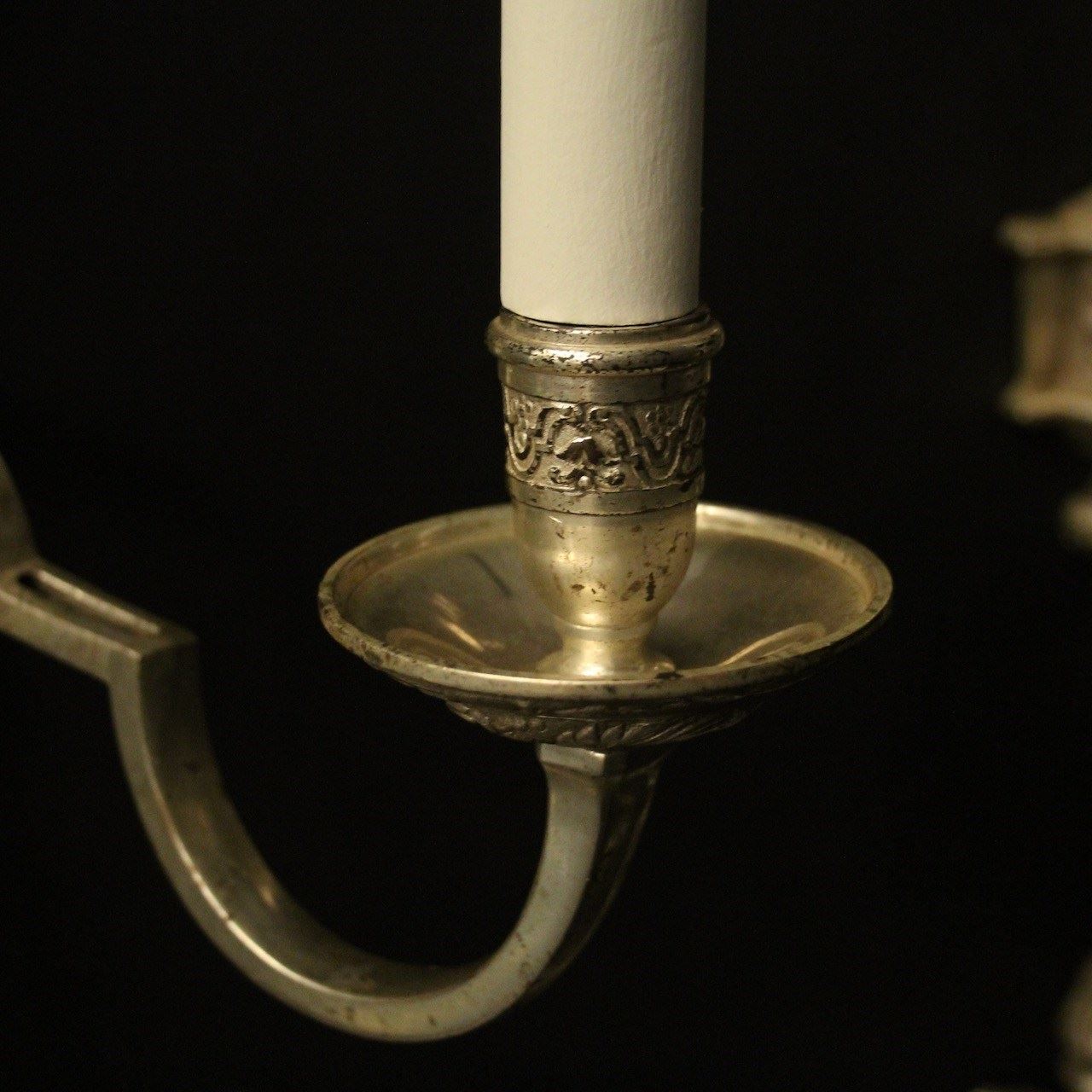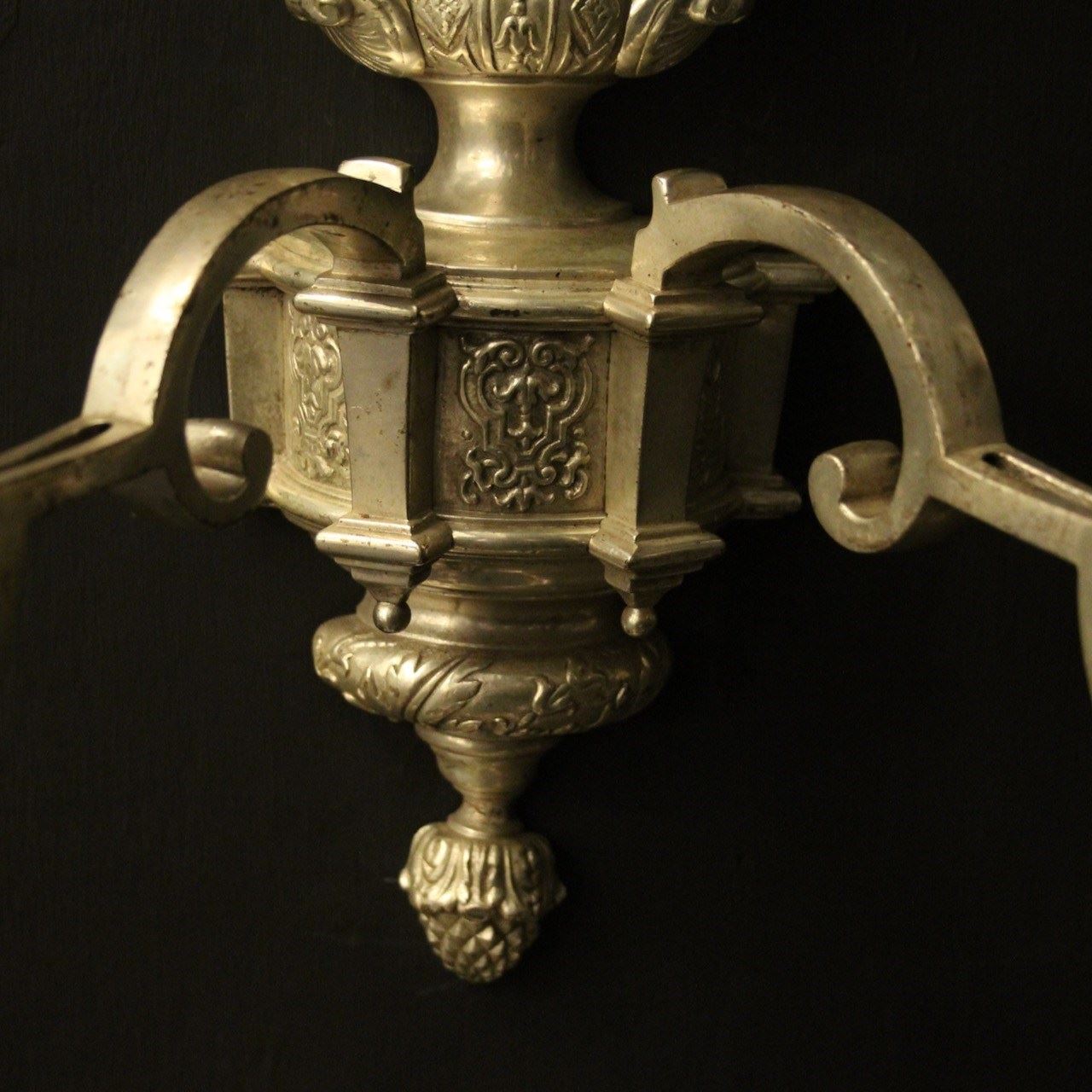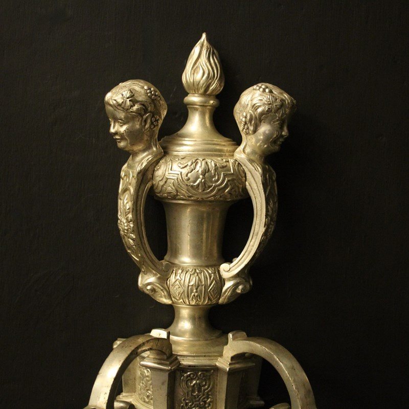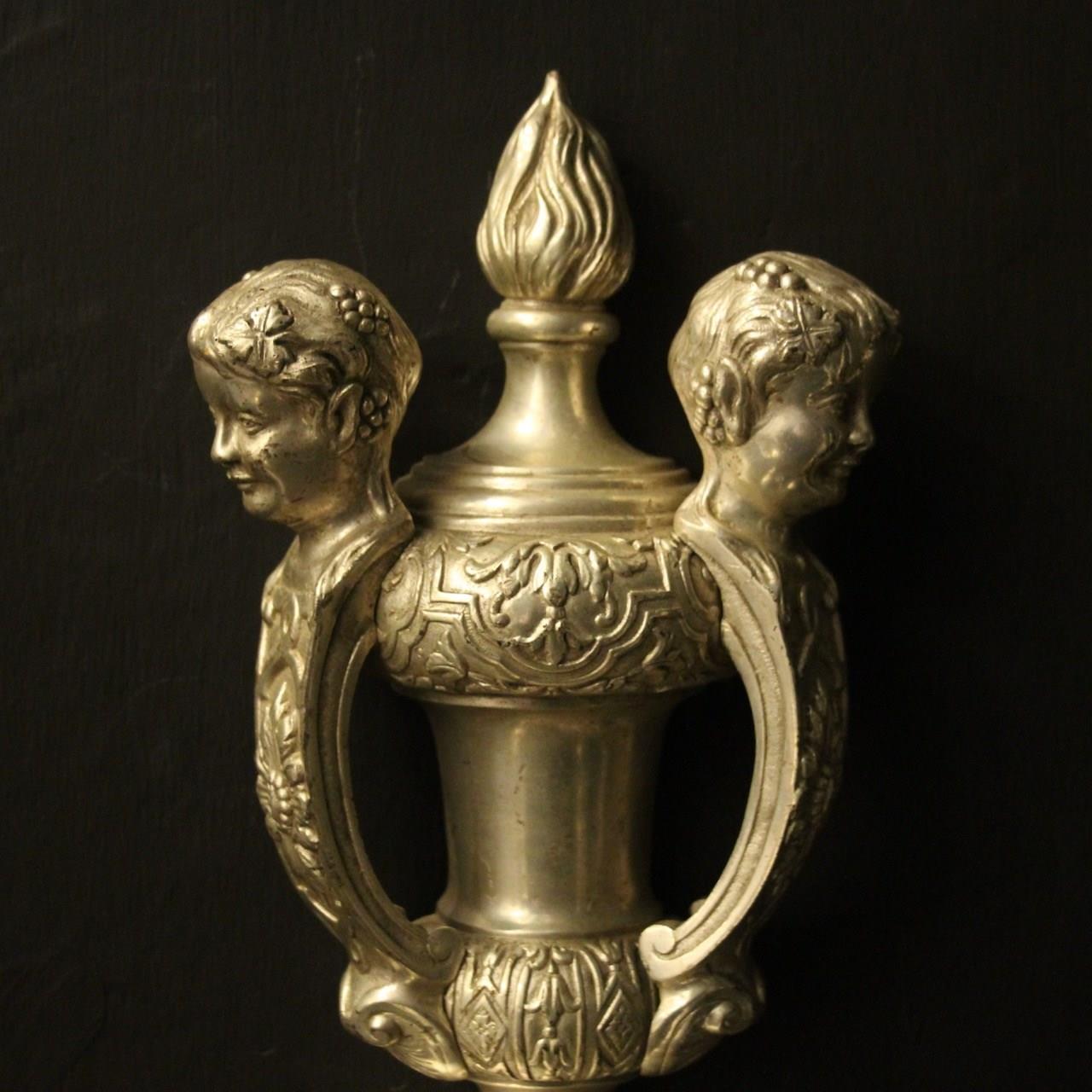 A nice English set of 4 silvered brass twin arm Knole antique wall lights, the square gauge scrolling arms with decoratively etched circular drip pans and etched candle sconces, issuing from an ornate twin mask cherub surmounts, lovely silver patination and very well cast. Fully rewired and PAT tested. All our wall lights come with aged brass screws or brackets for fixing and spare bulbs.