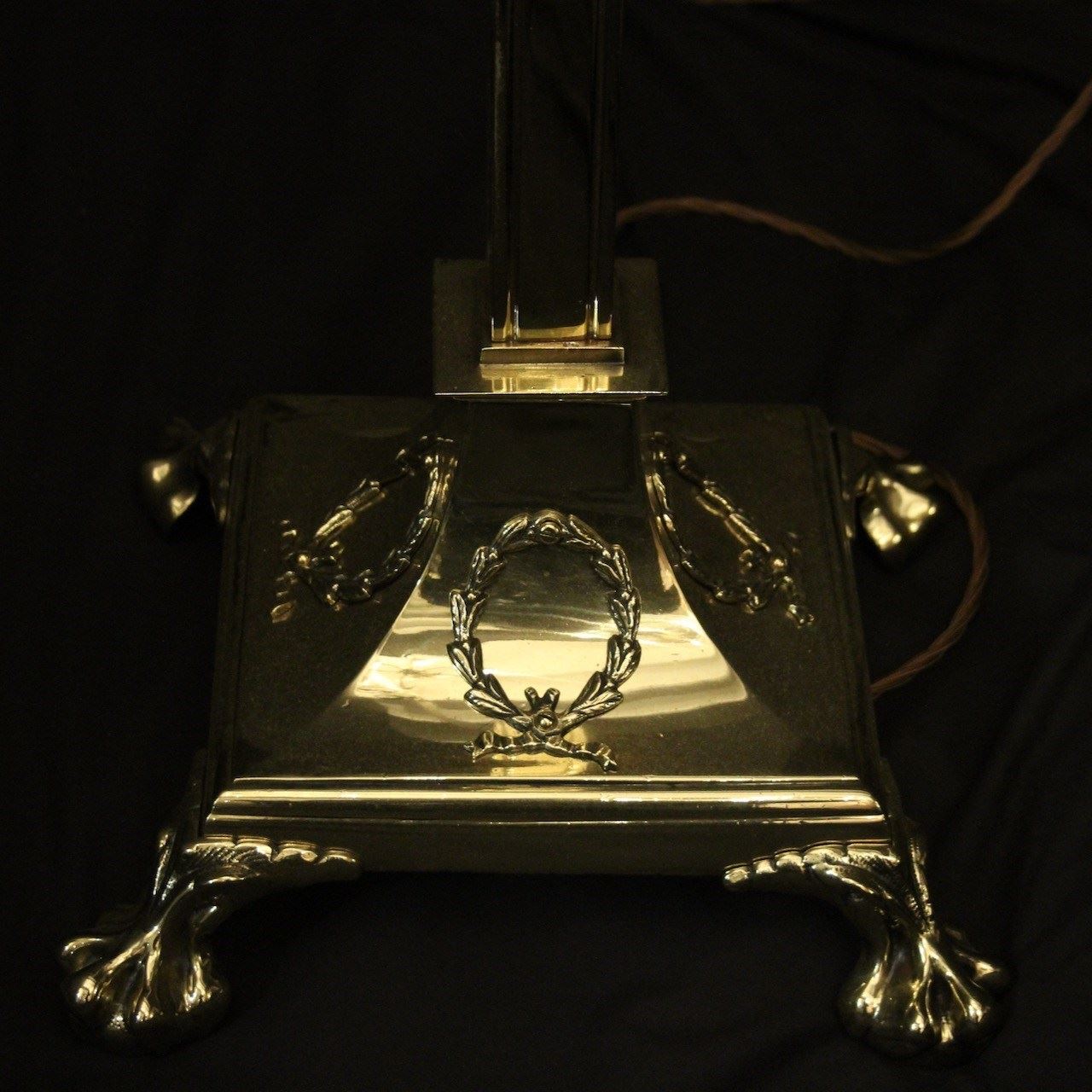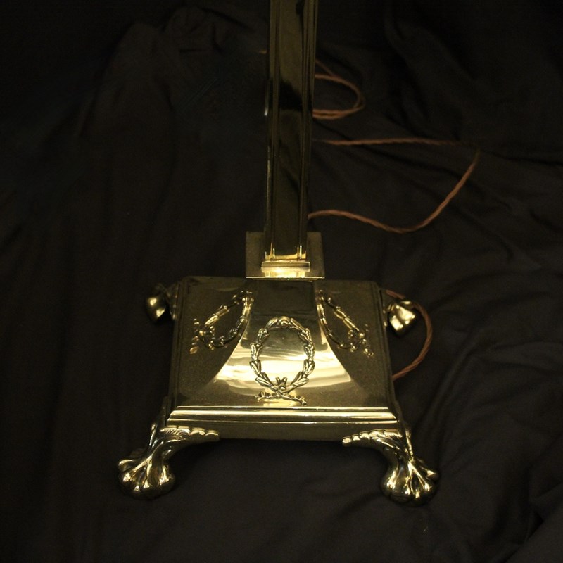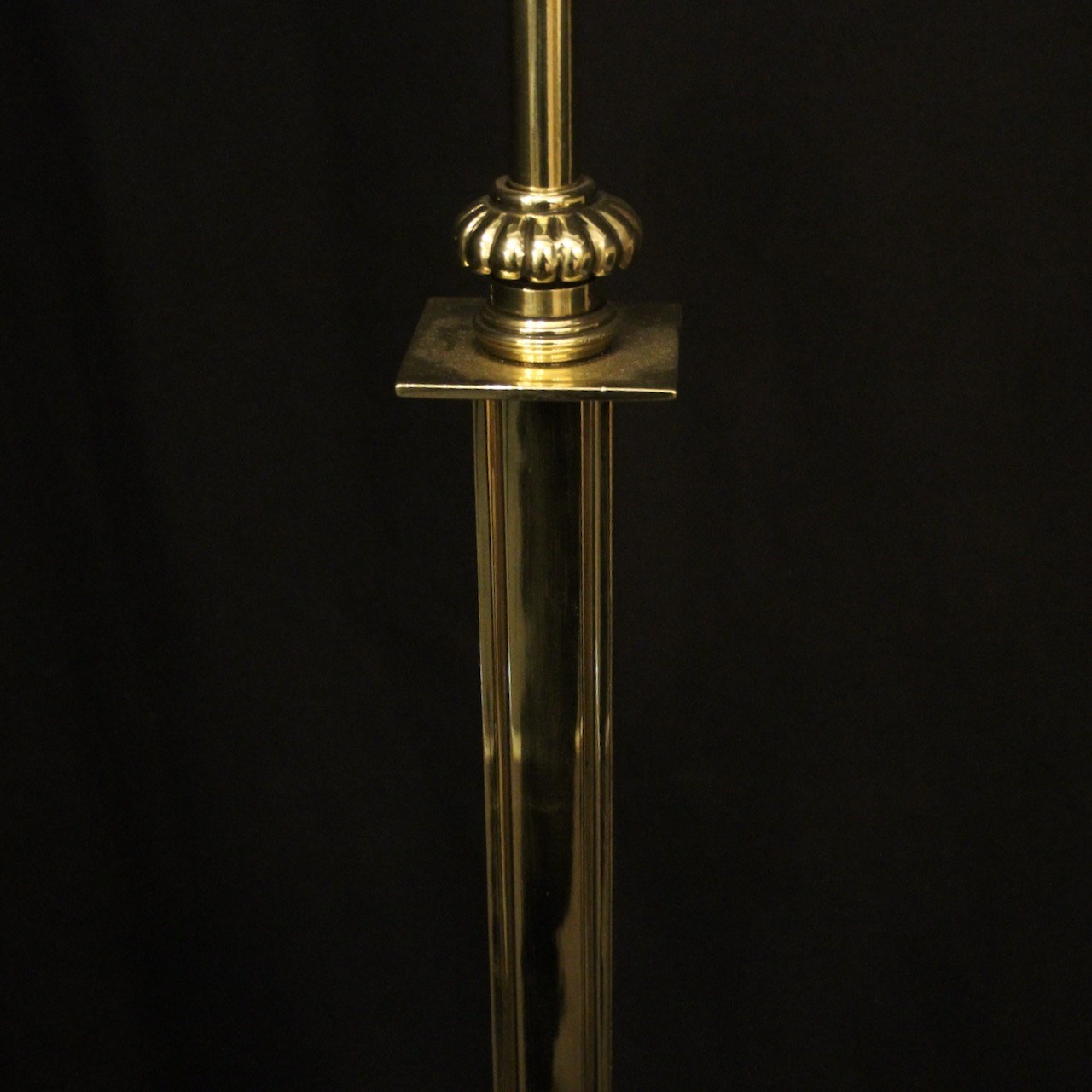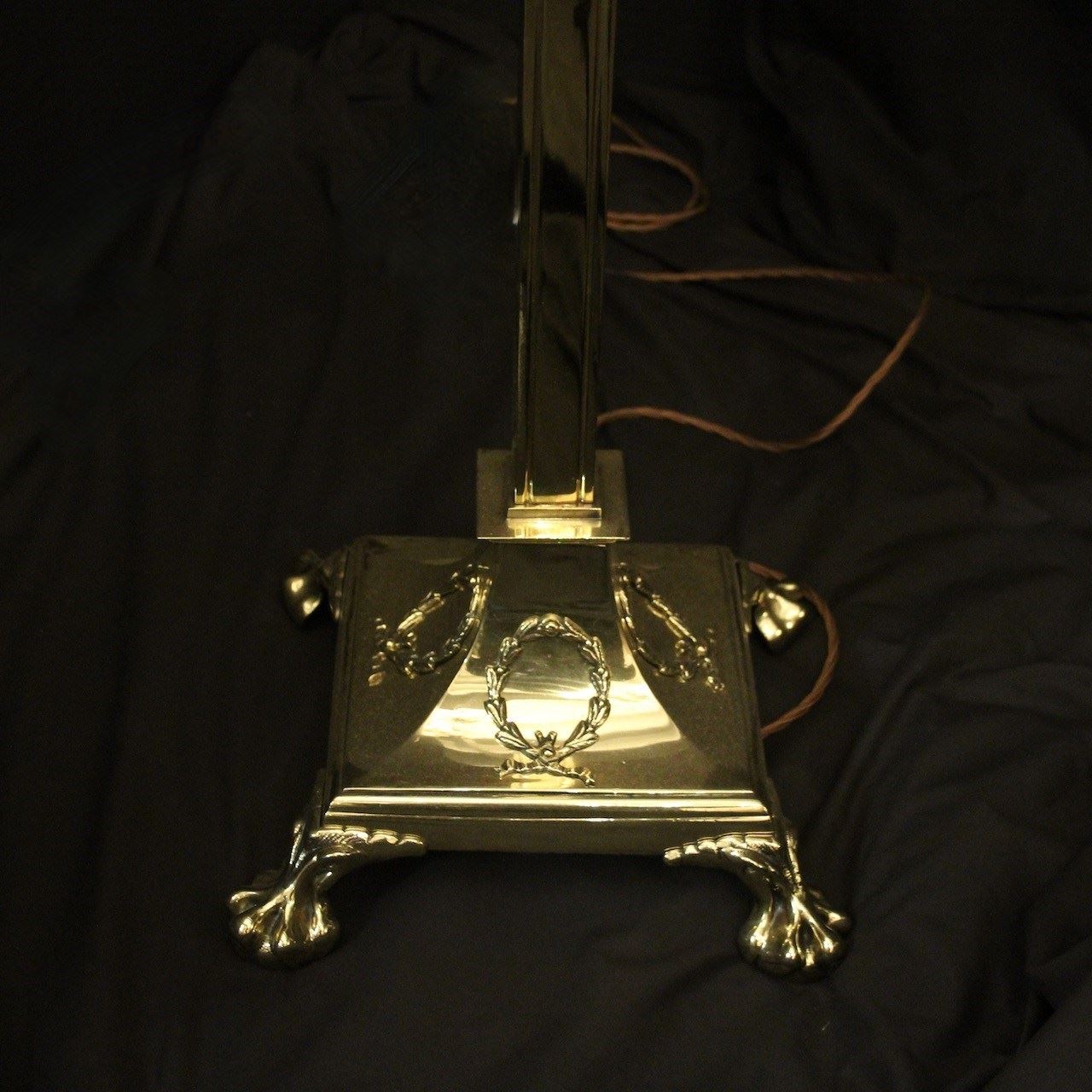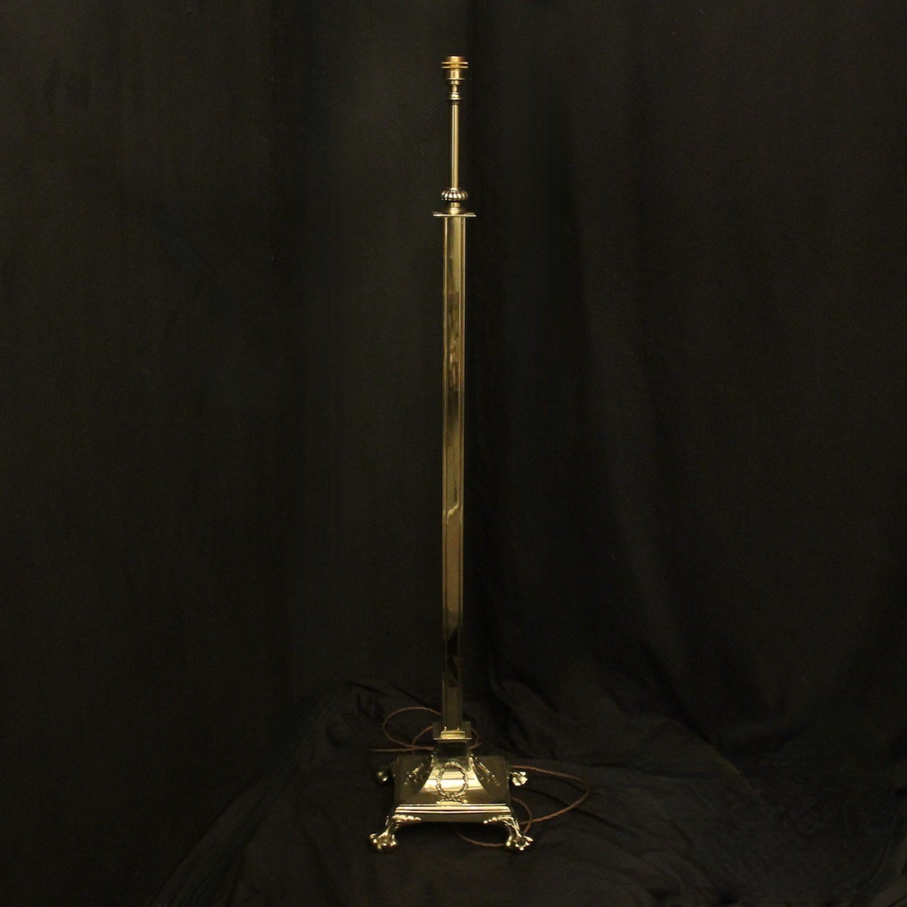 An English repolished cast brass telescopic antique standard lamp, the reeded central holder with upper column extending from 51" to 71". The square gauge column set above an ornately cast scalloped sectional base with decorative laurel wreaths and nice scrolling feet, sympathetically repolished and lacquered. Fully rewired and PAT tested with foot switch.
