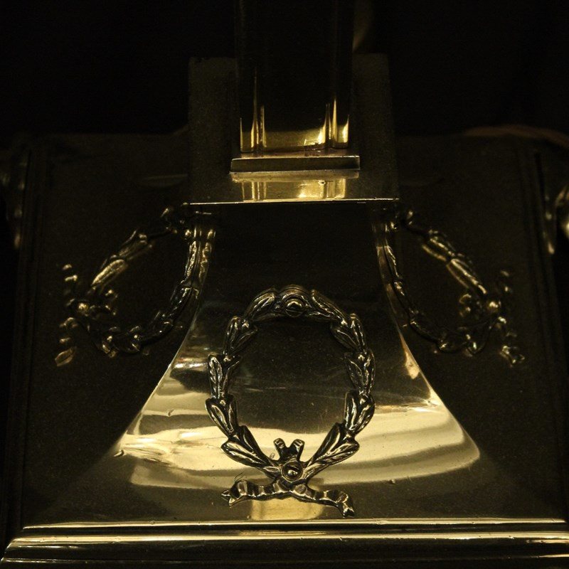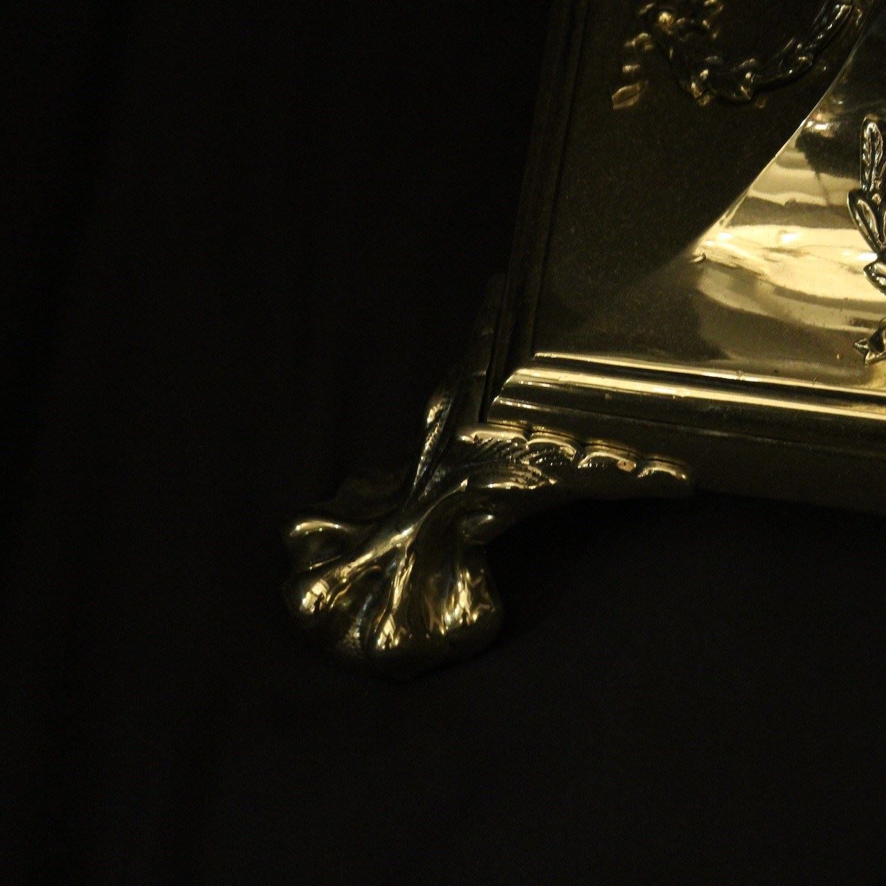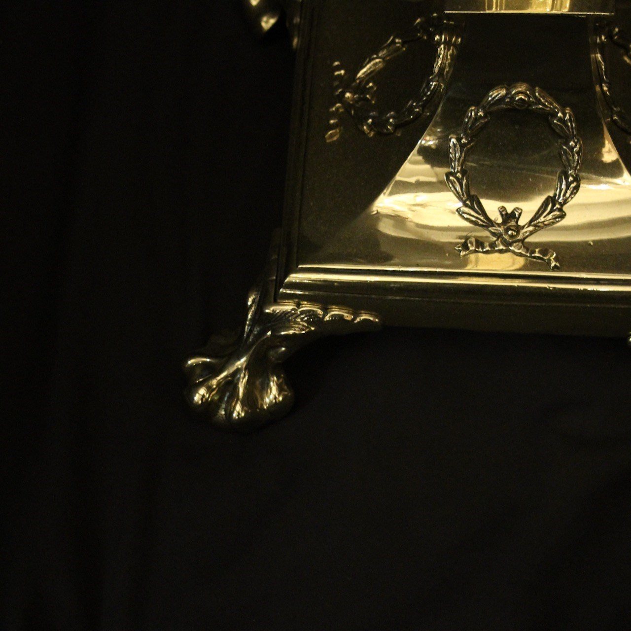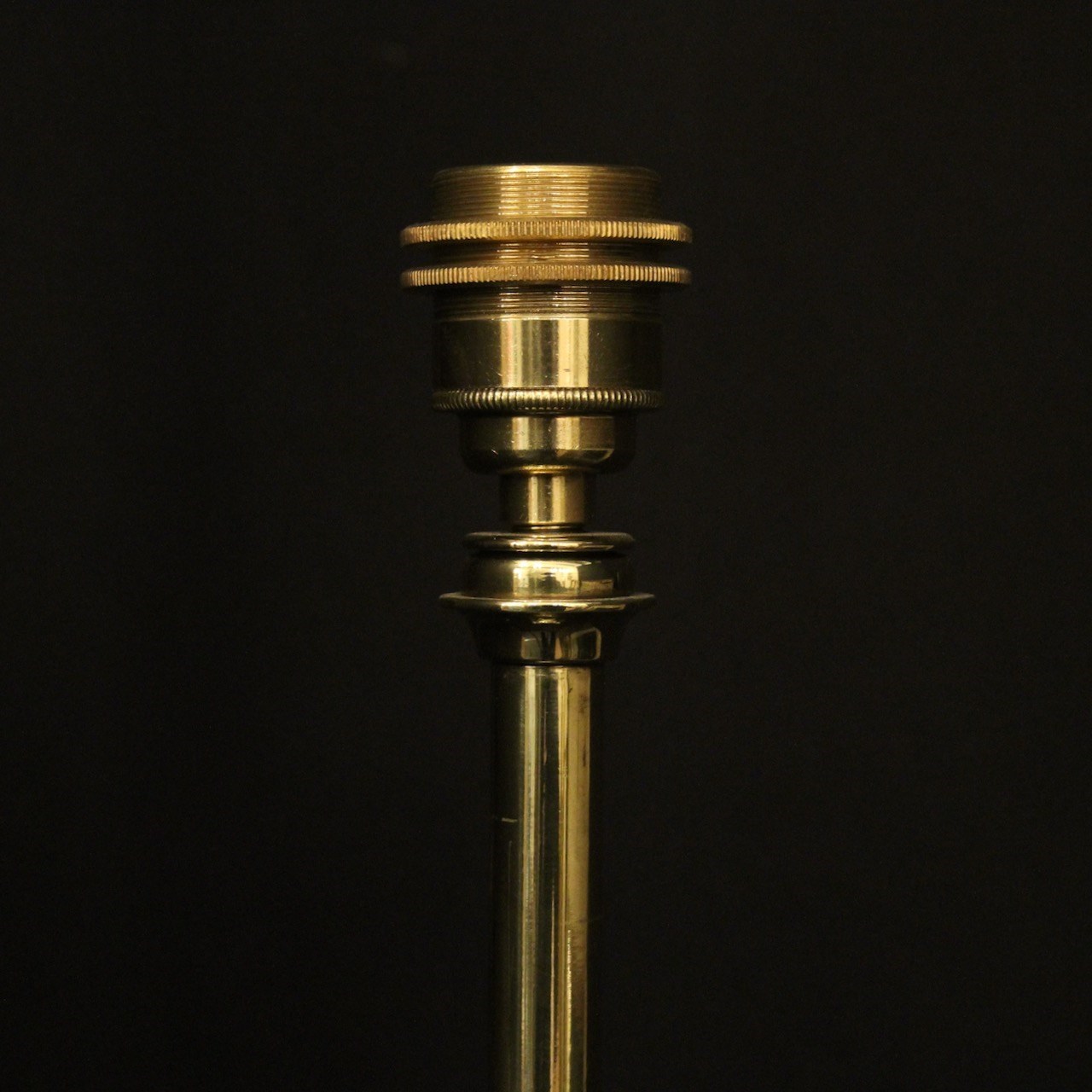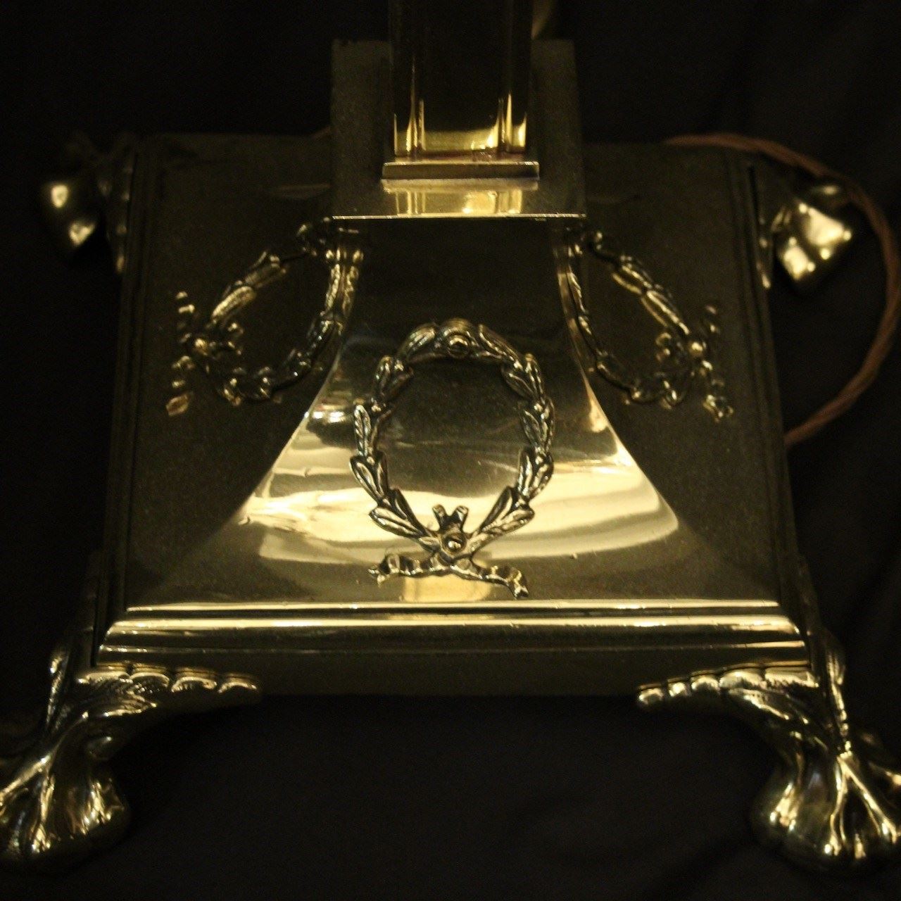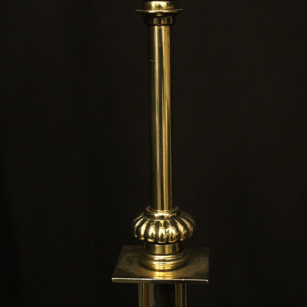 An English repolished cast brass telescopic antique standard lamp, the reeded central holder with upper column extending from 51" to 71". The square gauge column set above an ornately cast scalloped sectional base with decorative laurel wreaths and nice scrolling feet, sympathetically repolished and lacquered. Fully rewired and PAT tested with foot switch.