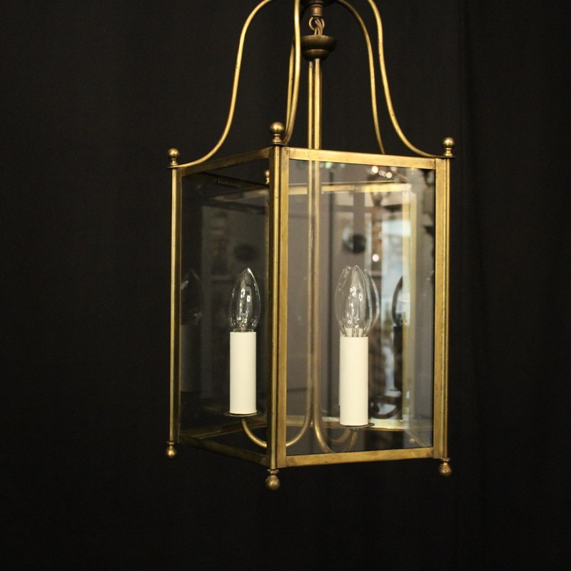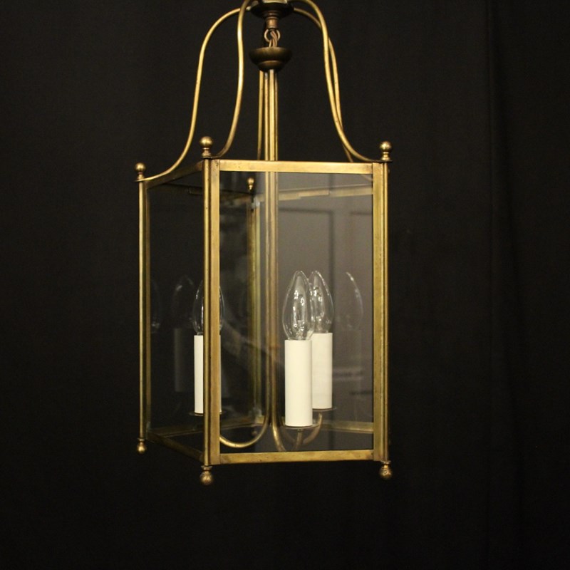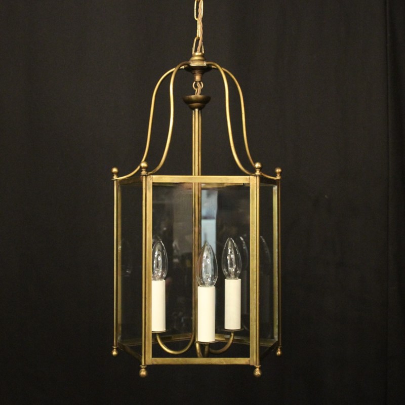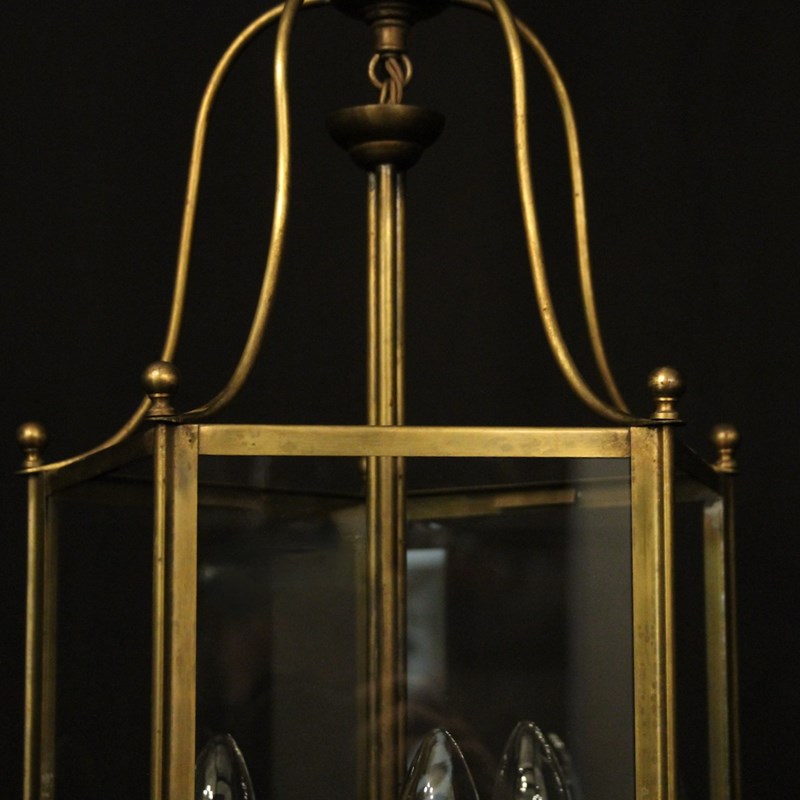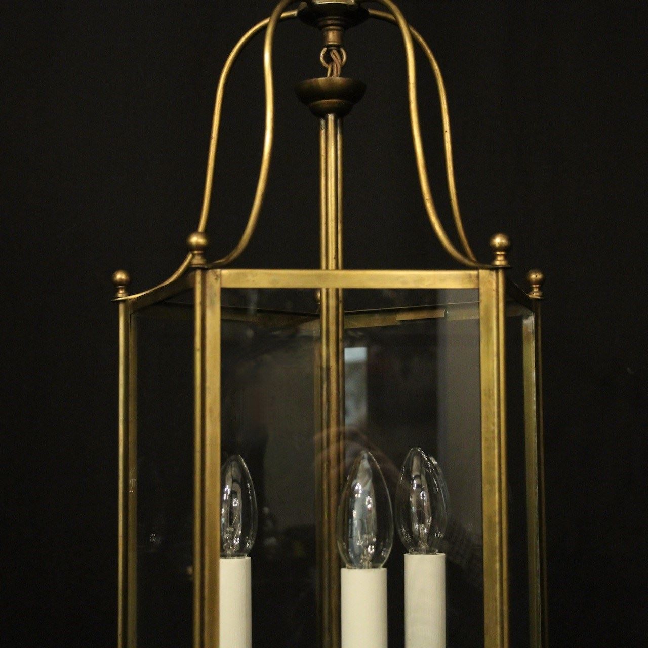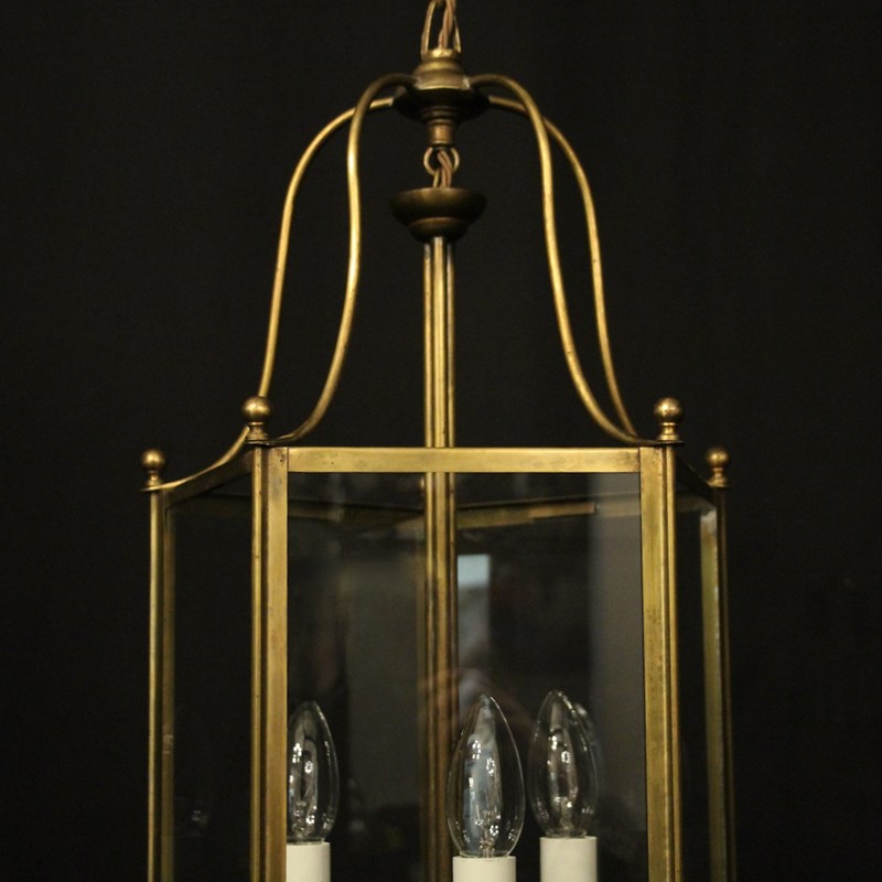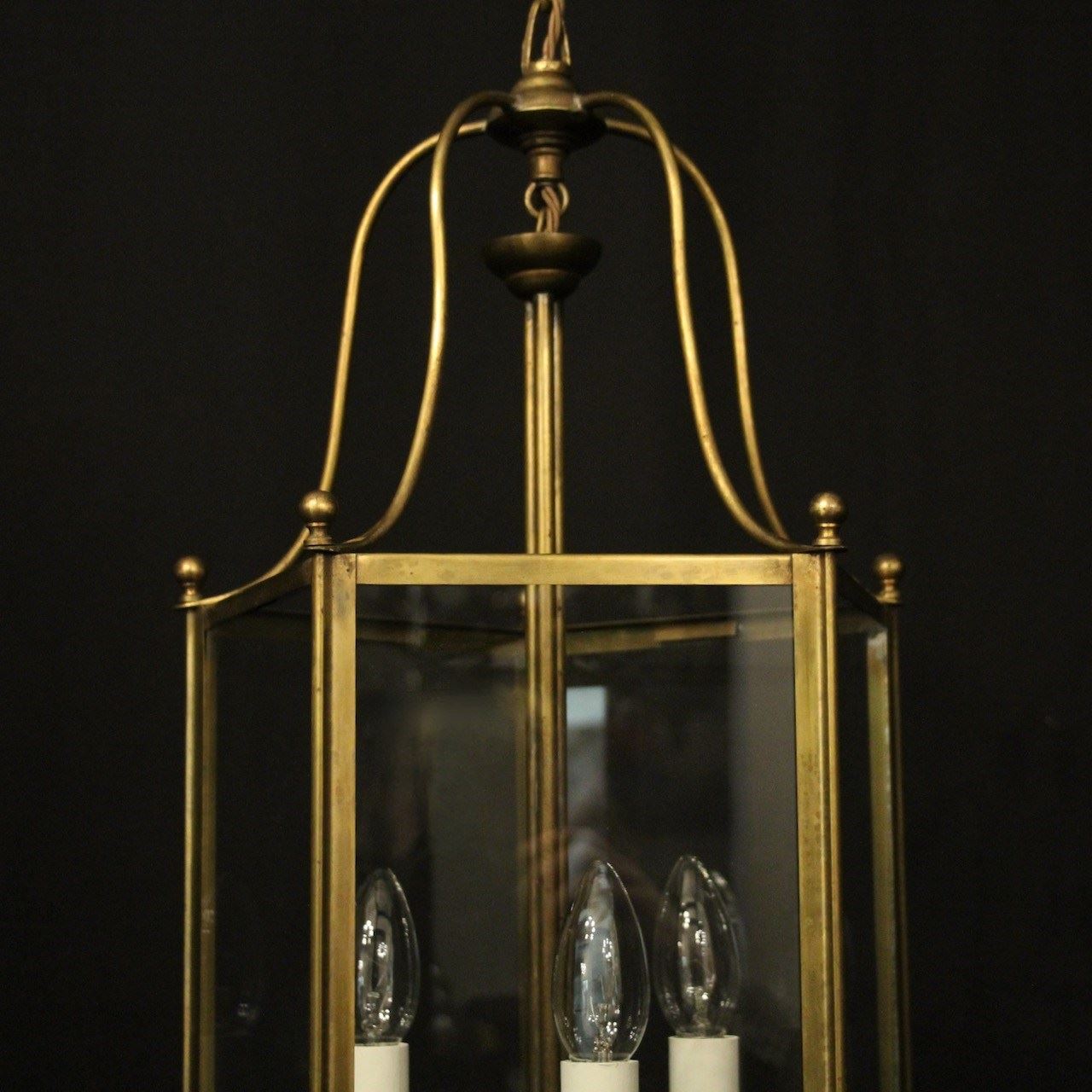An English gilded brass triple light 5 panel hall lantern, the five glass panels held within a simple framework, the central column with three scrolling light fittings with circular bobeche drip pans and scrolling canopy with decorative ball finials, having the original chain and ceiling rose. Fully rewired and PAT tested. All our lanterns come with bulbs and ceiling fixings.Dimensions: H: 22"/56cm W: 11"/28cm Excluding Chain & RoseCirca: Mid 20th CenturyProduct Ref: OKA05541