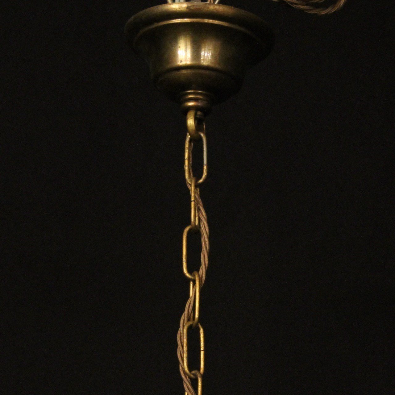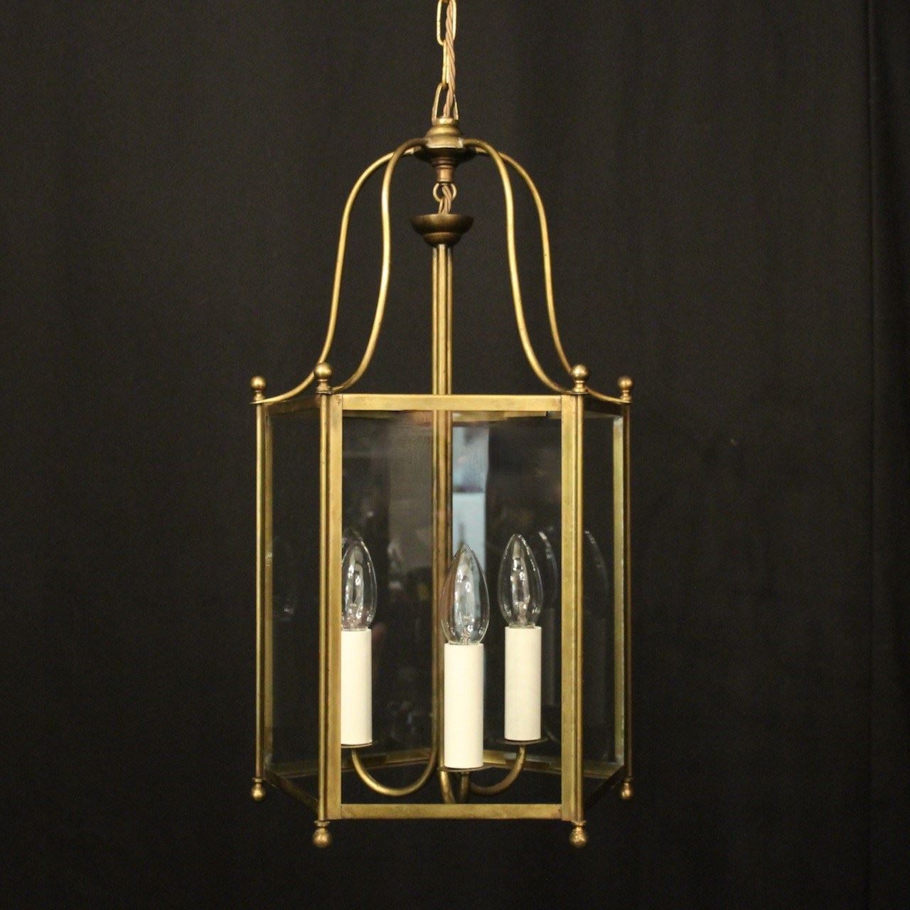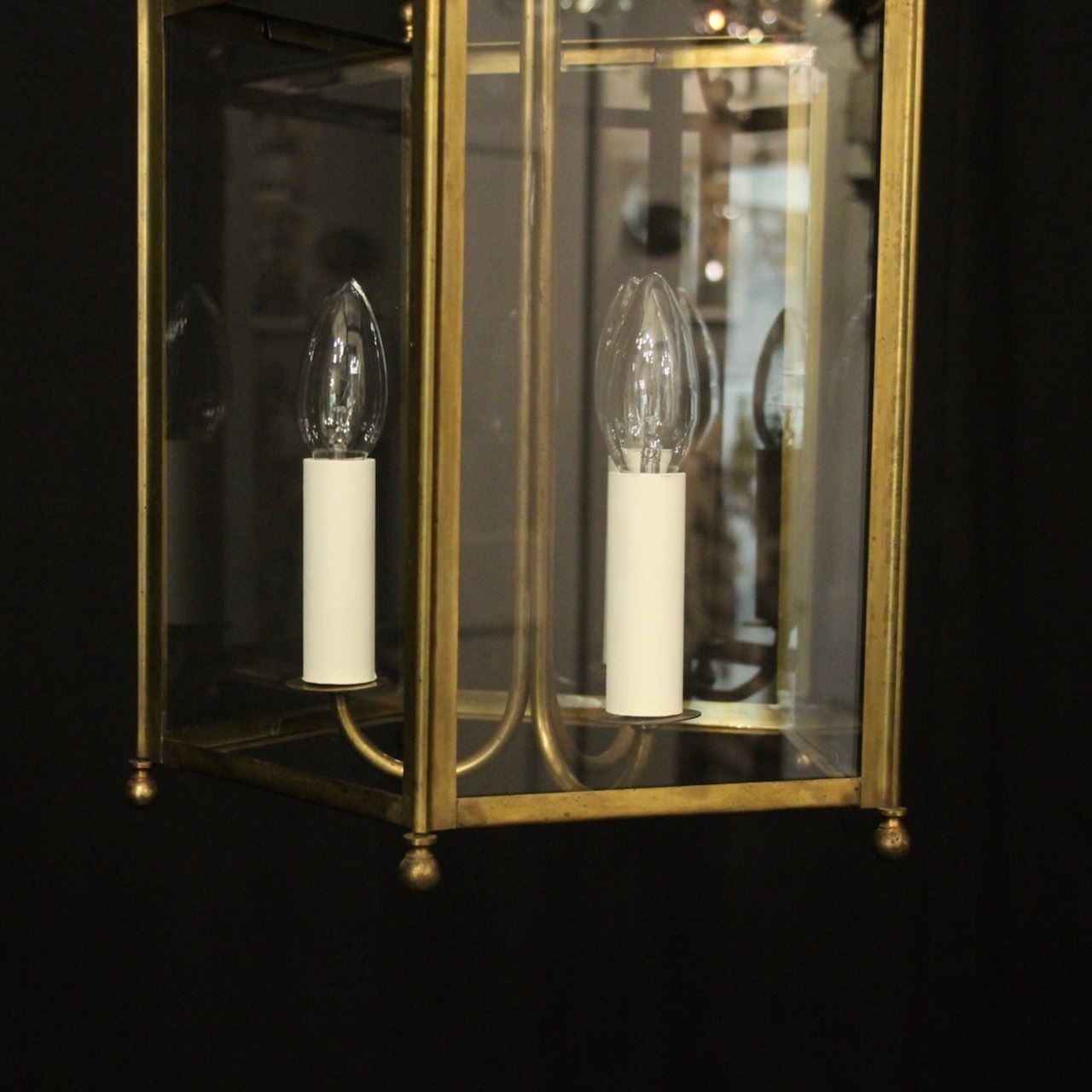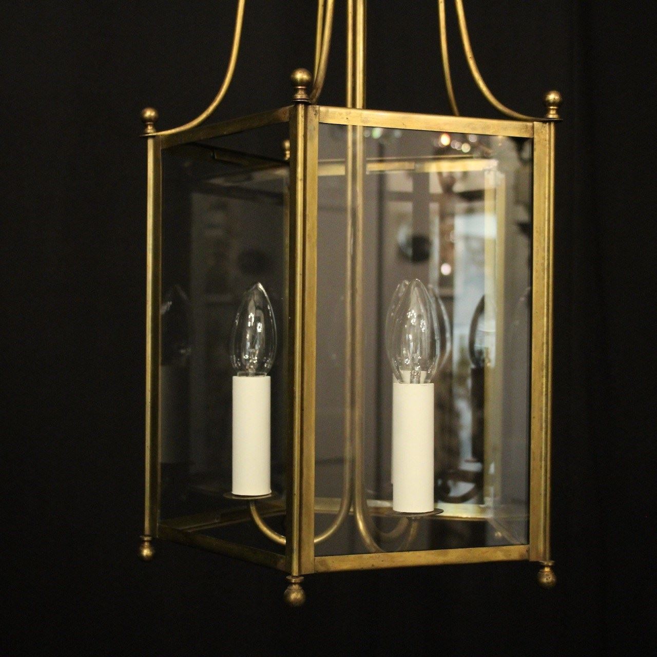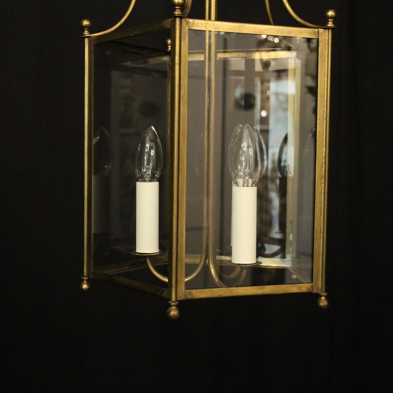 An English gilded brass triple light 5 panel hall lantern, the five glass panels held within a simple framework, the central column with three scrolling light fittings with circular bobeche drip pans and scrolling canopy with decorative ball finials, having the original chain and ceiling rose. Fully rewired and PAT tested. All our lanterns come with bulbs and ceiling fixings.Dimensions: H: 22"/56cm W: 11"/28cm Excluding Chain & RoseCirca: Mid 20th CenturyProduct Ref: OKA05541