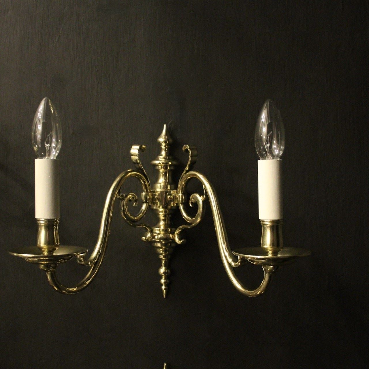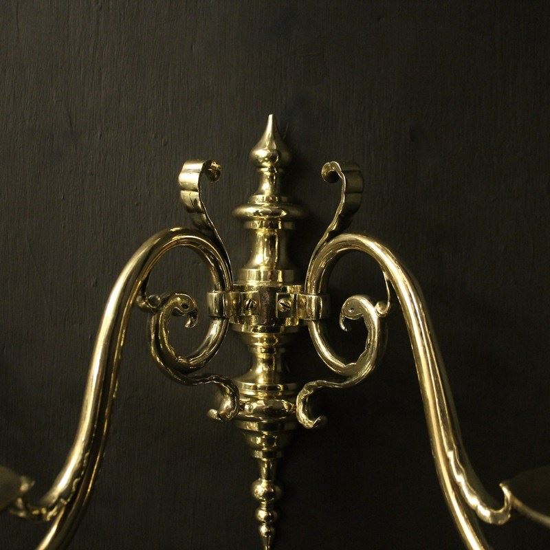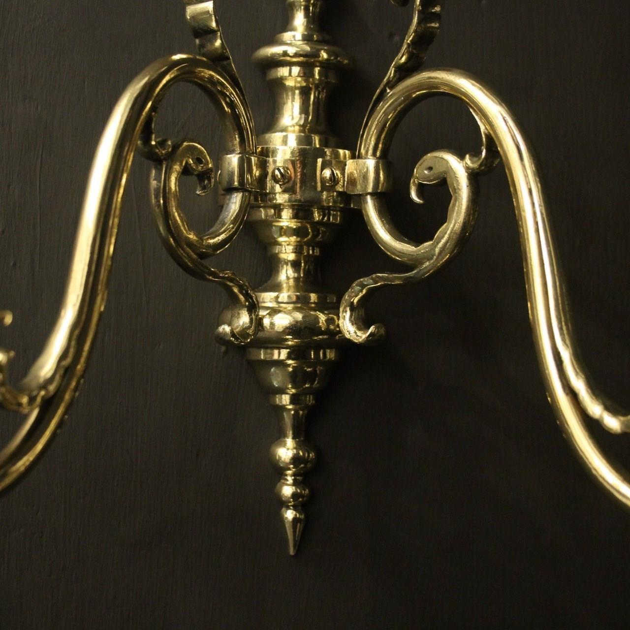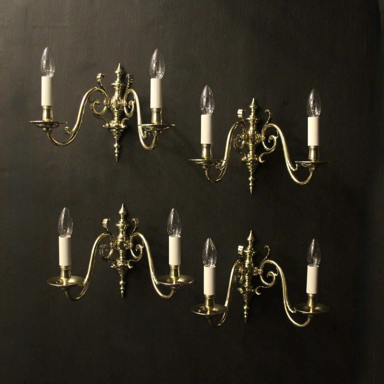 A Flemish set of 4 repolished brass twin arm antique wall lights, the scrolling arms with circular bobeche drip pans and bulbous candle sconces, issuing from a knopped backplate with half round spiked finial and terminal, sympathetically repolished and lacquered. Fully rewired and PAT tested. All our wall lights come with aged brass screws for fixing and spare bulbs.