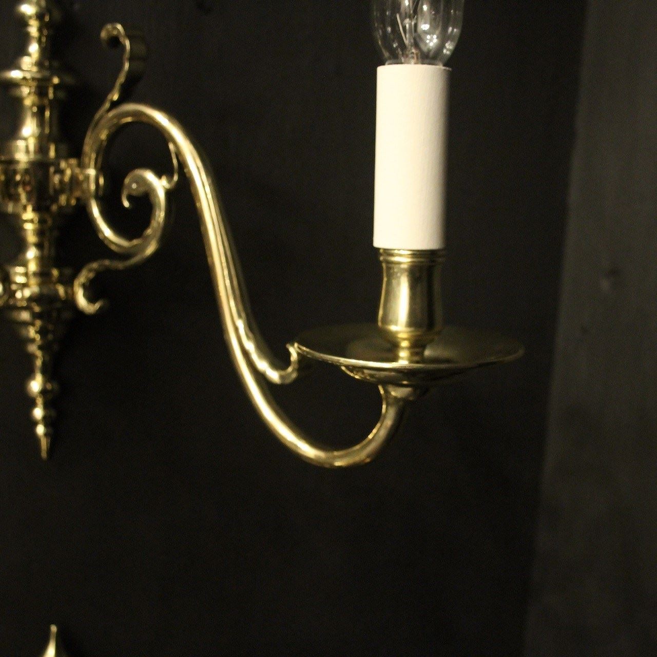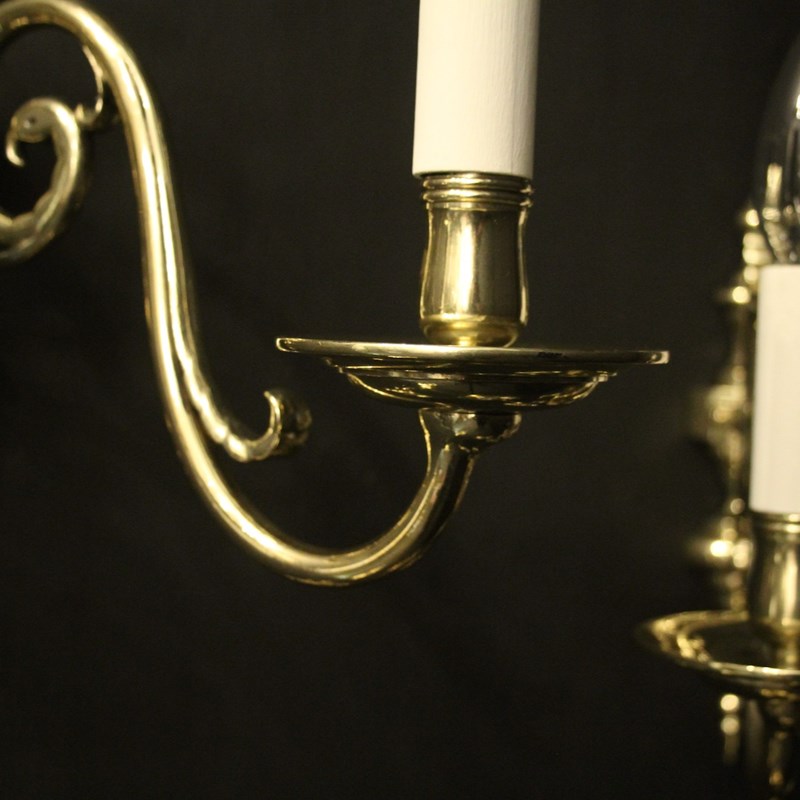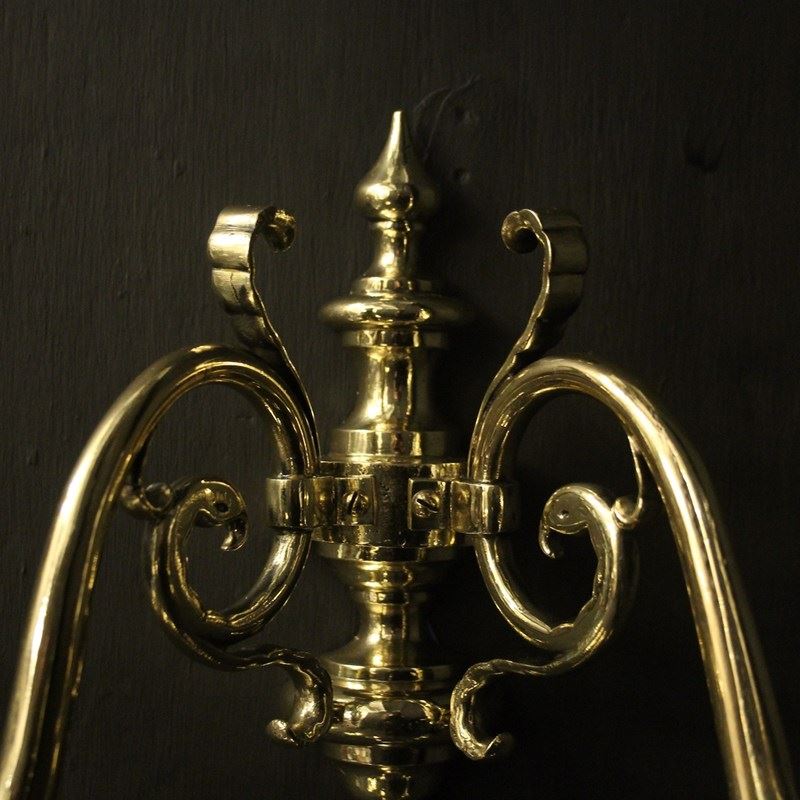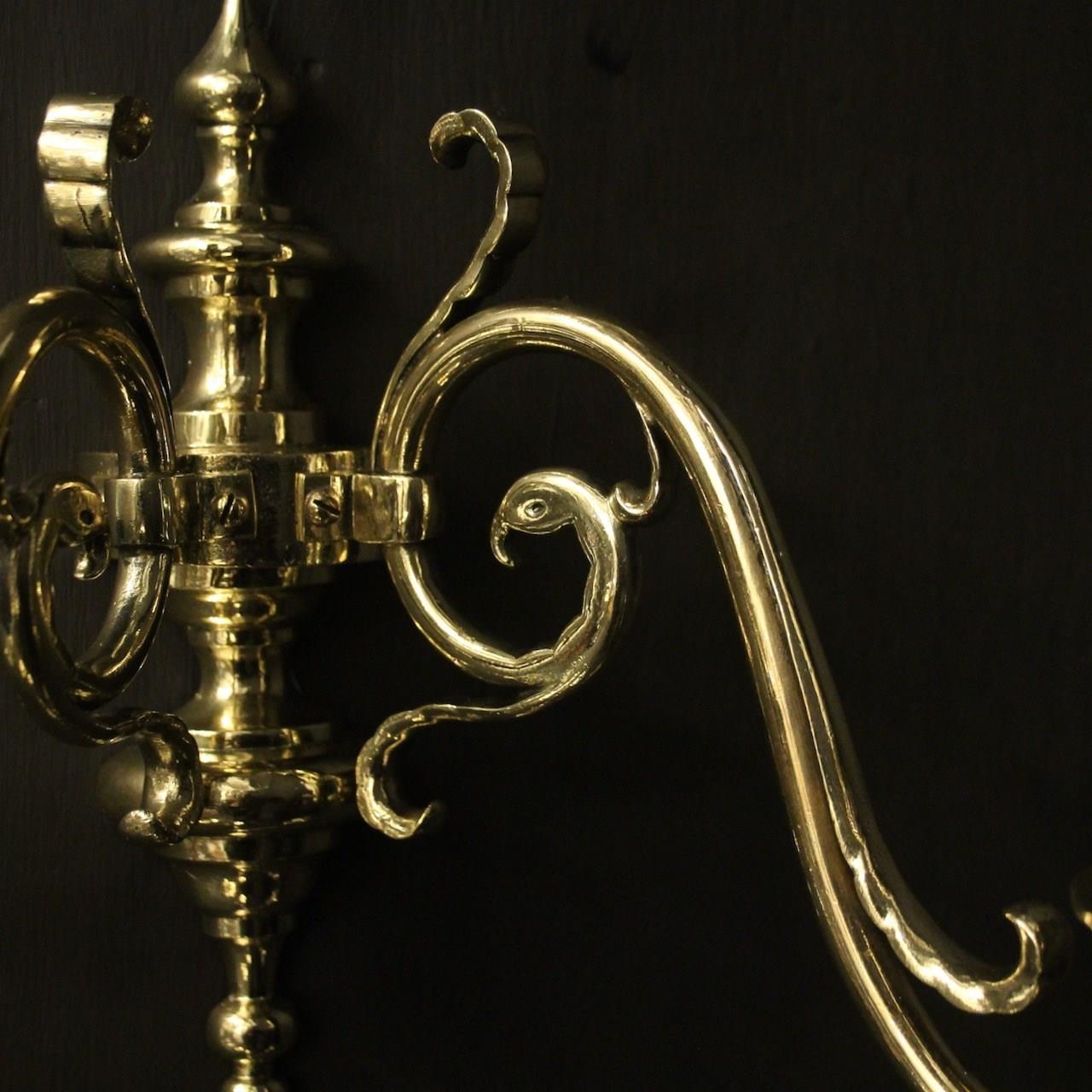 A Flemish set of 4 repolished brass twin arm antique wall lights, the scrolling arms with circular bobeche drip pans and bulbous candle sconces, issuing from a knopped backplate with half round spiked finial and terminal, sympathetically repolished and lacquered. Fully rewired and PAT tested. All our wall lights come with aged brass screws for fixing and spare bulbs.