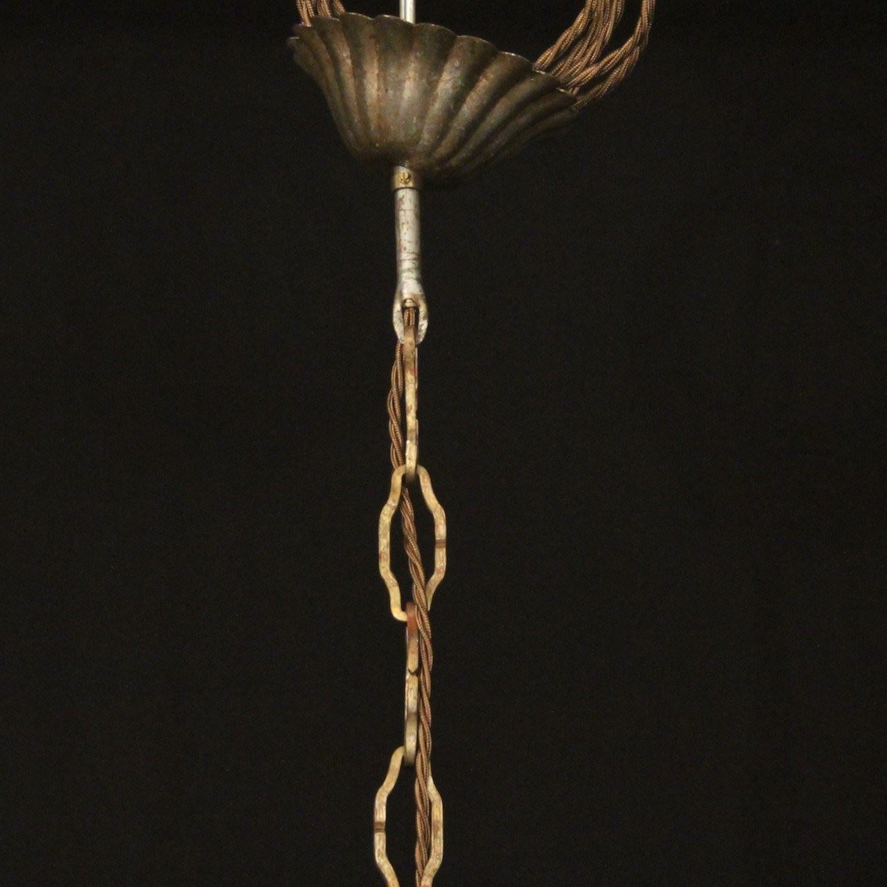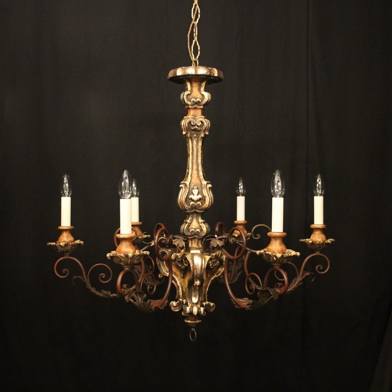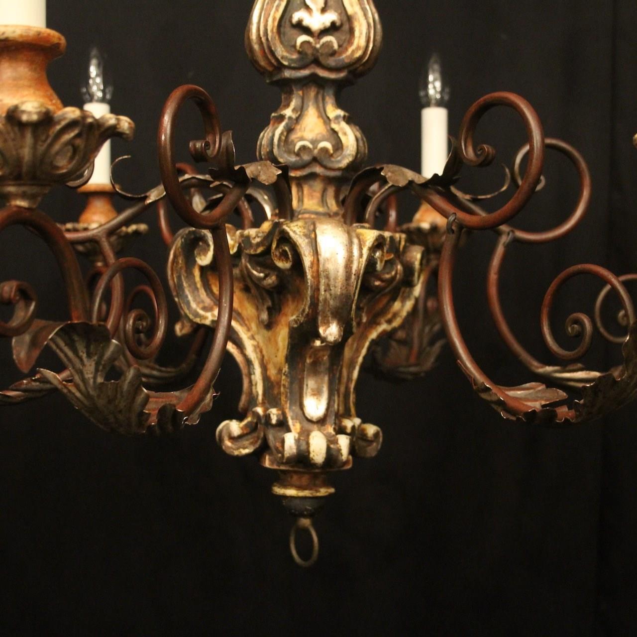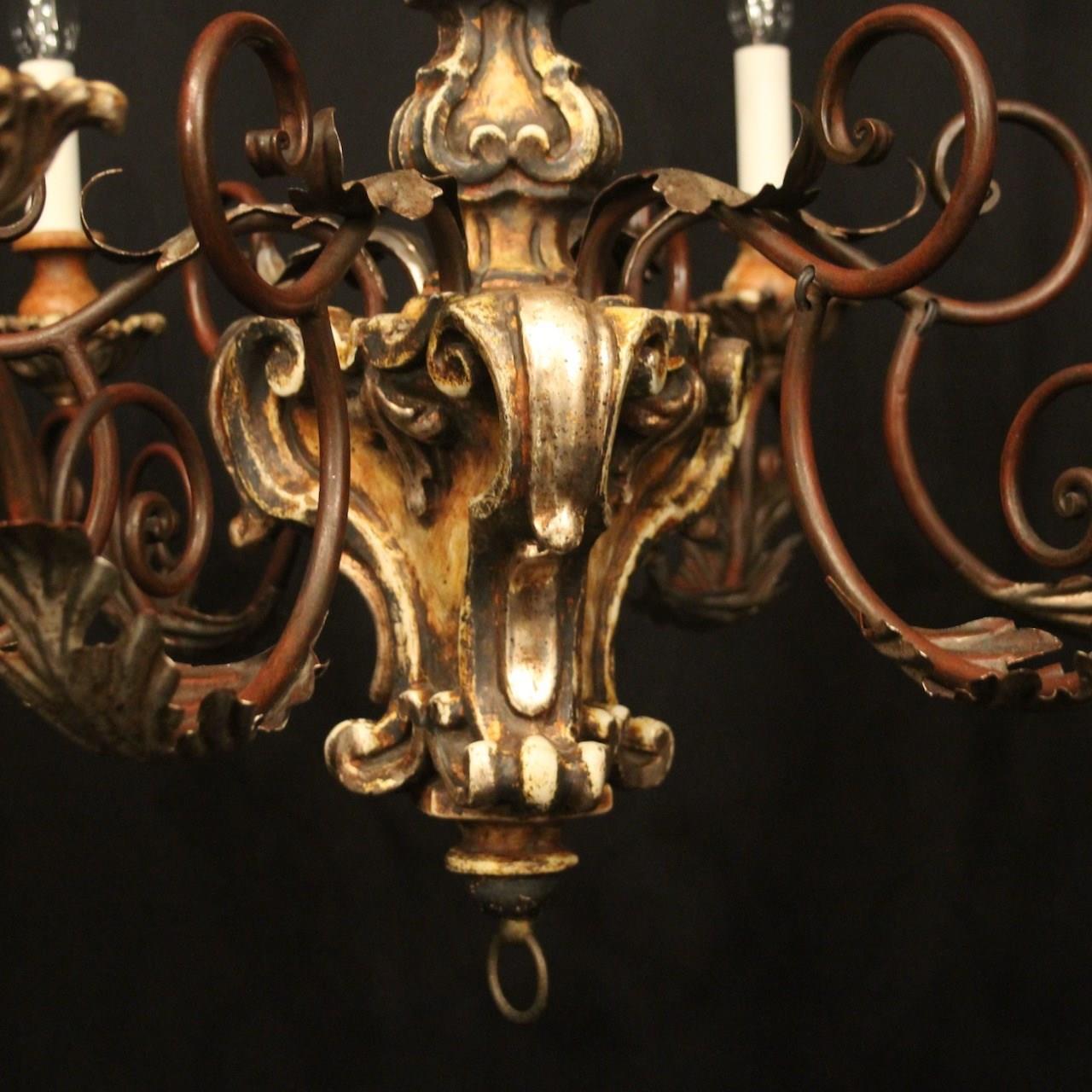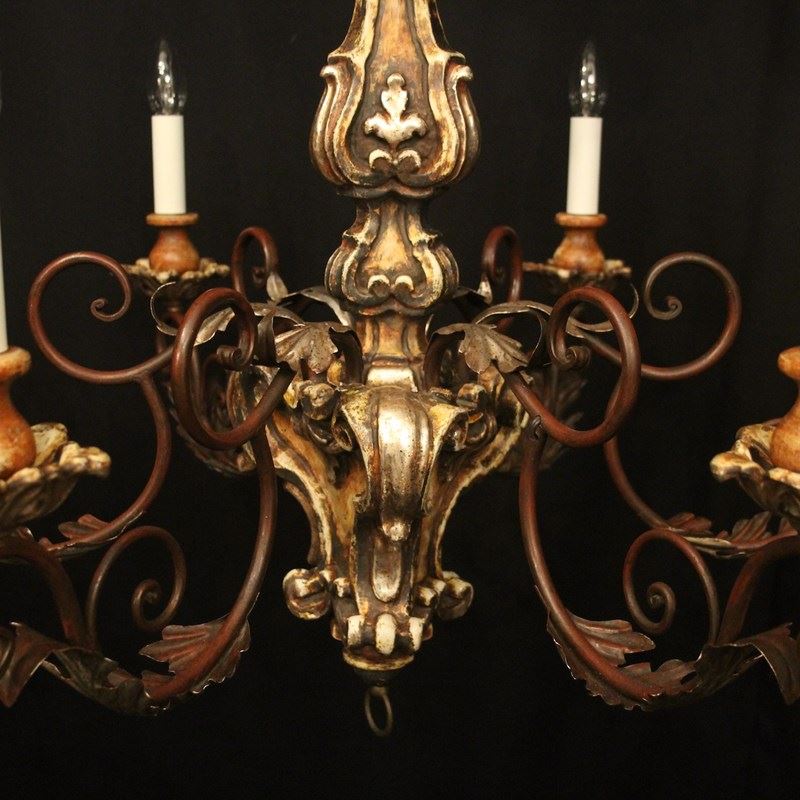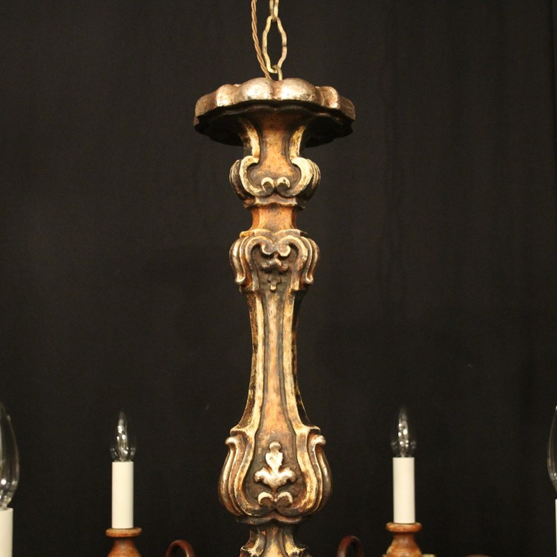 A lovely Italian Florentine carved wooden silver gilded polychrome 6 light antique chandelier, the Acanthus toleware leaf scrolling arms with carved pierced wooden bobeche drip pans and bulbous candle sconces, issuing from an elaborate baluster central column with leaf decorative embellishments, having the original chain and ceiling rose, nice patination with original colouration and good scale. Fully rewired and PAT tested. All our chandeliers come with ceiling fixings and spare bulbs.