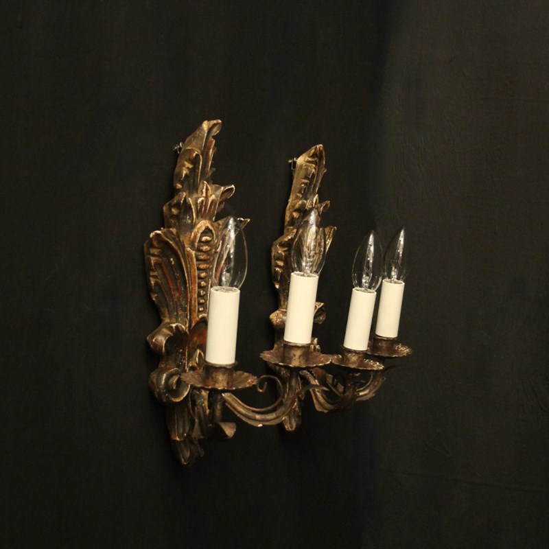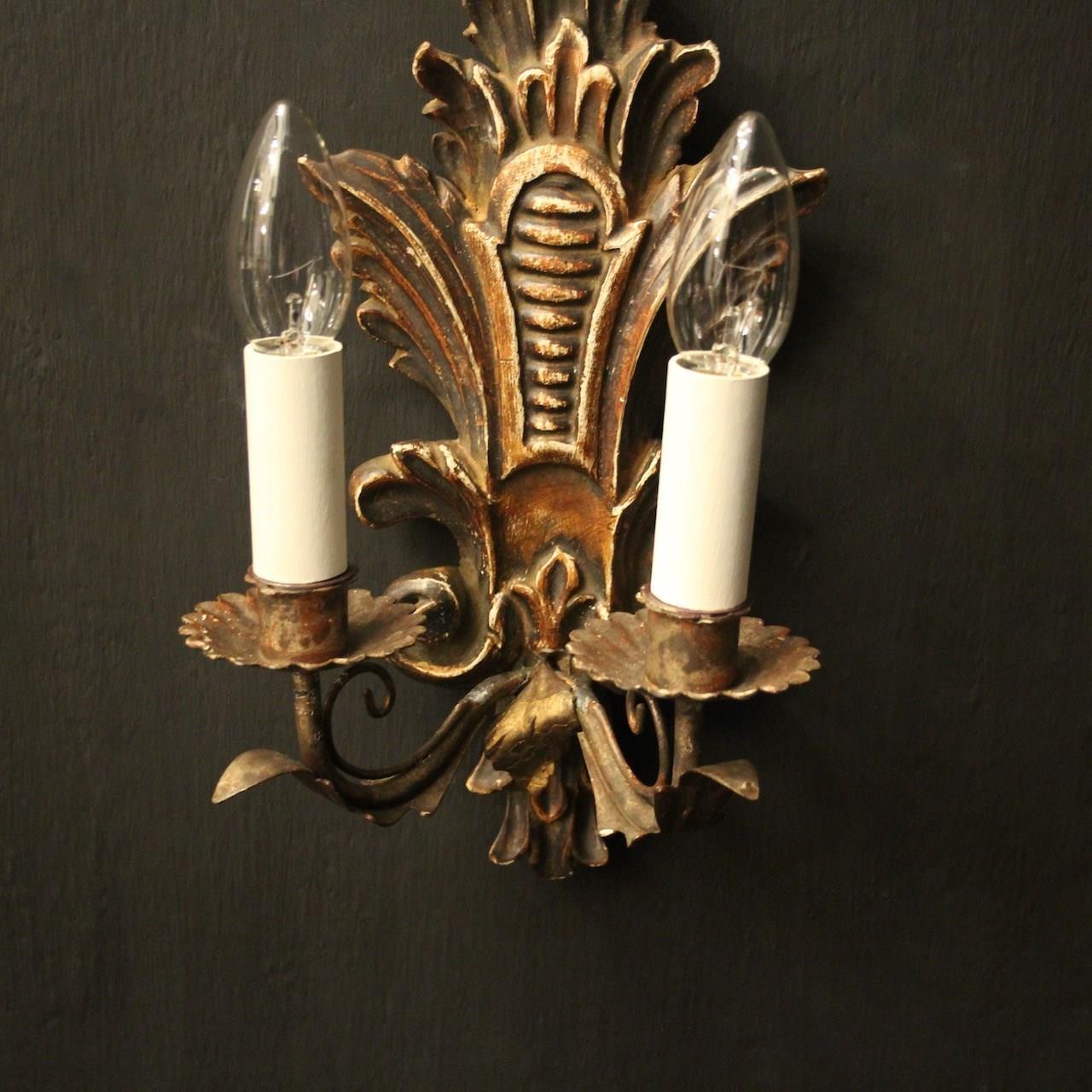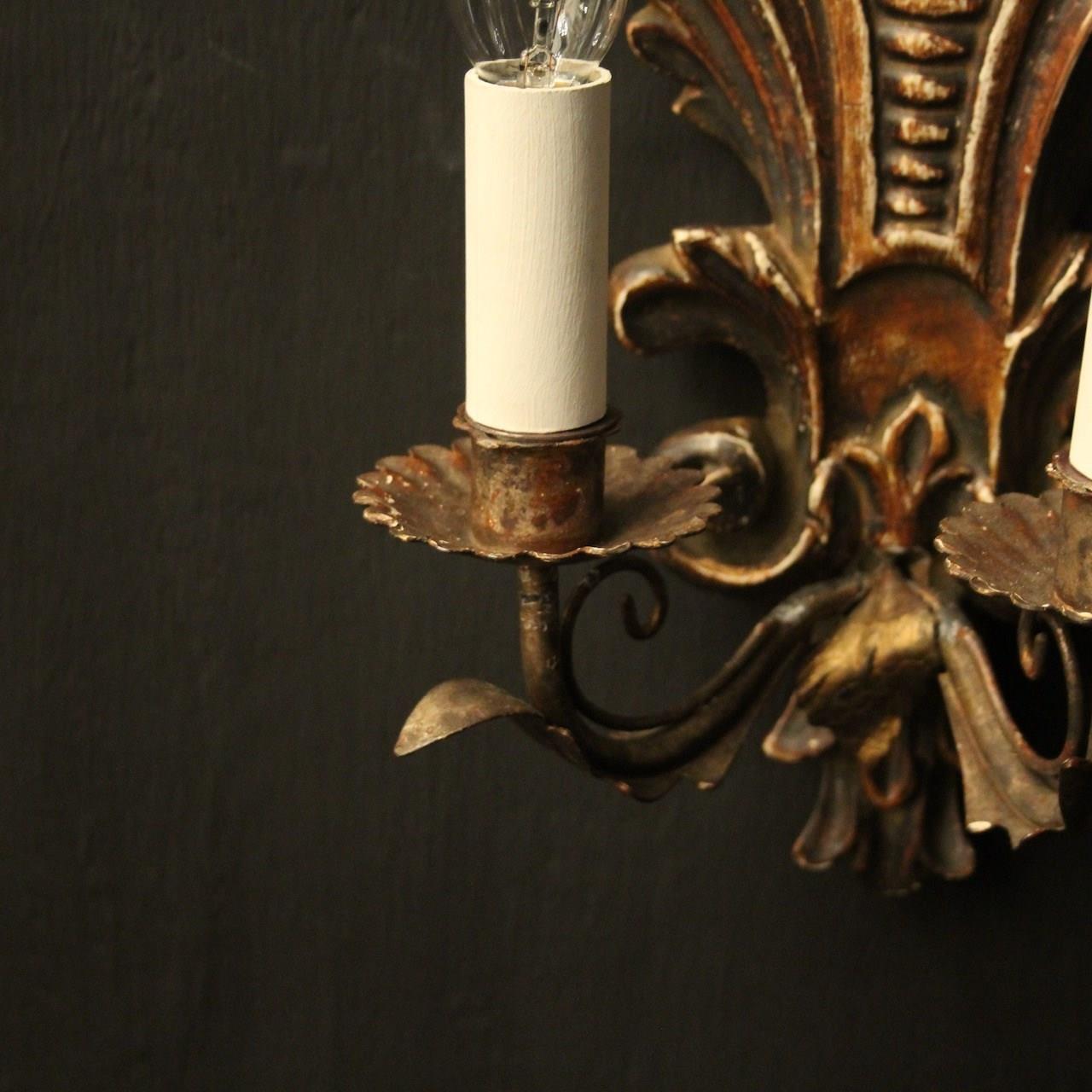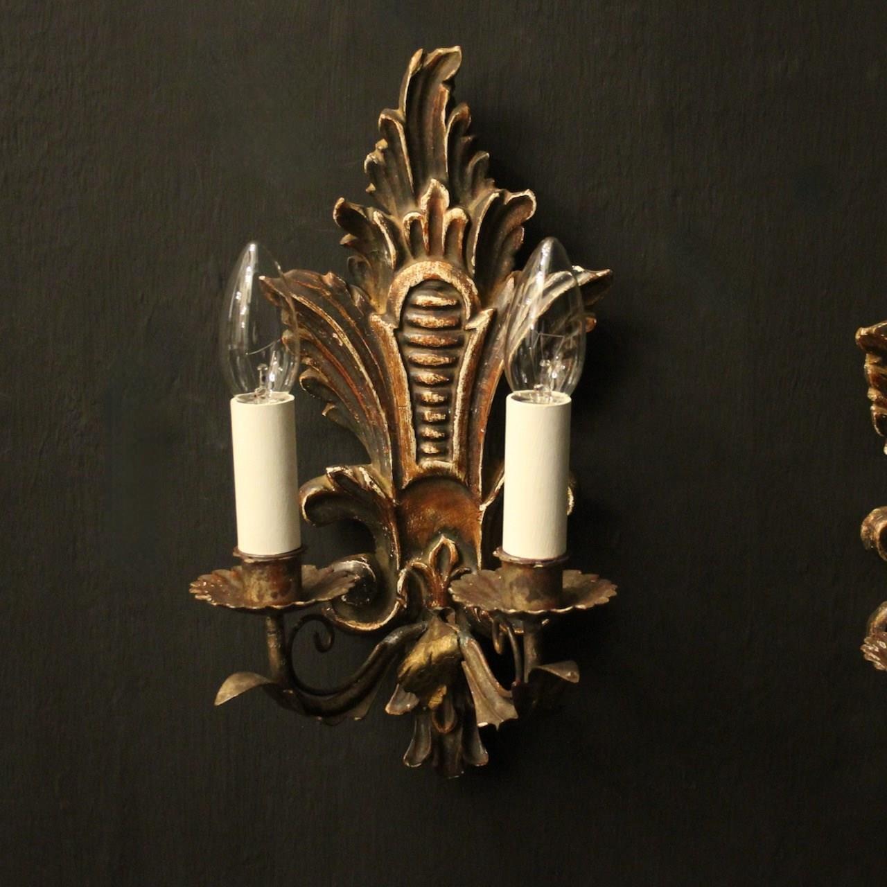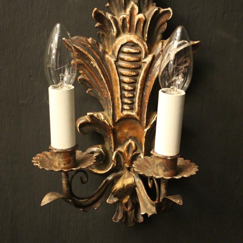 An Italian Florentine carved giltwood and Toleware twin arm antique wall lights, the toleware leaf scrolling arms with circular bobeche drip pans and candle sconces, issuing from an ornate Cartouche shaped wooden backplate, nice and decorative with lovely original faded gilded patination. Fully rewired and PAT tested. All our wall lights come with aged brass screws or brackets for fixing and spare bulbs.