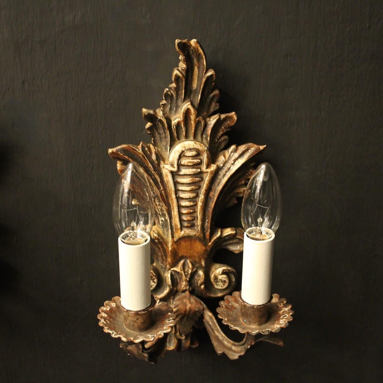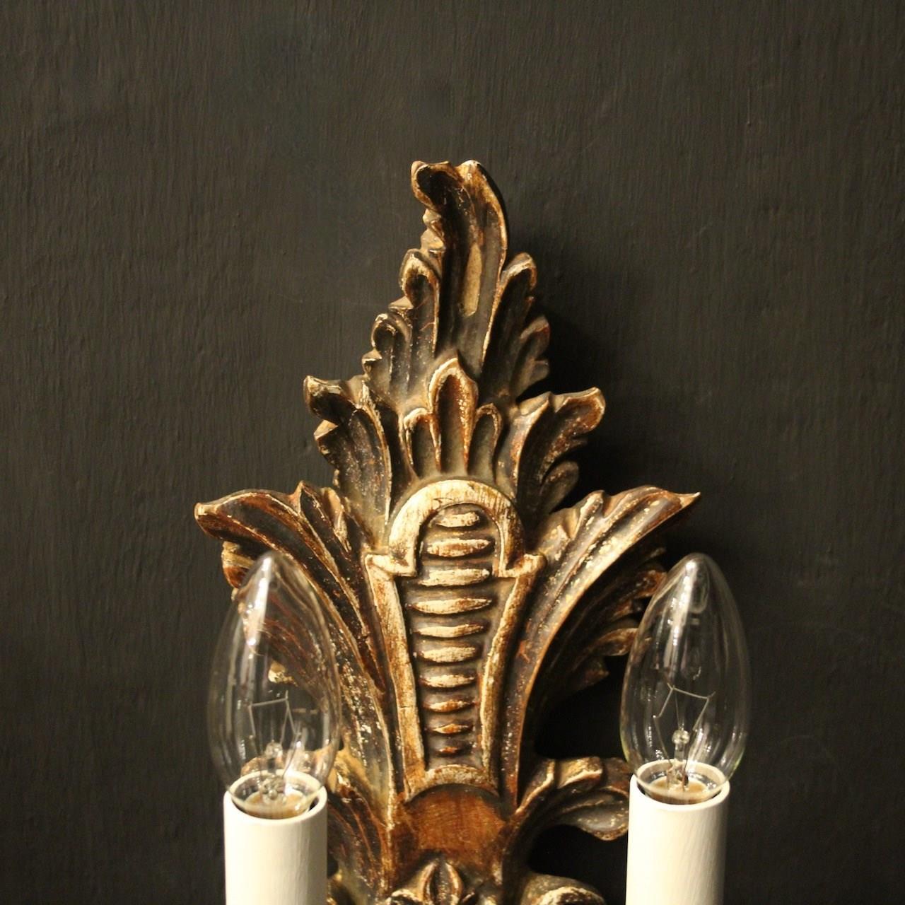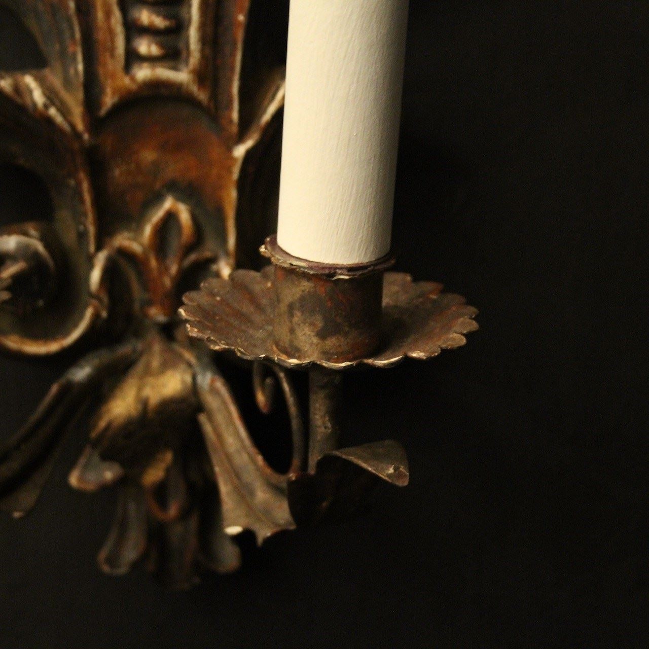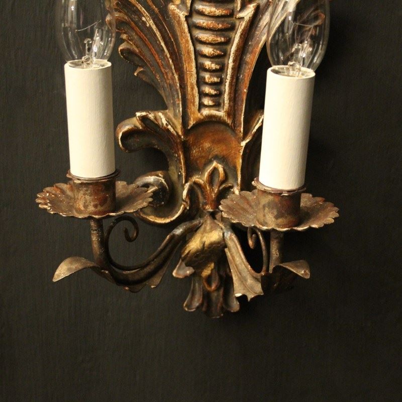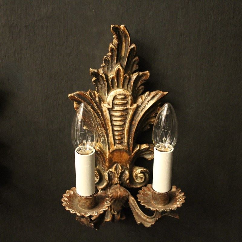 An Italian Florentine carved giltwood and Toleware twin arm antique wall lights, the toleware leaf scrolling arms with circular bobeche drip pans and candle sconces, issuing from an ornate Cartouche shaped wooden backplate, nice and decorative with lovely original faded gilded patination. Fully rewired and PAT tested. All our wall lights come with aged brass screws or brackets for fixing and spare bulbs.