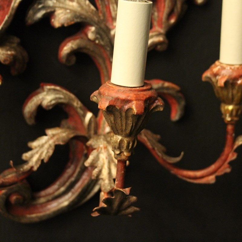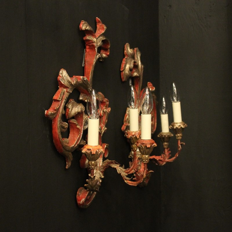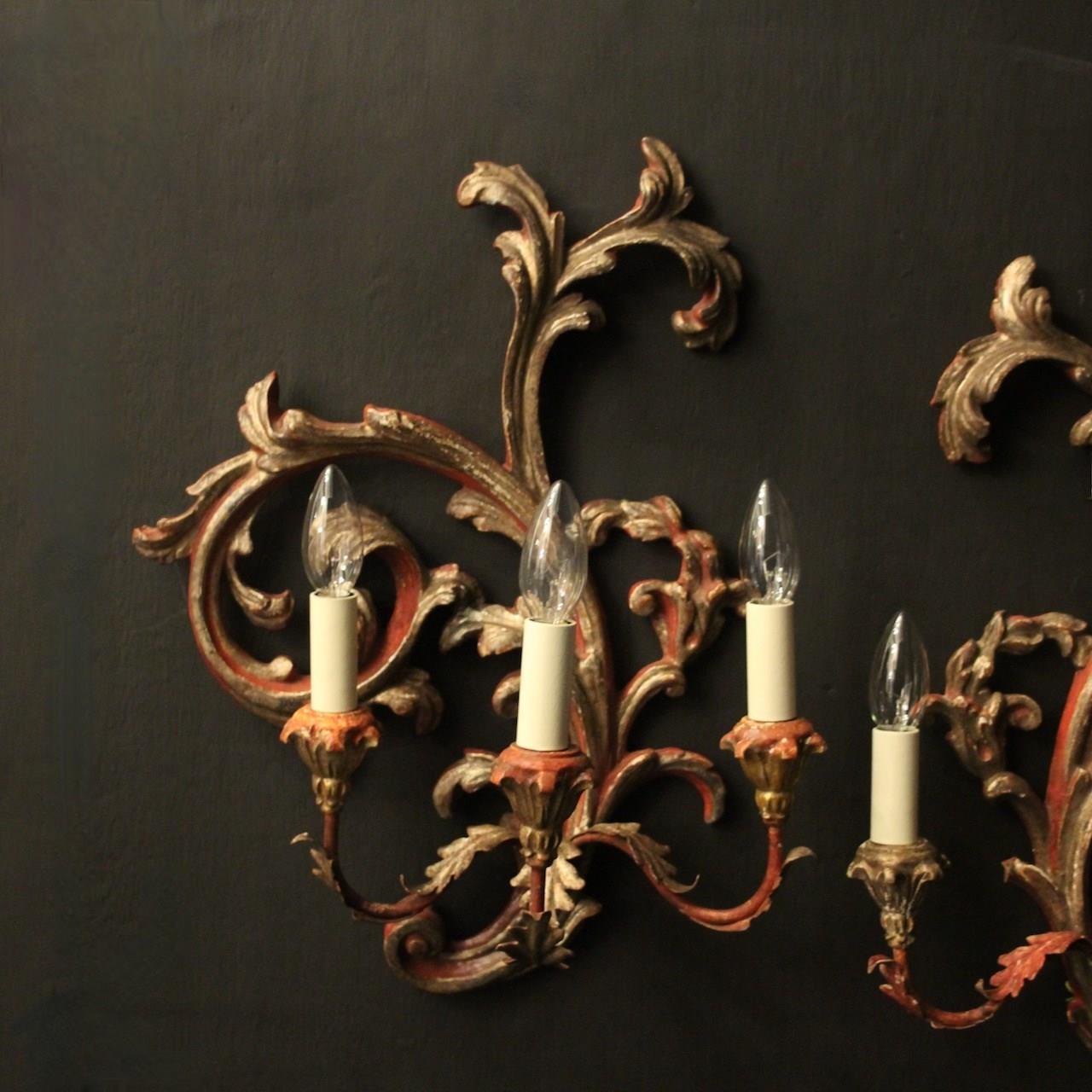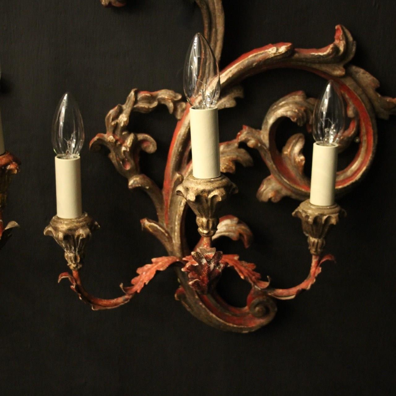 A decorative Italian Florentine carved giltwood and Toleware opposing triple arm antique wall lights, the foliated toleware leaf scrolling arms with wooden bulbous leaf candle sconces, issuing from an ornate pierced Acanthus leaf wooden opposing backplate, very decorative with nice original patination. The colours on the wall sconces are different red on left and silver patination on the right. Fully rewired and PAT tested. All our wall lights come with aged brass screws for fixing and spare bulbs.