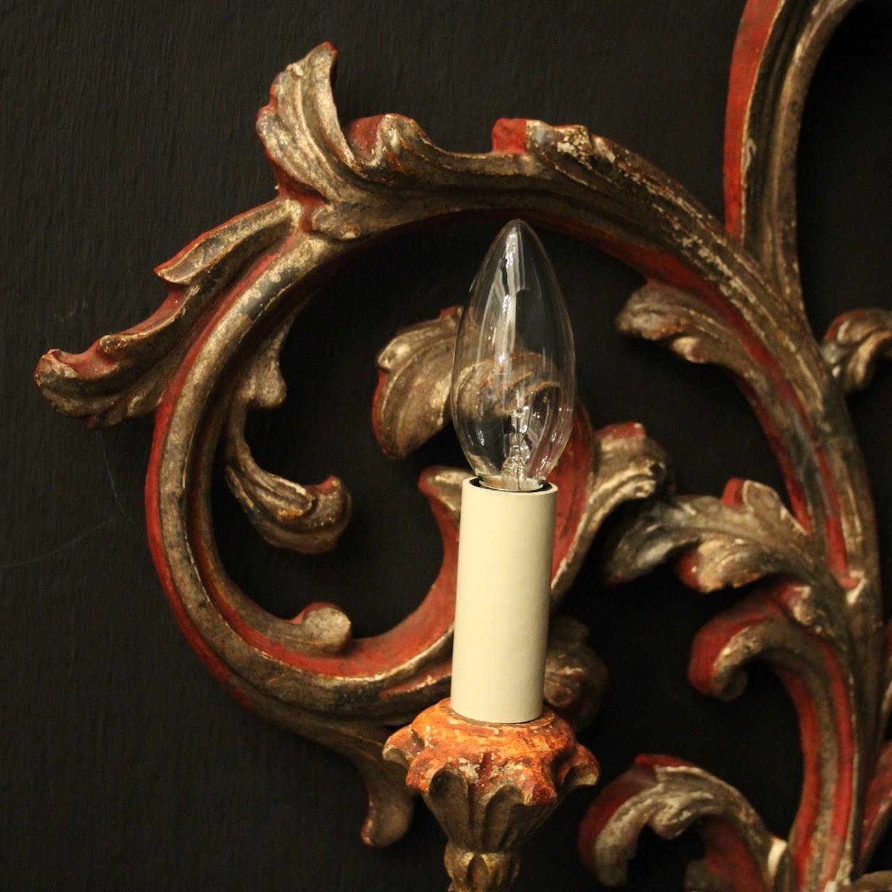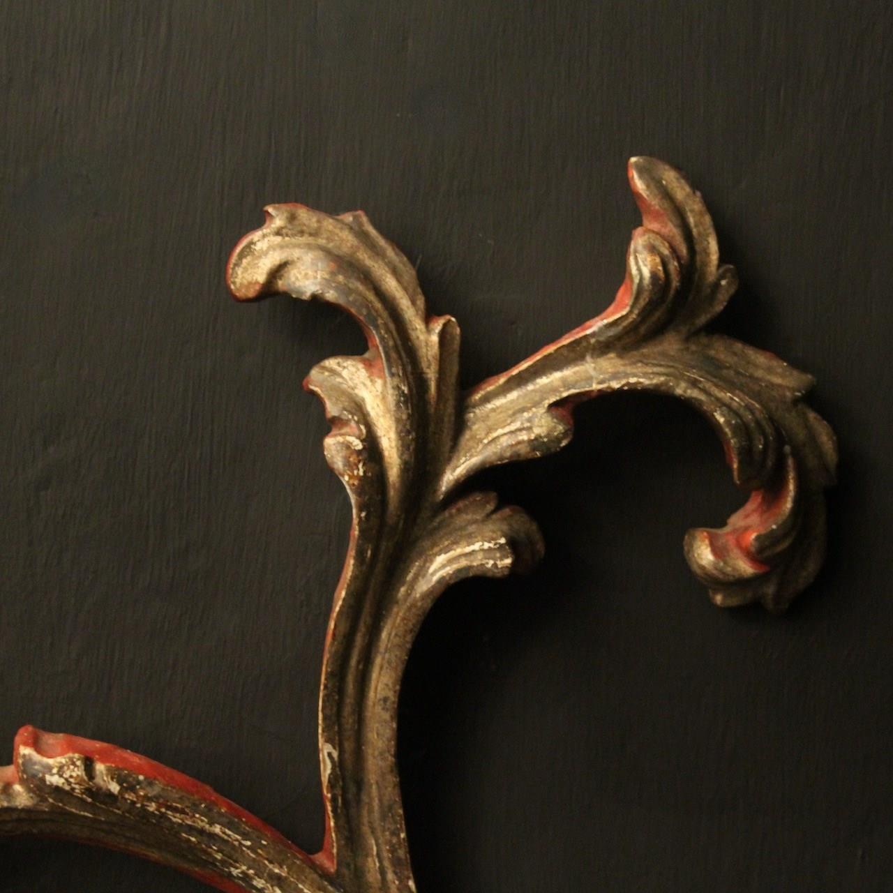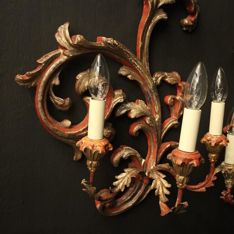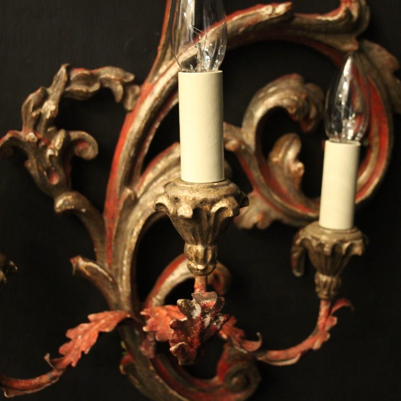 A decorative Italian Florentine carved giltwood and Toleware opposing triple arm antique wall lights, the foliated toleware leaf scrolling arms with wooden bulbous leaf candle sconces, issuing from an ornate pierced Acanthus leaf wooden opposing backplate, very decorative with nice original patination. The colours on the wall sconces are different red on left and silver patination on the right. Fully rewired and PAT tested. All our wall lights come with aged brass screws for fixing and spare bulbs.