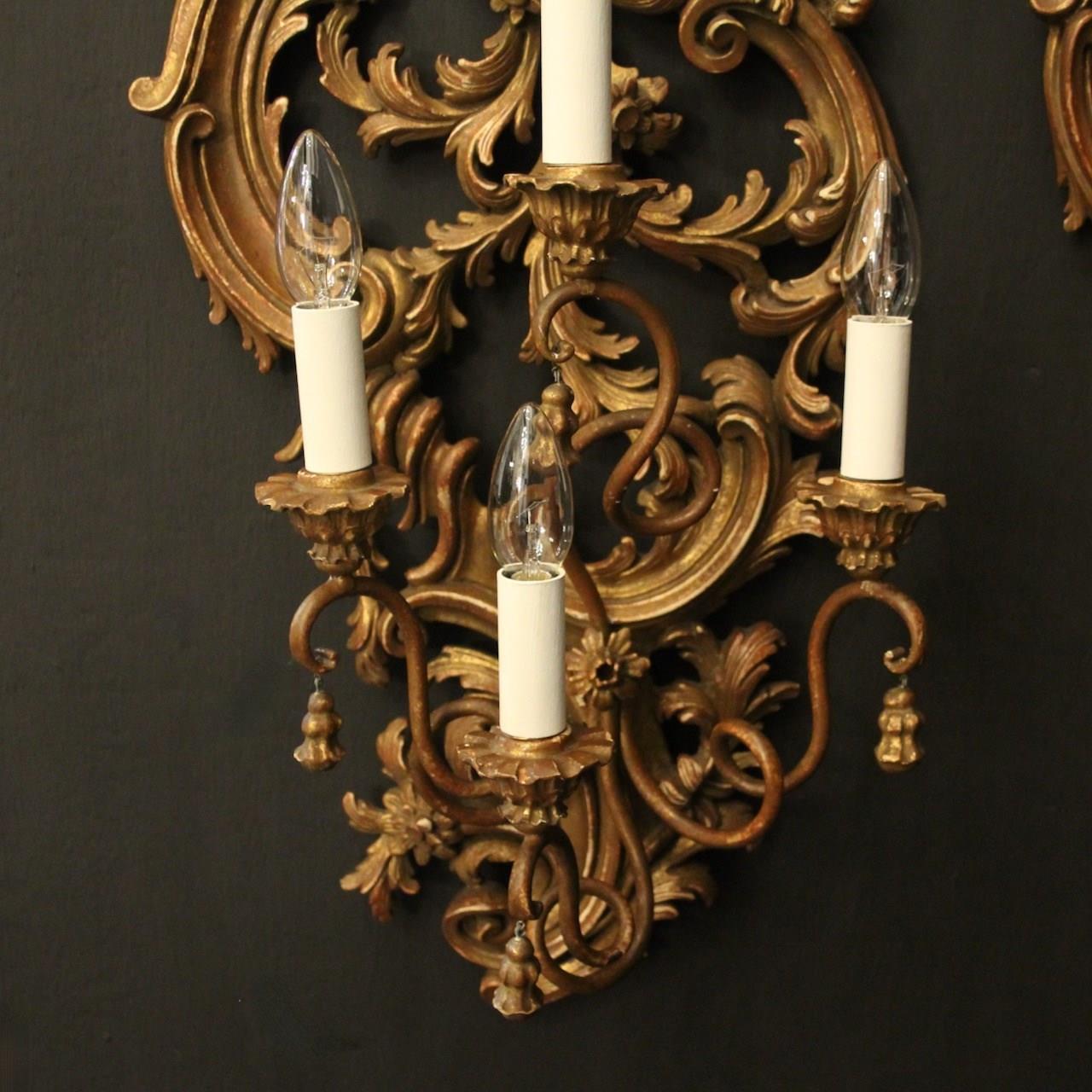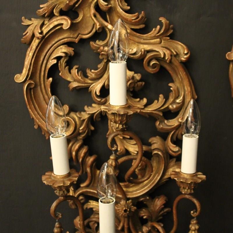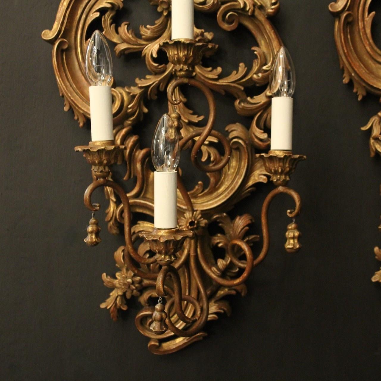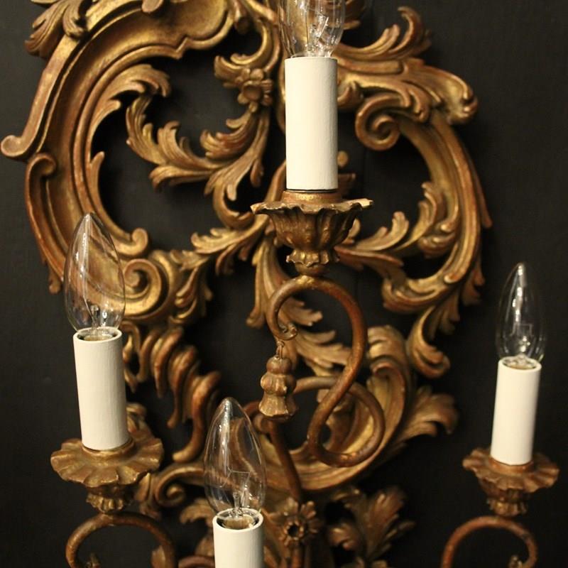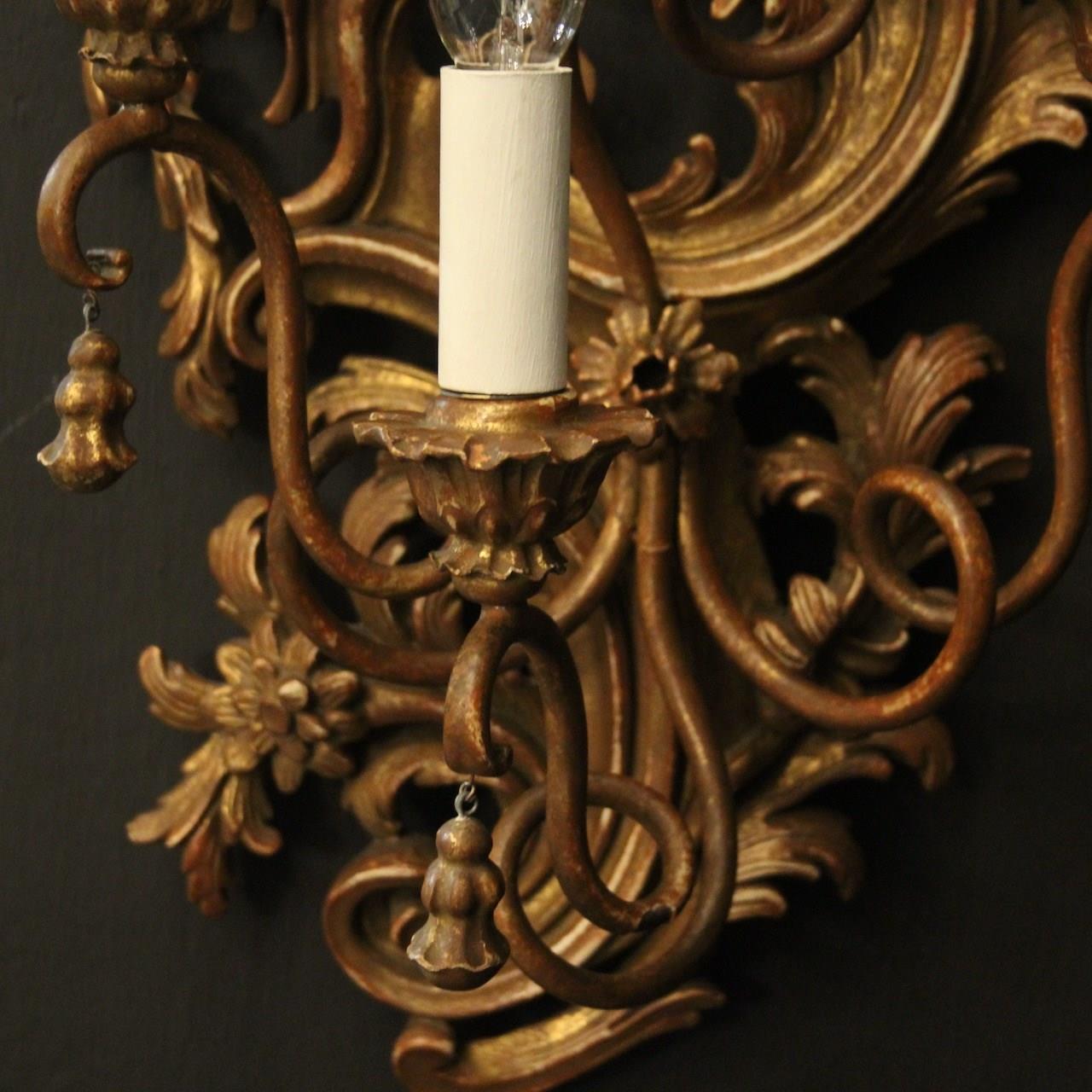 A lovely Italian carved giltwood and Toleware four arm antique wall lights, the tiered foliated toleware leaf scrolling arms with wooden leaf candle sconces and pretty hanging giltwood tassels, issuing from an ornate pierced Acanthus leaf wooden backplate, nice original patination and great large scale. Fully rewired and PAT tested. All our wall lights come with aged brass screws or brackets for fixing and spare bulbs.