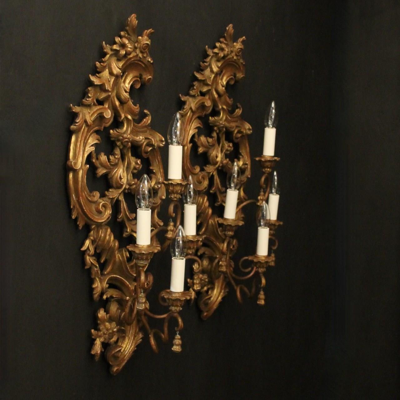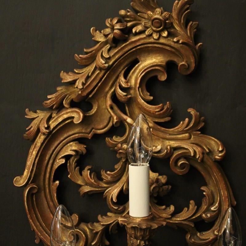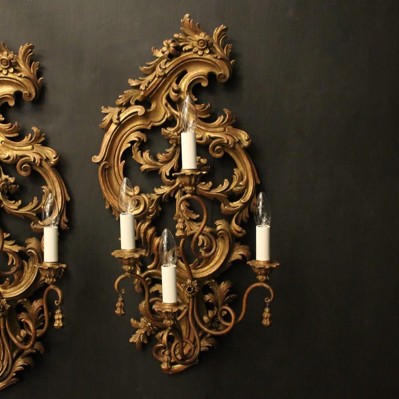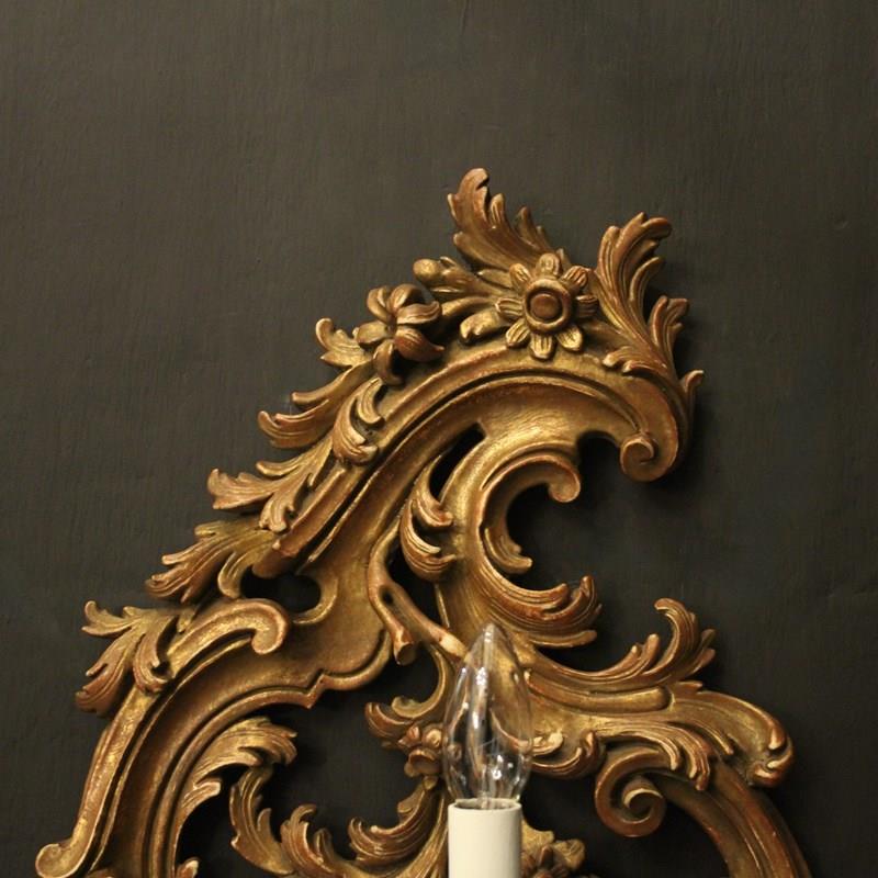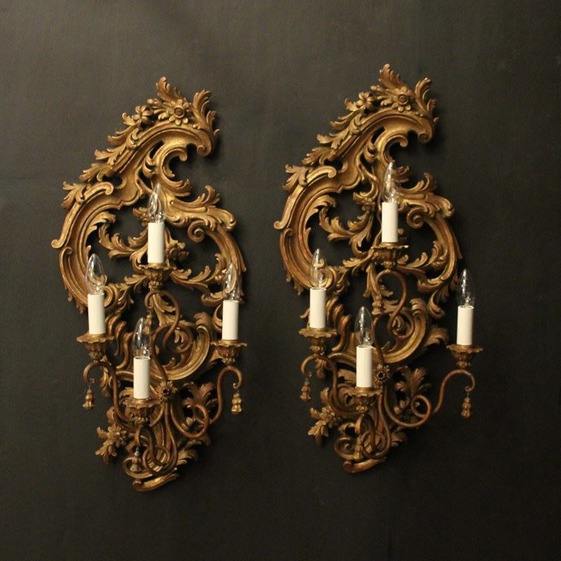 A lovely Italian carved giltwood and Toleware four arm antique wall lights, the tiered foliated toleware leaf scrolling arms with wooden leaf candle sconces and pretty hanging giltwood tassels, issuing from an ornate pierced Acanthus leaf wooden backplate, nice original patination and great large scale. Fully rewired and PAT tested. All our wall lights come with aged brass screws or brackets for fixing and spare bulbs.