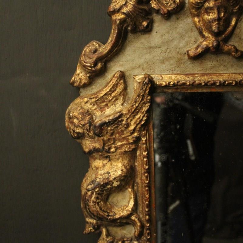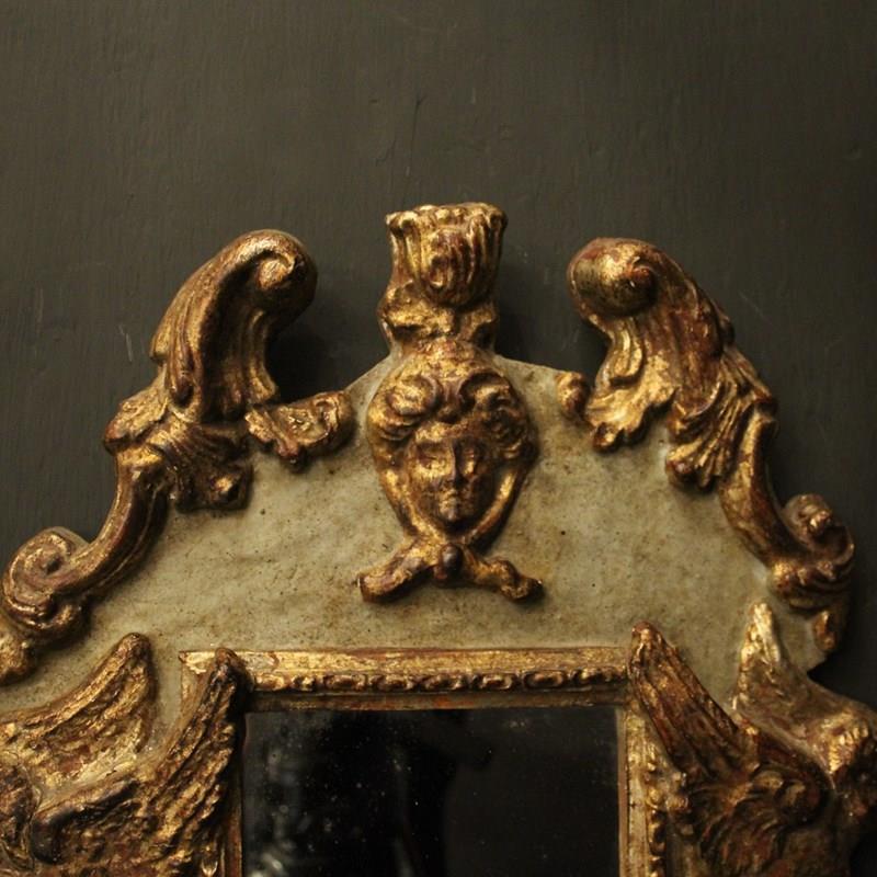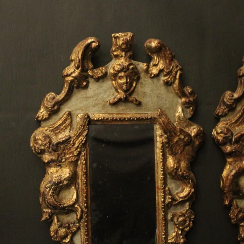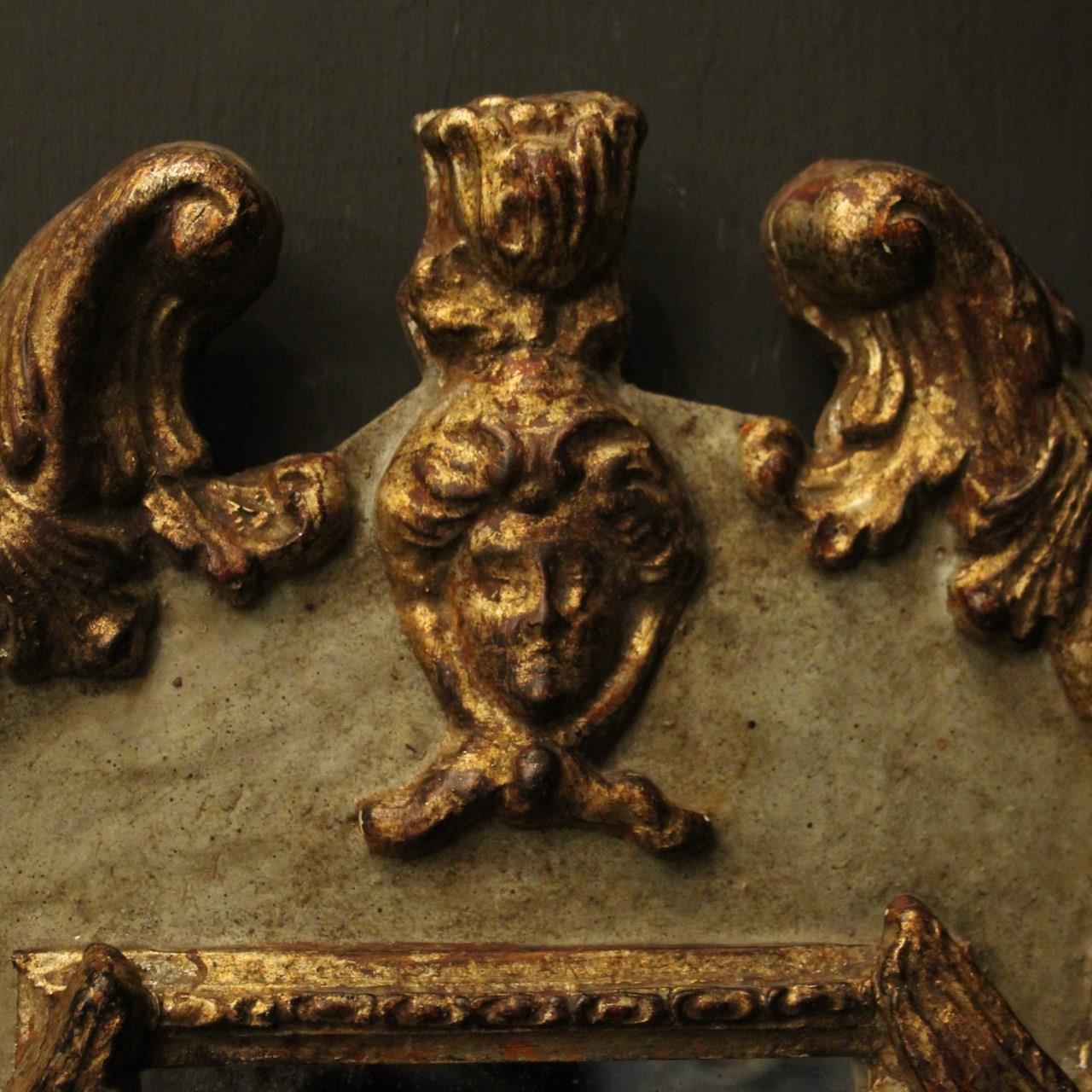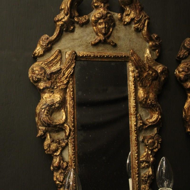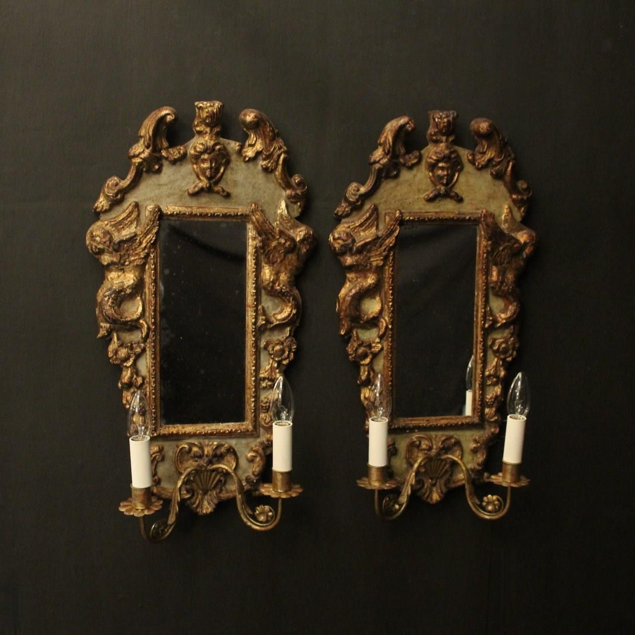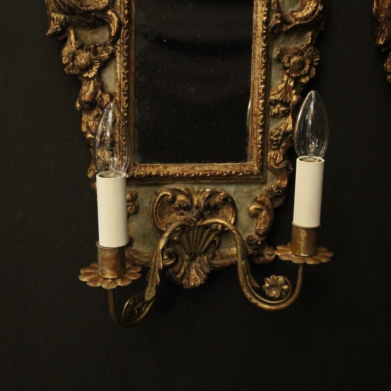A pretty Italian Florentine pair of giltwood and toleware twin arm mirrored antique girandoles, the silver gilded metal leaf scrolling arms with candle sconces, issuing from a painted faded green and giltwood elongated mirrored backplate with ornate winged cherubs and carved mask pierced finial, great original patination with original glass plates. Fully rewired and PAT tested. All our wall lights come with aged brass screws for fixing and spare bulbs.