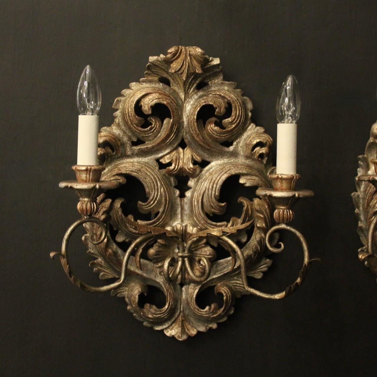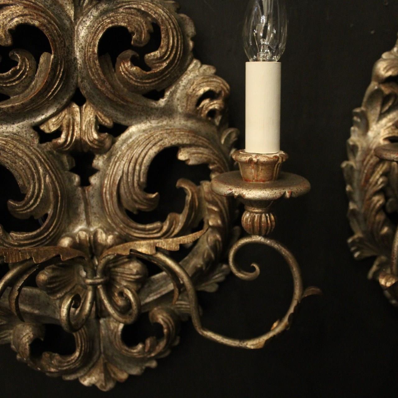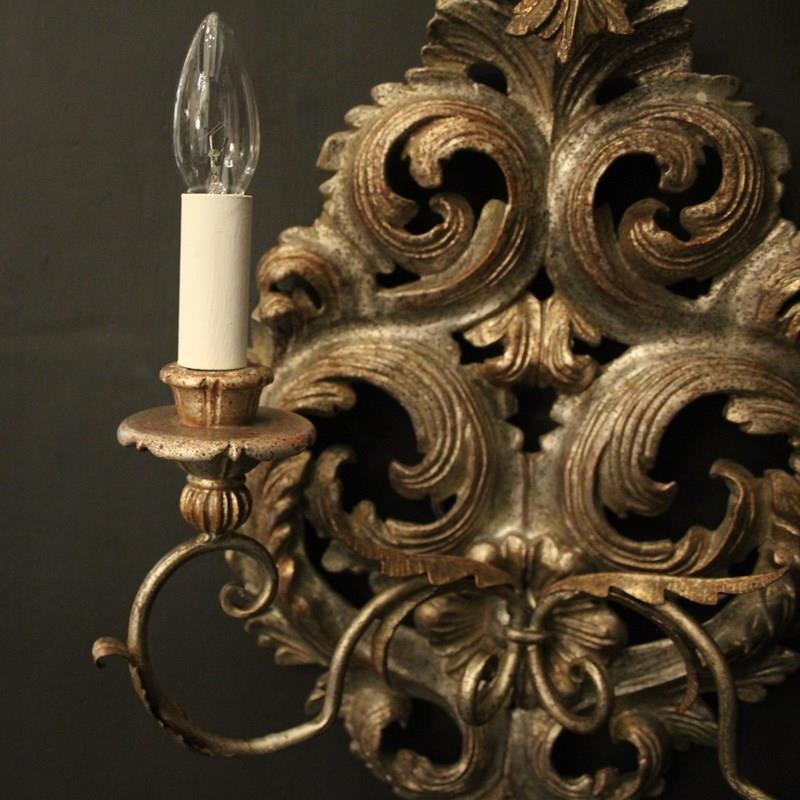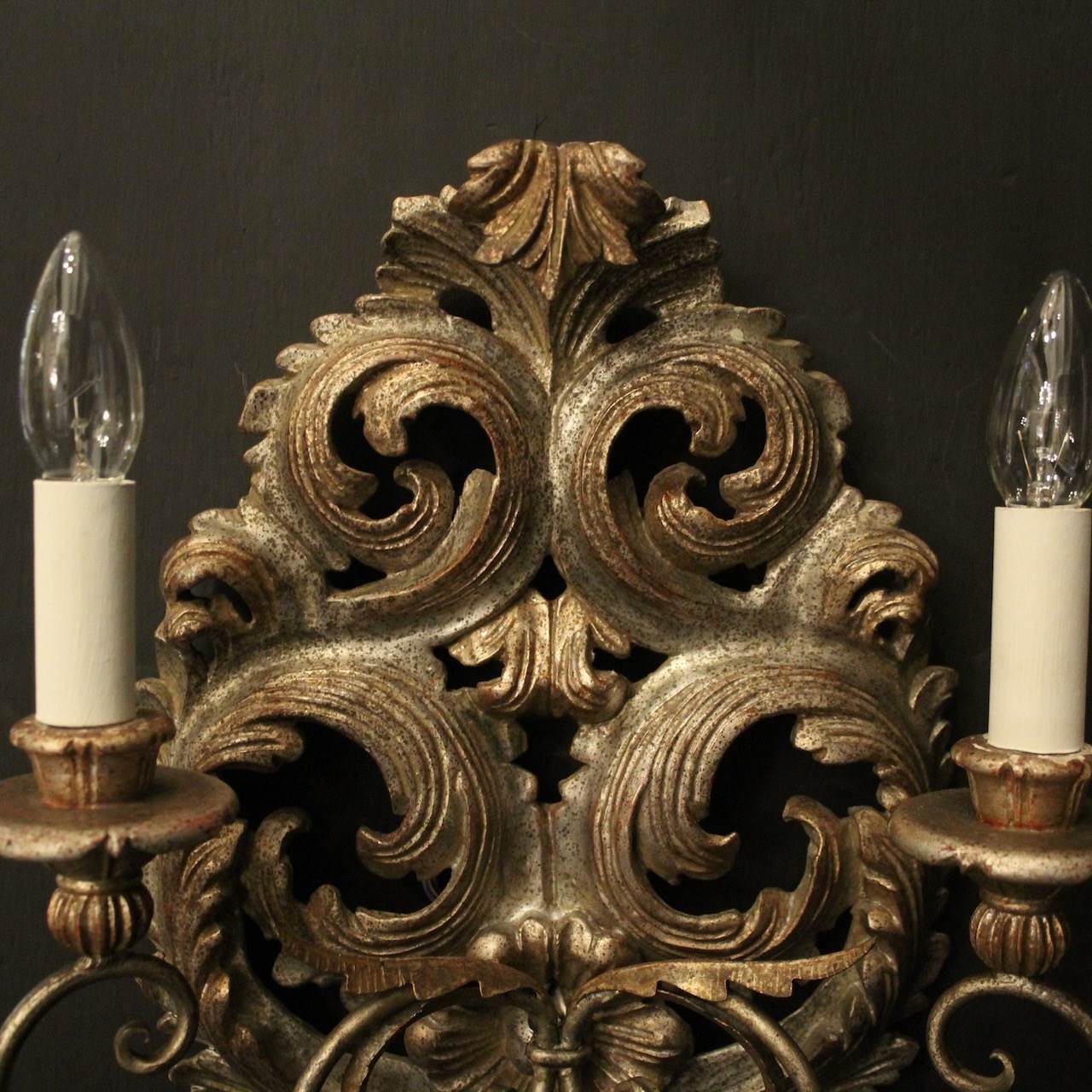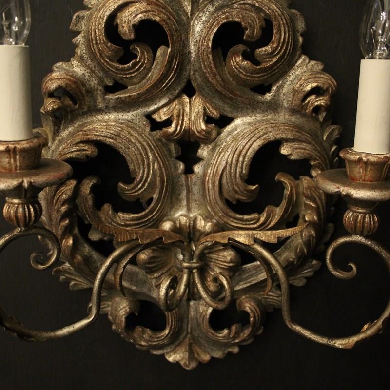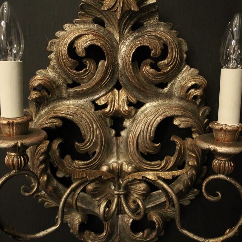 An Italian Florentine carved silvered giltwood and Toleware twin arm antique wall lights, the foliated toleware leaf scrolling arms with wooden bobeche drip pans and bulbous candle sconces, issuing from an ornate pierced Acanthus leaf silvered wooden backplate, very decorative with lovely original silver gilded patination. Fully rewired and PAT tested. All our wall lights come with aged brass screws for fixing and spare bulbs.