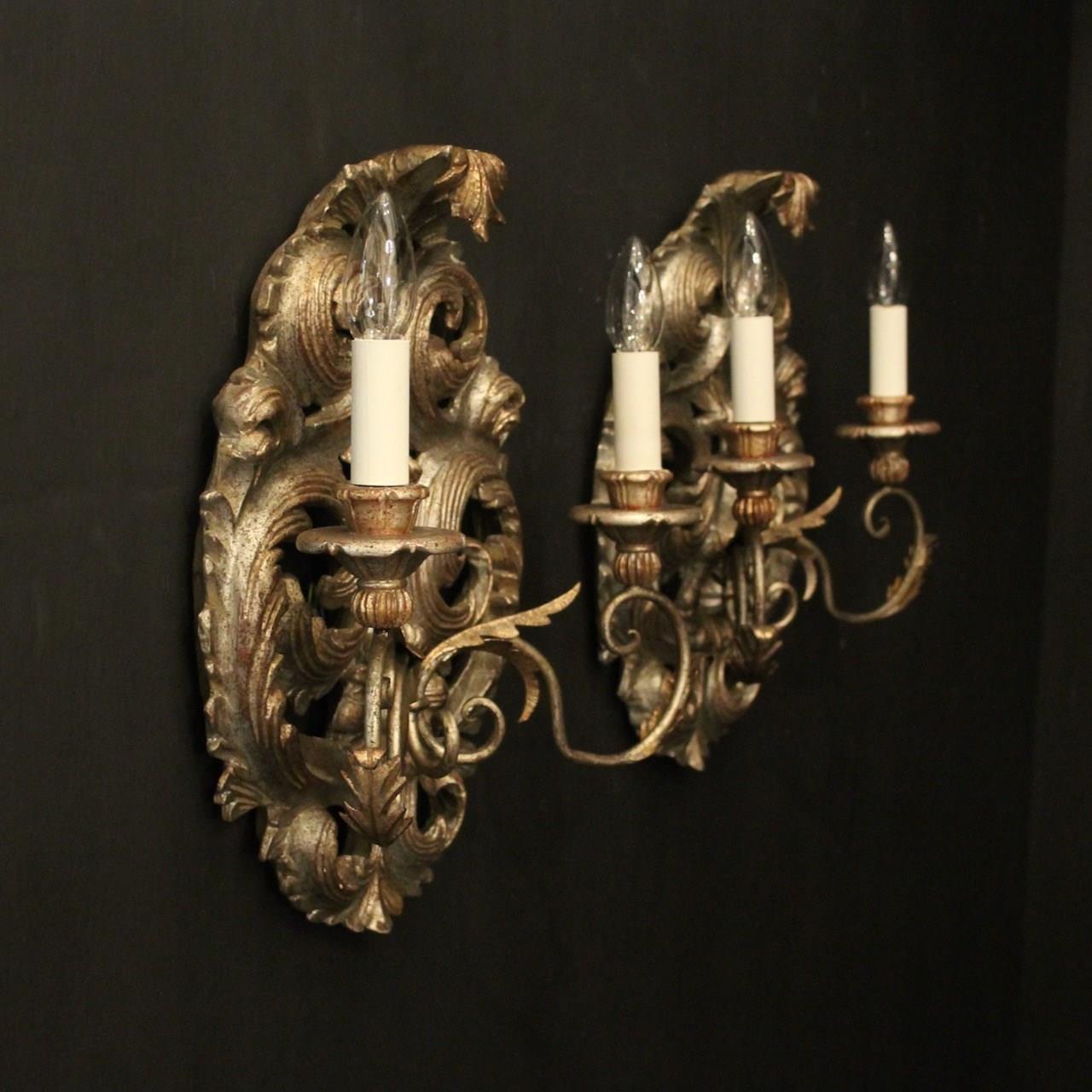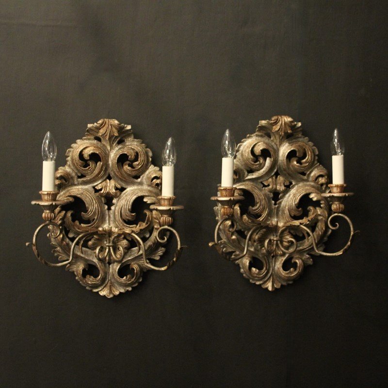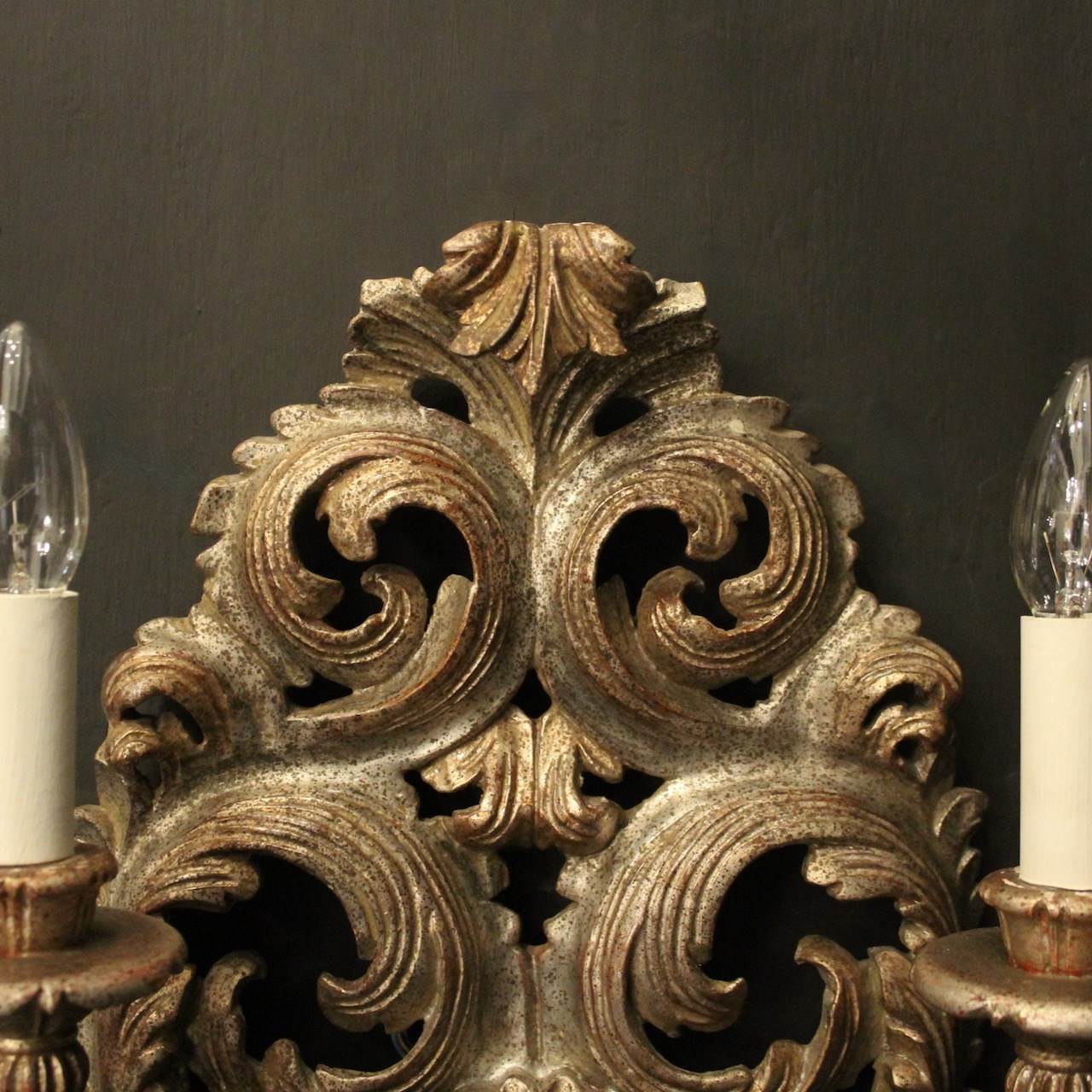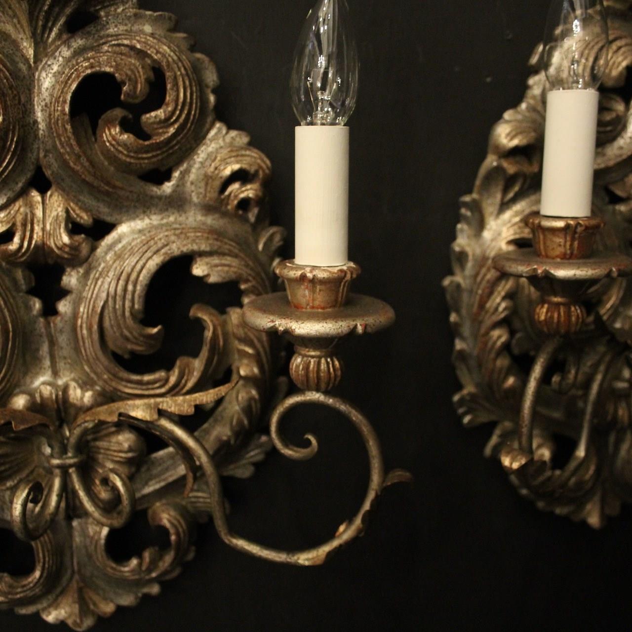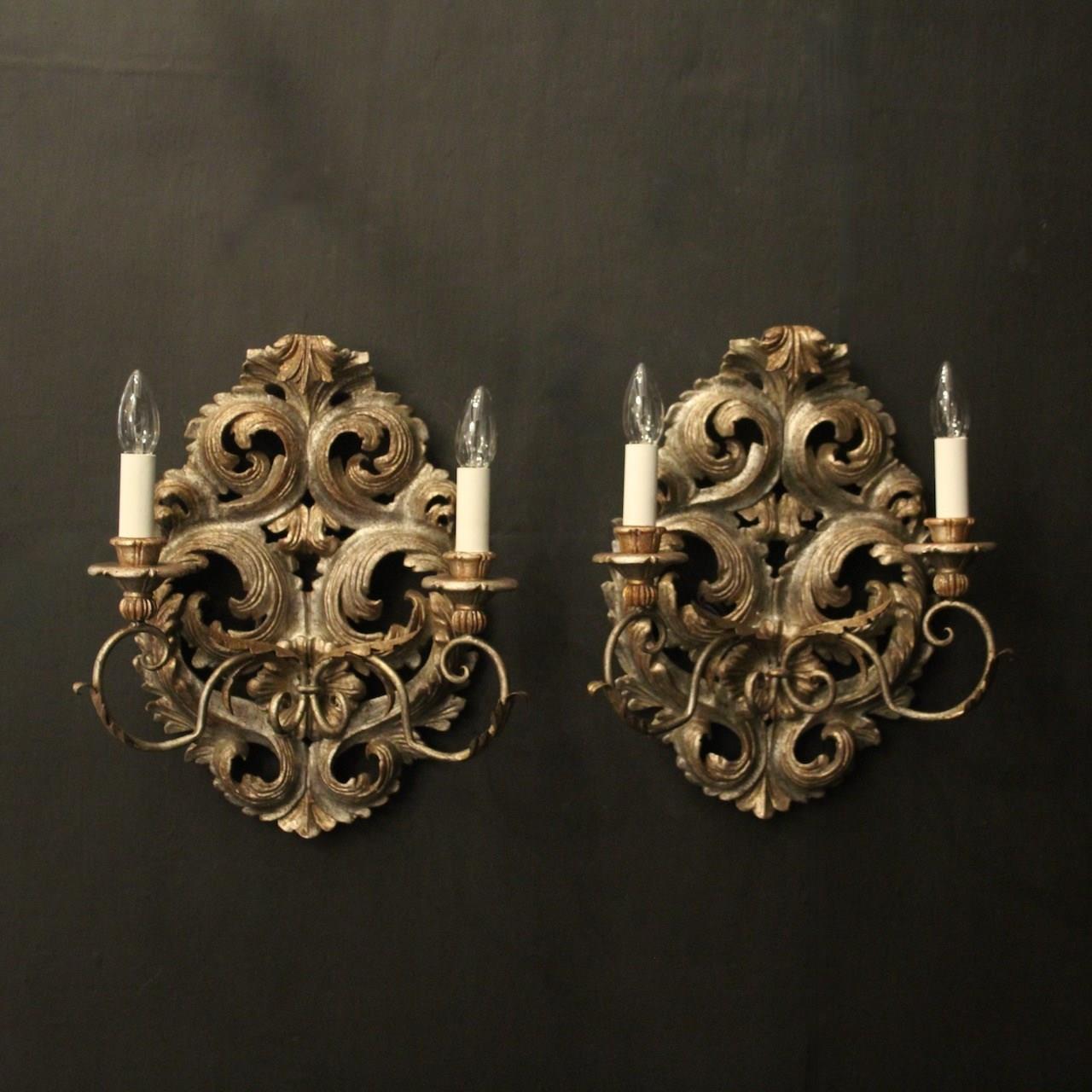 An Italian Florentine carved silvered giltwood and Toleware twin arm antique wall lights, the foliated toleware leaf scrolling arms with wooden bobeche drip pans and bulbous candle sconces, issuing from an ornate pierced Acanthus leaf silvered wooden backplate, very decorative with lovely original silver gilded patination. Fully rewired and PAT tested. All our wall lights come with aged brass screws for fixing and spare bulbs.