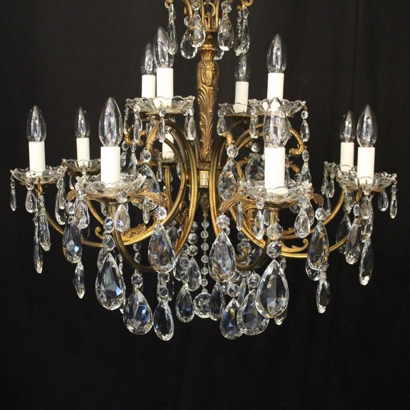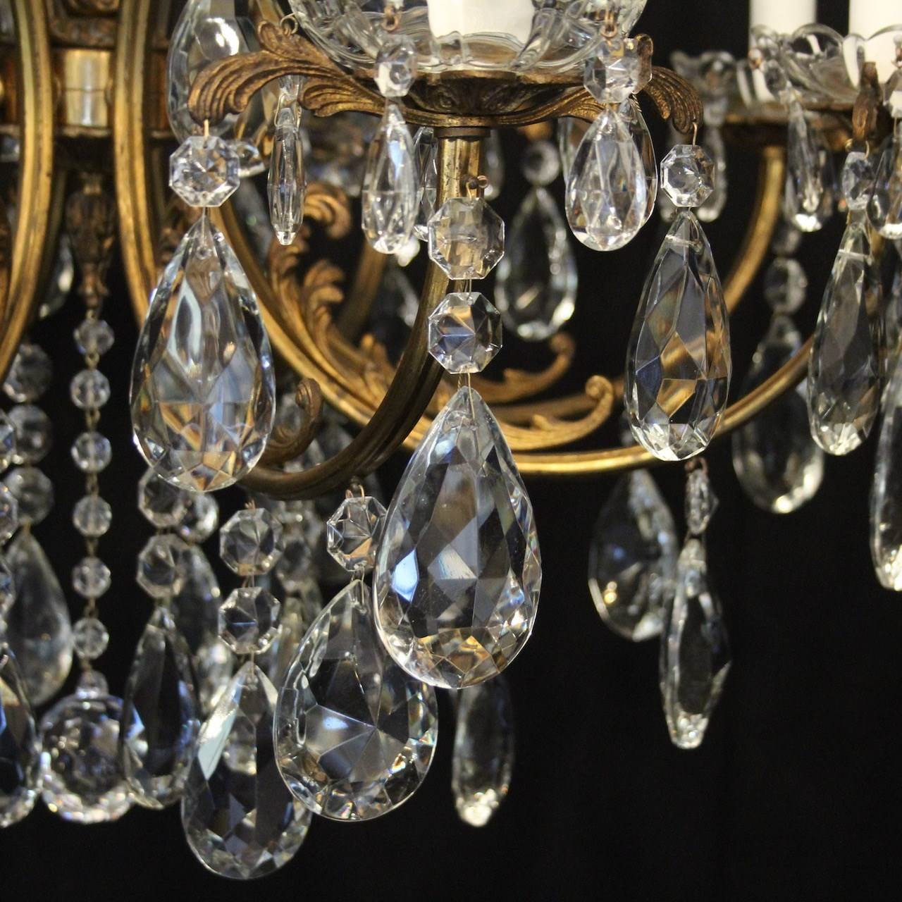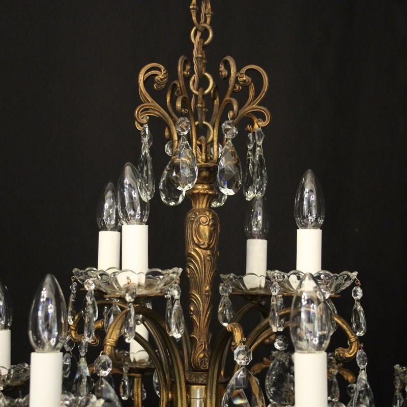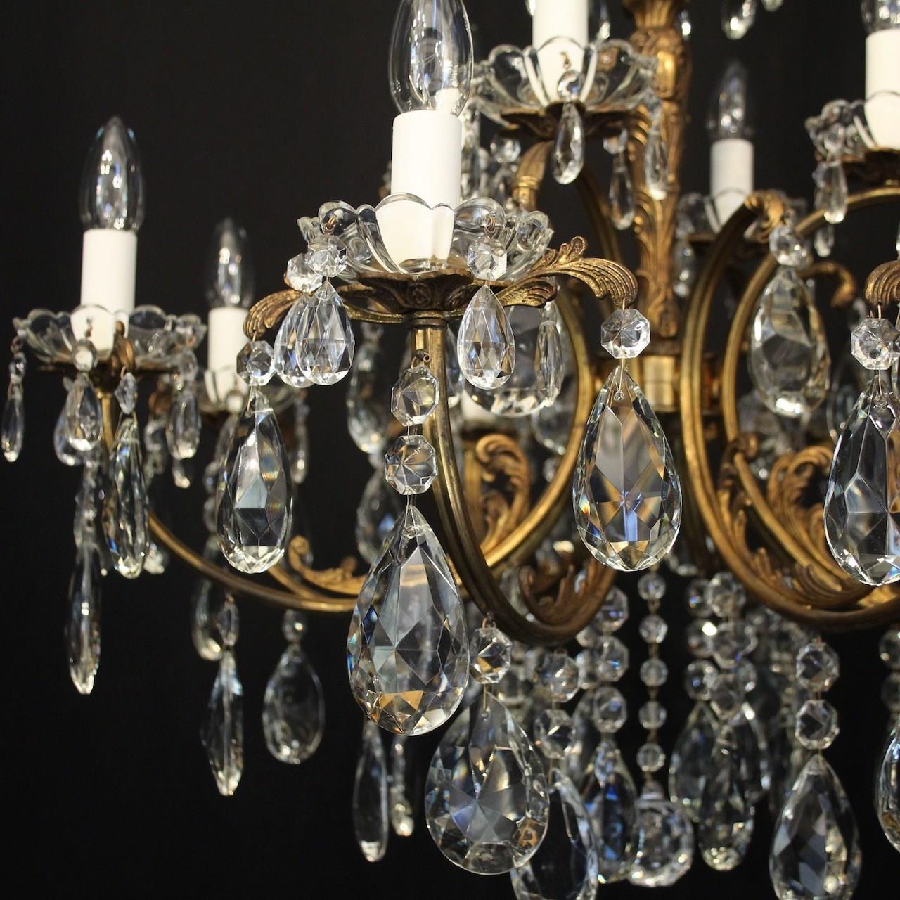 A French gilded bronze and crystal 12 light double tiered antique chandelier, the 8 and 4 leaf clad scrolling arms with glass bobeche drip pans, issuing from a tapering foliated central column with scrolling leaf canopy, decorated overall in faceted crystal pendants and having the original chain and ceiling rose. Fully rewired and PAT tested. All our chandeliers come with ceiling fixings and spare bulbs.Dimensions: H: 27"/69cm W: 28"/71cm Excluding Chain & RoseCirca: Early 20th CenturyProduct Ref: OKA05527