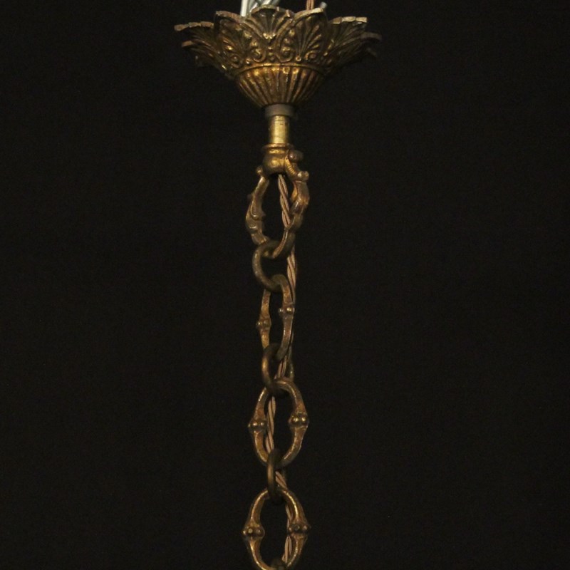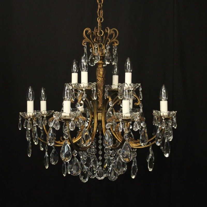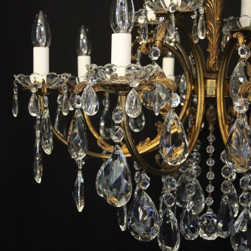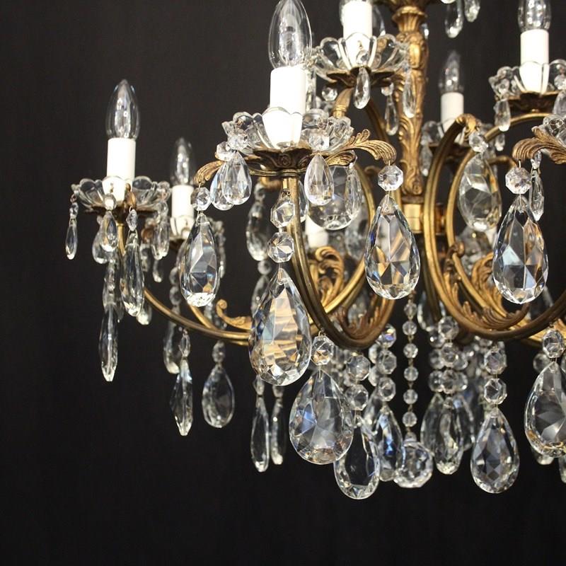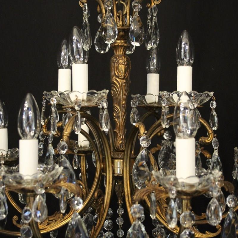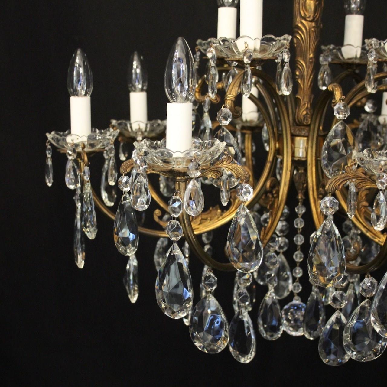 A French gilded bronze and crystal 12 light double tiered antique chandelier, the 8 and 4 leaf clad scrolling arms with glass bobeche drip pans, issuing from a tapering foliated central column with scrolling leaf canopy, decorated overall in faceted crystal pendants and having the original chain and ceiling rose. Fully rewired and PAT tested. All our chandeliers come with ceiling fixings and spare bulbs.Dimensions: H: 27"/69cm W: 28"/71cm Excluding Chain & RoseCirca: Early 20th CenturyProduct Ref: OKA05527