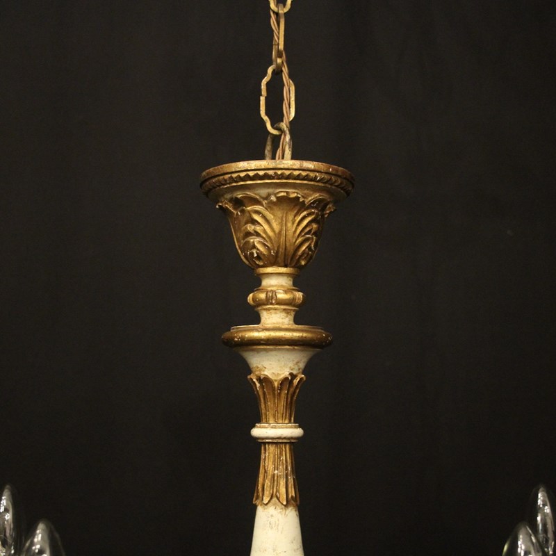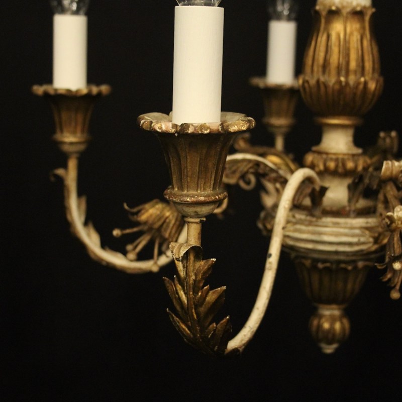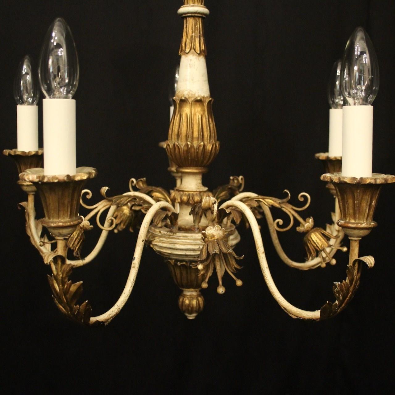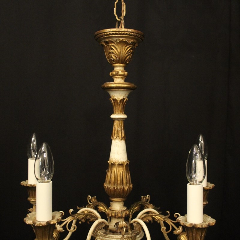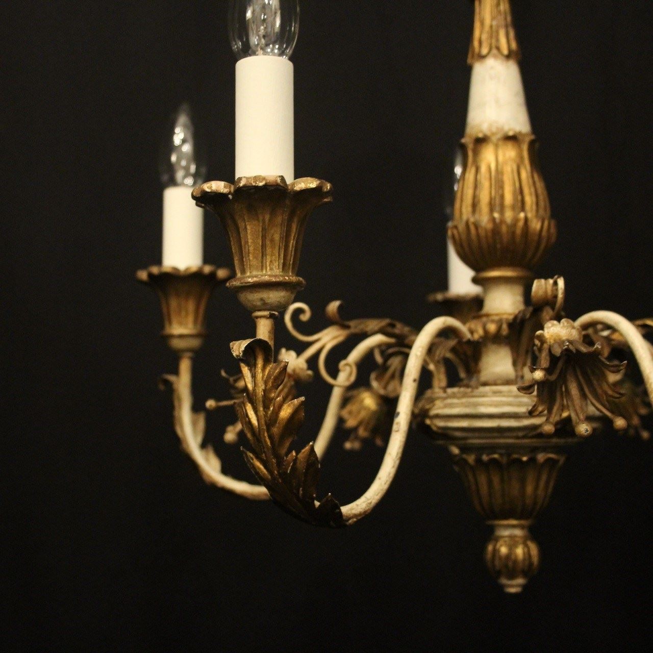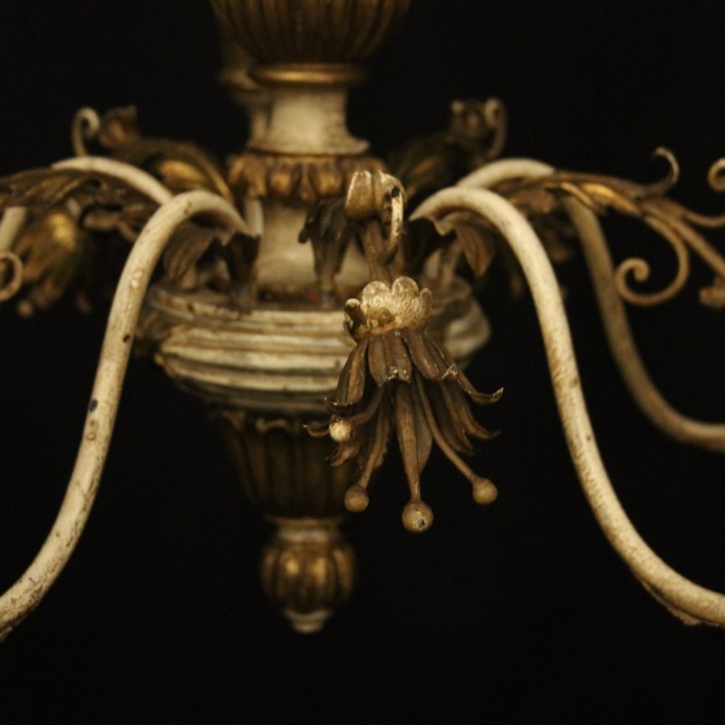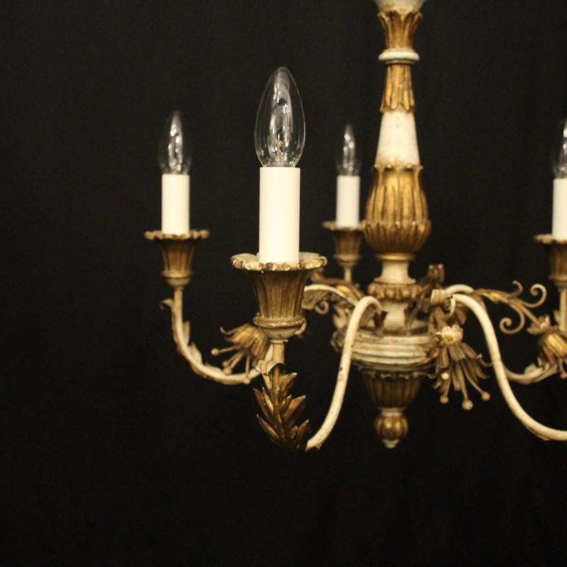 A decorative French giltwood and cream polychrome 6 light antique chandelier, the acanthus leaf toleware scrolling arms with trumpet wooden reeded bobeche drip pans, issuing from a wooden baluster reeded leaf central column, having the original chain and ceiling rose, great original patination and very decorative. Fully rewired and PAT tested. All our chandeliers come with ceiling fixings and spare bulbs.