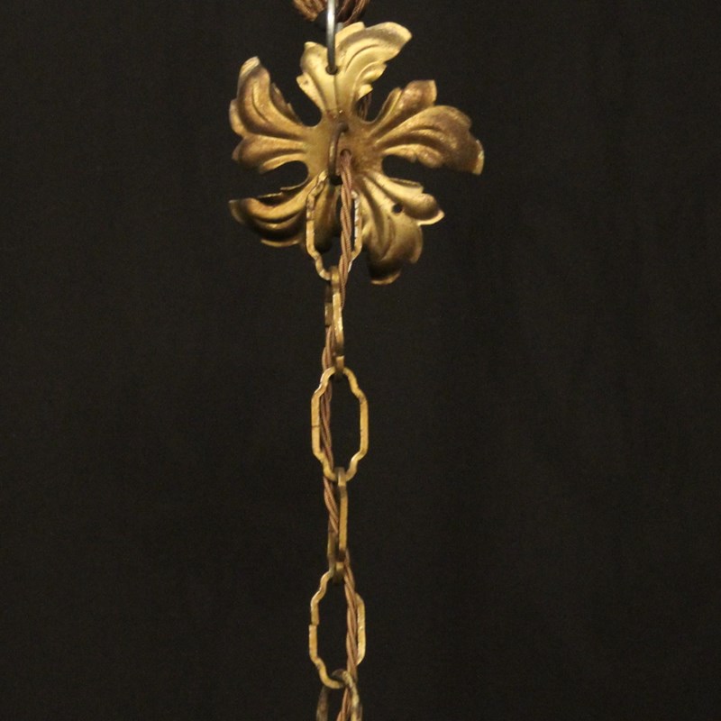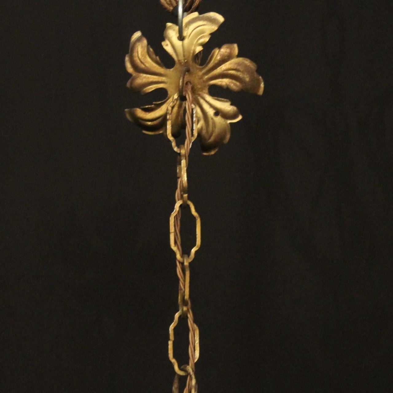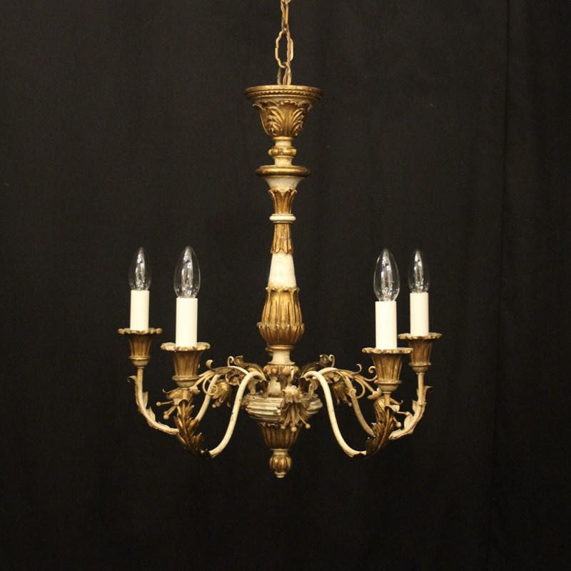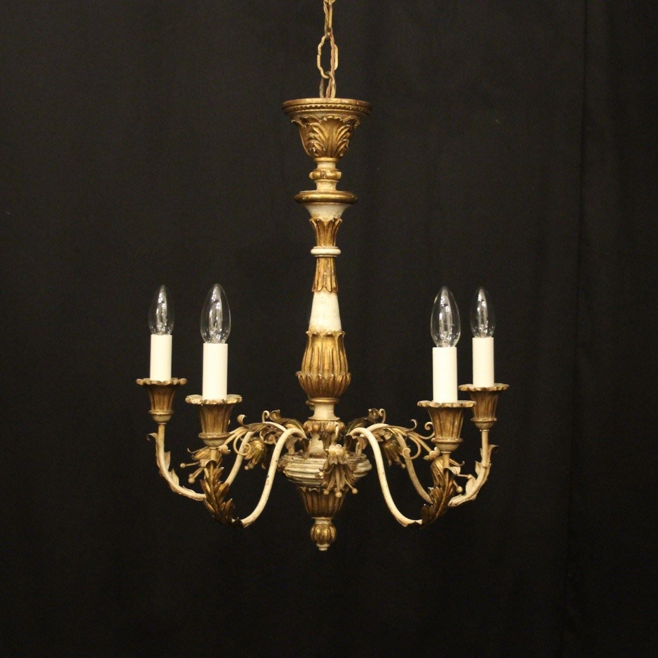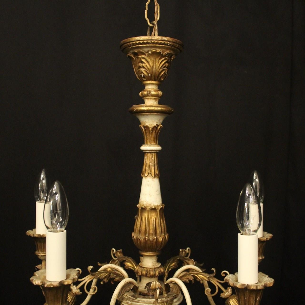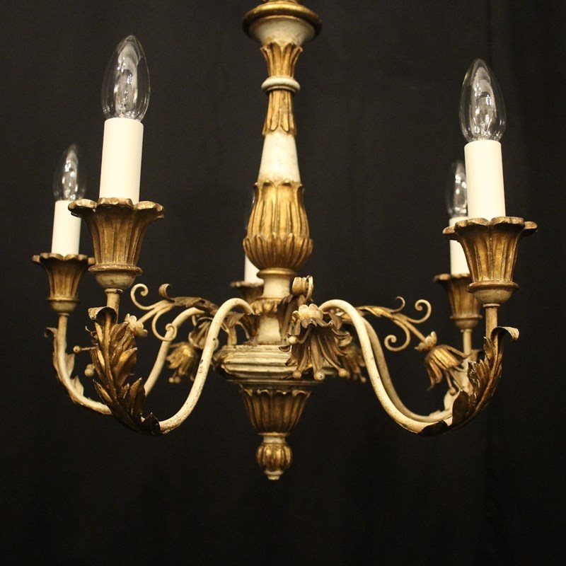 A decorative French giltwood and cream polychrome 6 light antique chandelier, the acanthus leaf toleware scrolling arms with trumpet wooden reeded bobeche drip pans, issuing from a wooden baluster reeded leaf central column, having the original chain and ceiling rose, great original patination and very decorative. Fully rewired and PAT tested. All our chandeliers come with ceiling fixings and spare bulbs.