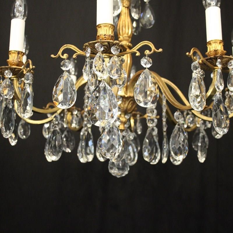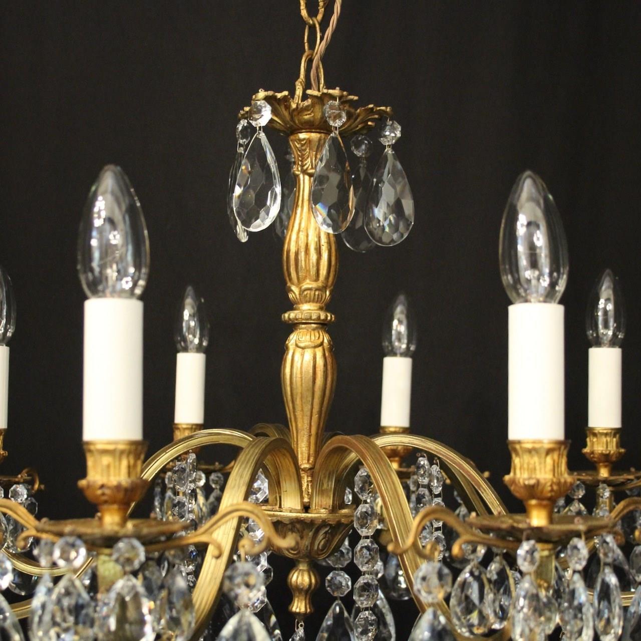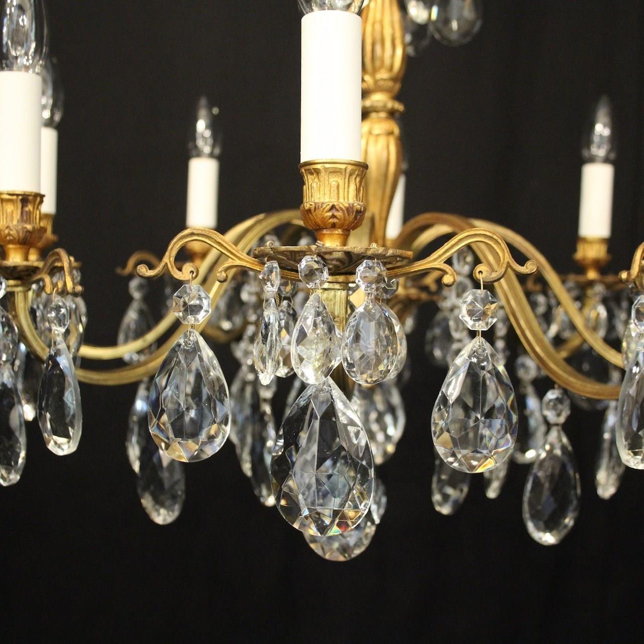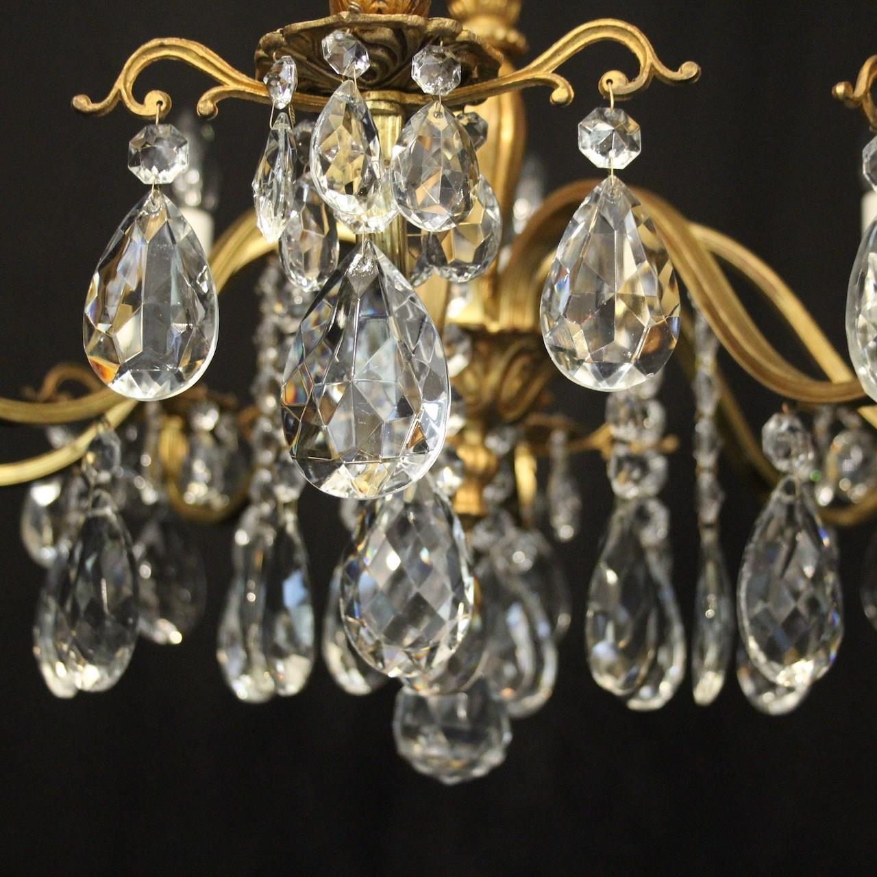A French gilded brass and crystal 8 light antique chandelier, the reeded scrolling arms with circular leaf bobeche drip pans and bulbous candle sconces, issuing from a reeded bulbous central column, decorated overall in faceted crystal pendants and having the original chain and ceiling rose. Ideal for a low ceiling. Fully rewired and PAT tested. All our chandeliers come with ceiling fixings and spare bulbs.