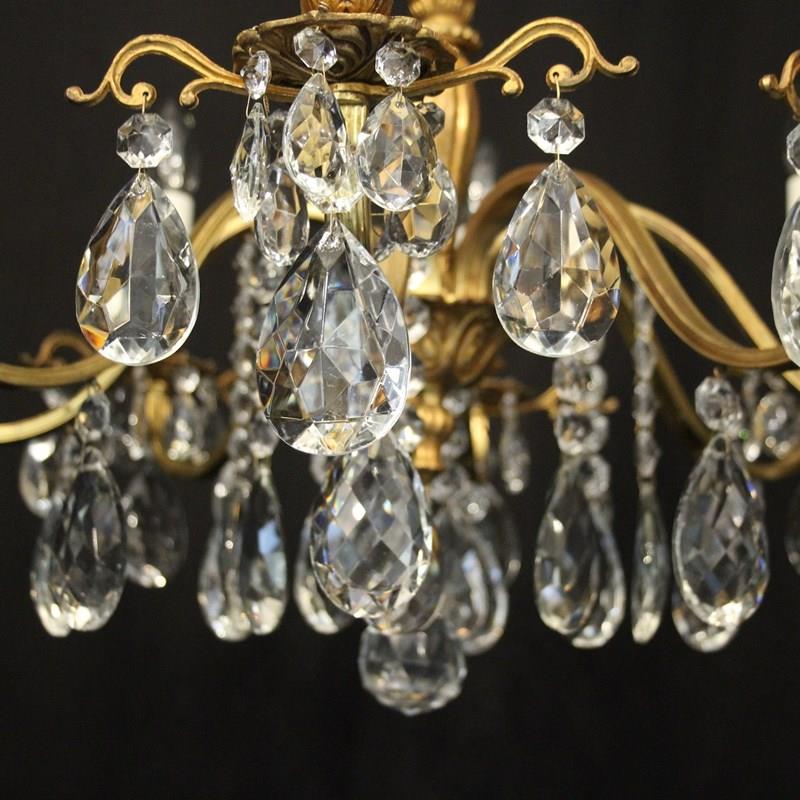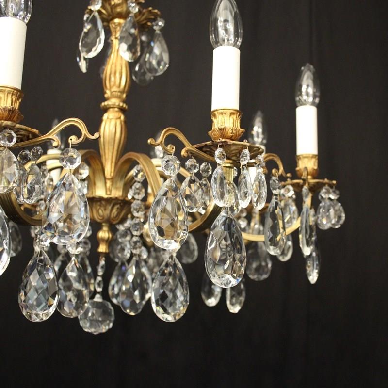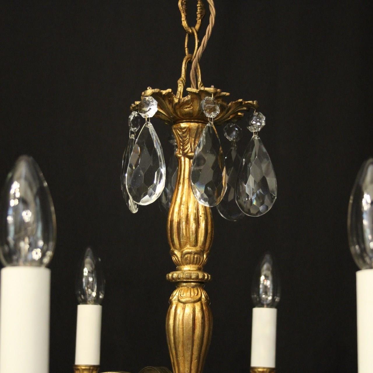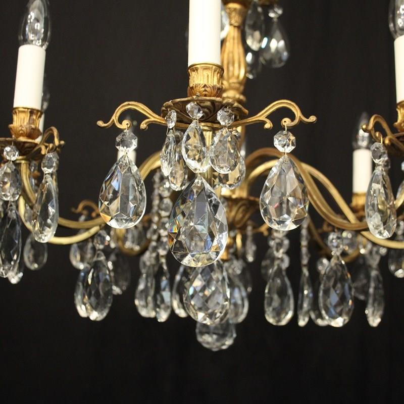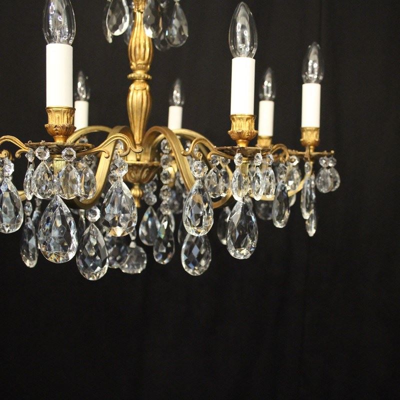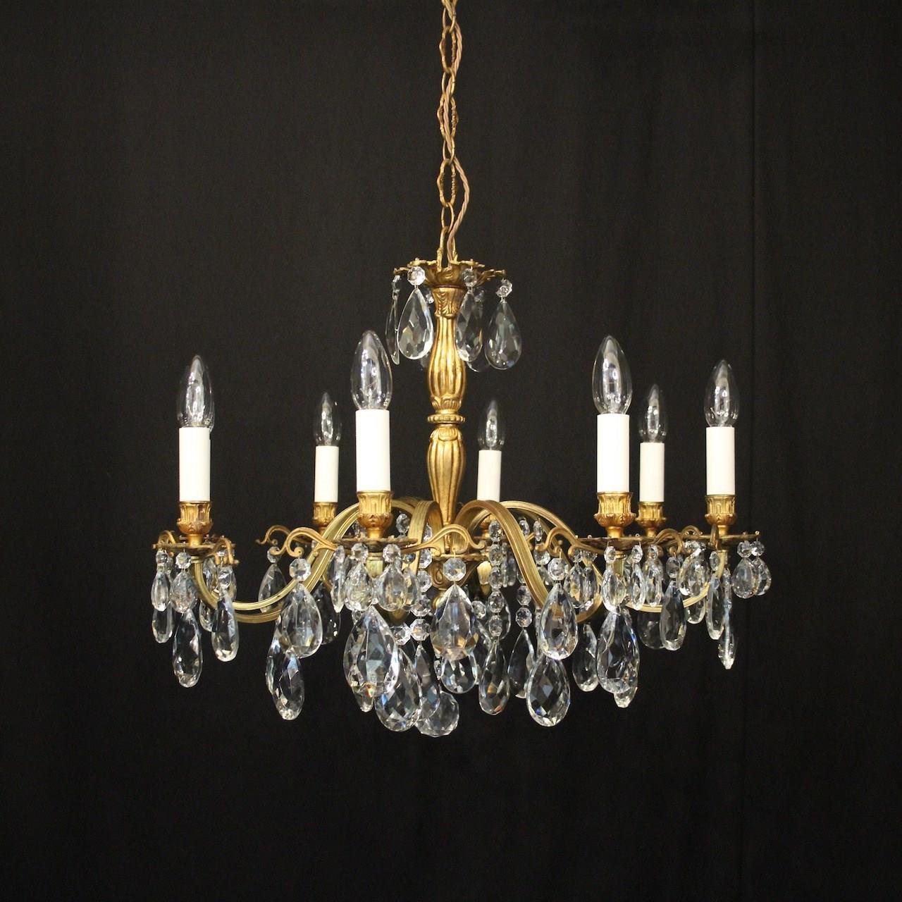 A French gilded brass and crystal 8 light antique chandelier, the reeded scrolling arms with circular leaf bobeche drip pans and bulbous candle sconces, issuing from a reeded bulbous central column, decorated overall in faceted crystal pendants and having the original chain and ceiling rose. Ideal for a low ceiling. Fully rewired and PAT tested. All our chandeliers come with ceiling fixings and spare bulbs.