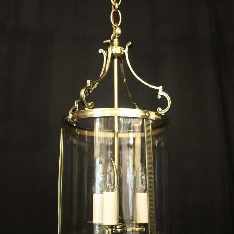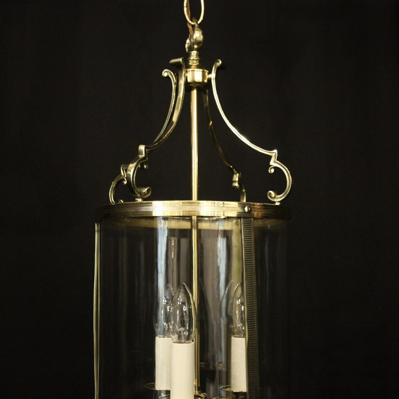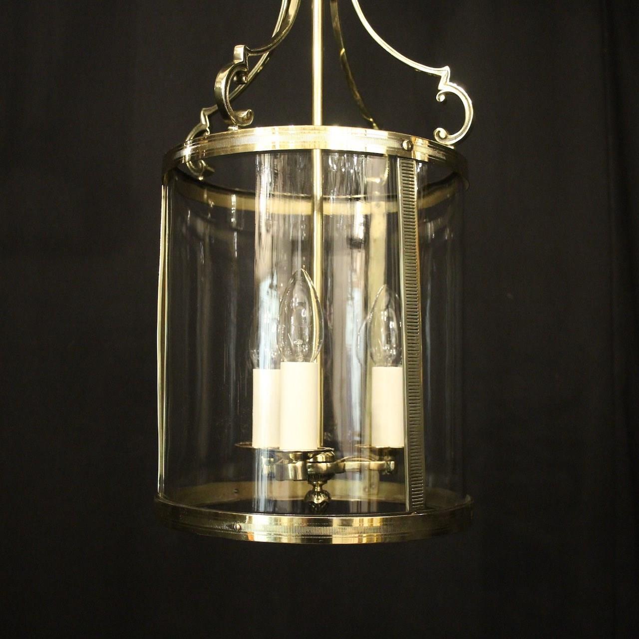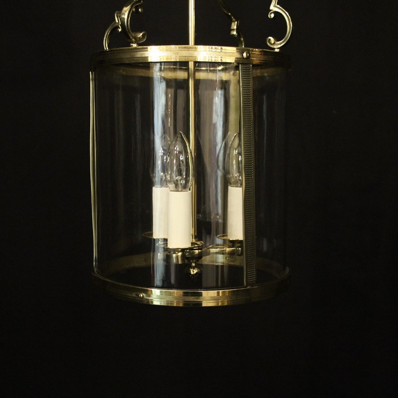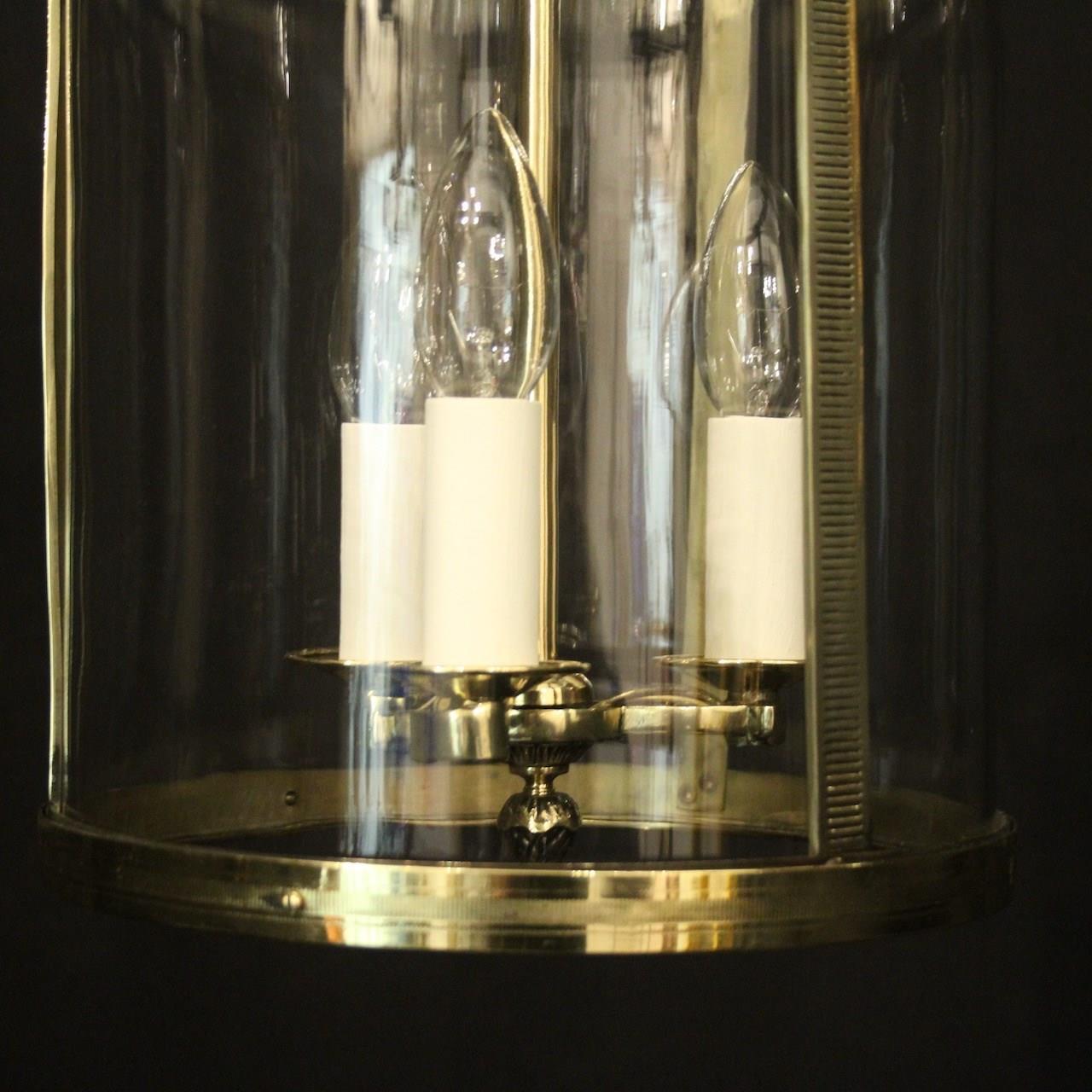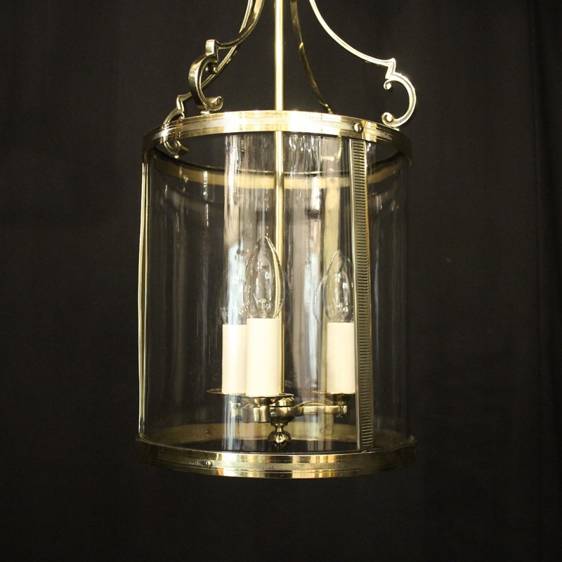 A French repolished brass triple light antique hall lantern, the three light fittings with circular bobeche drip pans, surrounded by a single circular convex glass panel, held within a decorative scrolling framework with reeded banding, reeded side sections and acorn central finial with a square gauge scrolling canopy and having the original chain and ceiling rose. Fully rewired and PAT tested. All our lanterns come with bulbs and ceiling fixings.