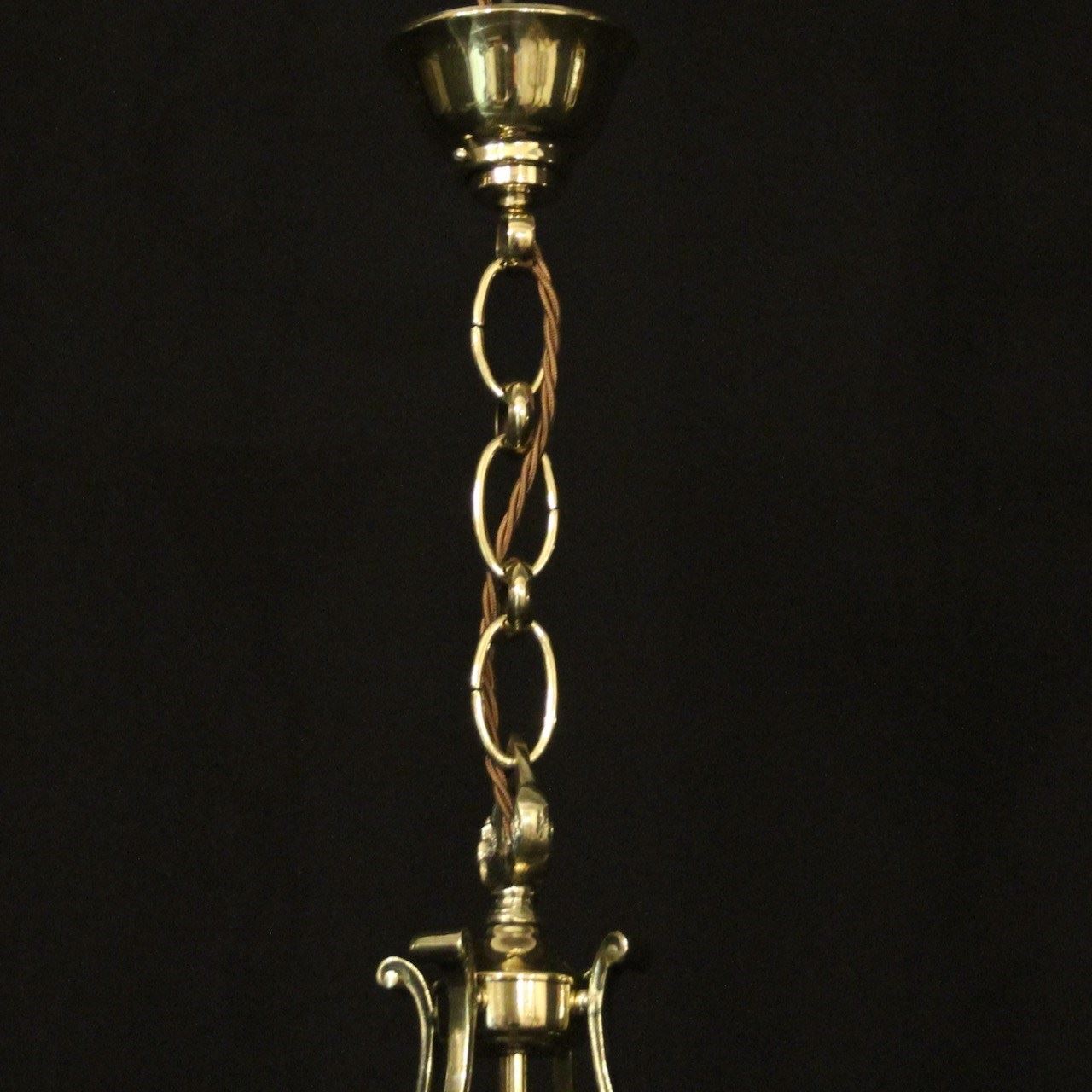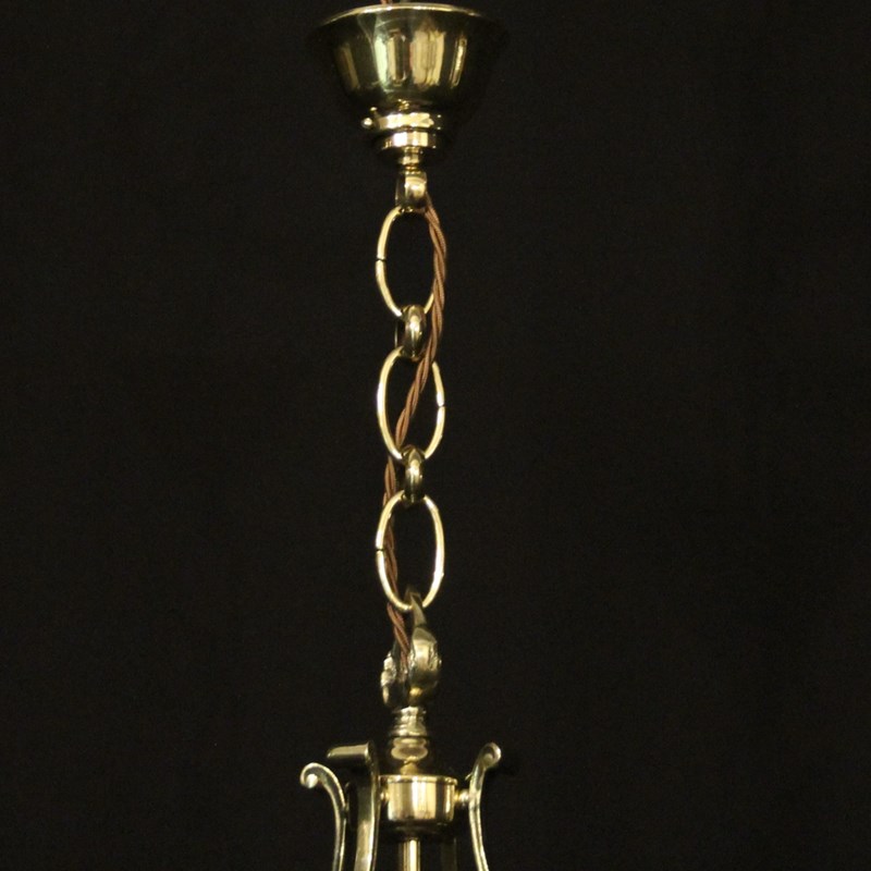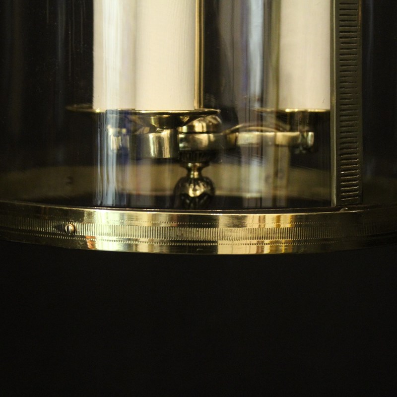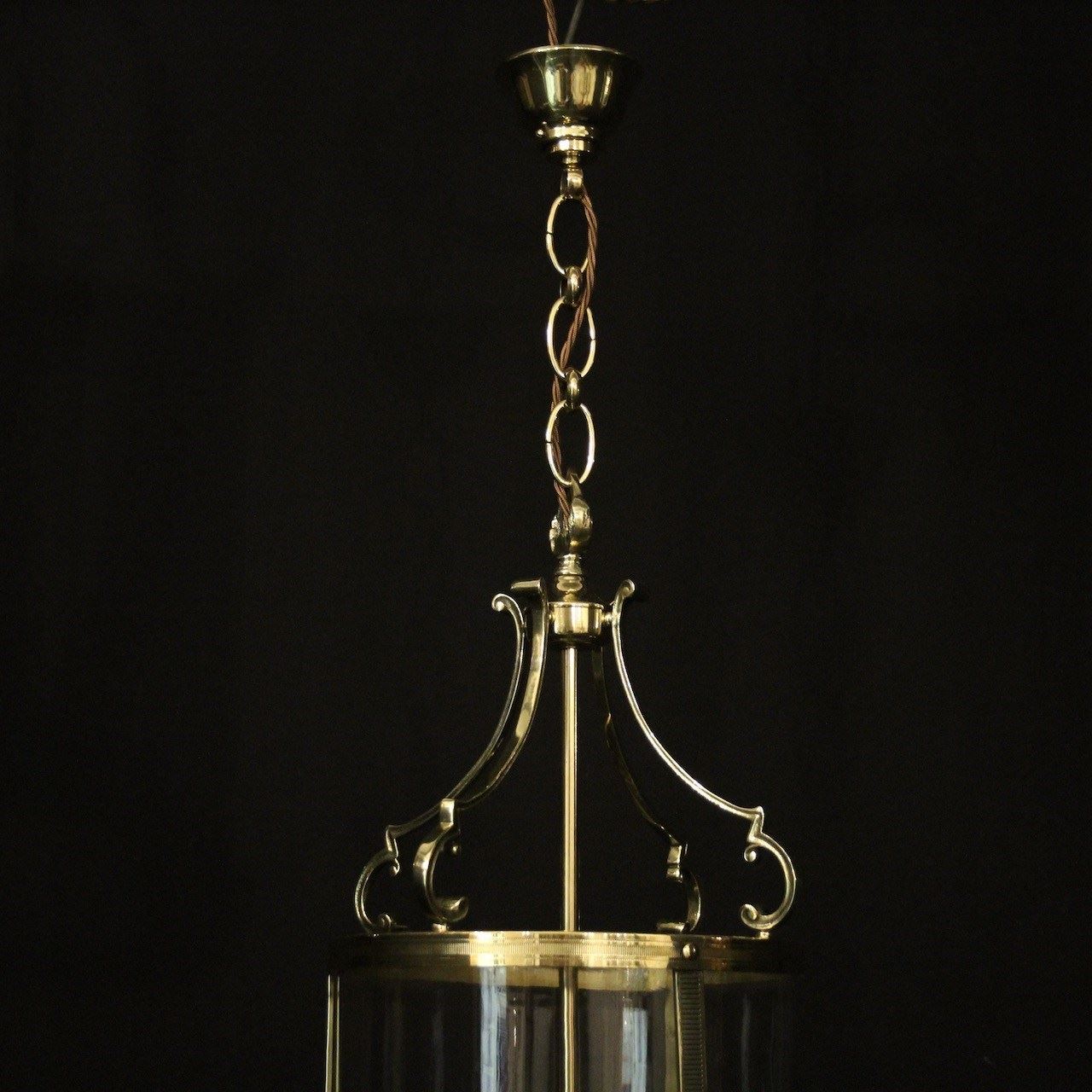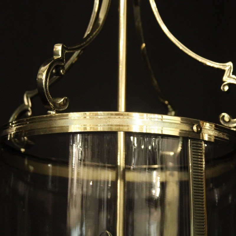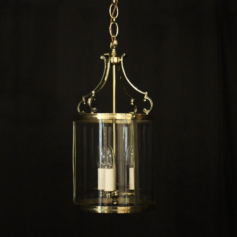 A French repolished brass triple light antique hall lantern, the three light fittings with circular bobeche drip pans, surrounded by a single circular convex glass panel, held within a decorative scrolling framework with reeded banding, reeded side sections and acorn central finial with a square gauge scrolling canopy and having the original chain and ceiling rose. Fully rewired and PAT tested. All our lanterns come with bulbs and ceiling fixings.