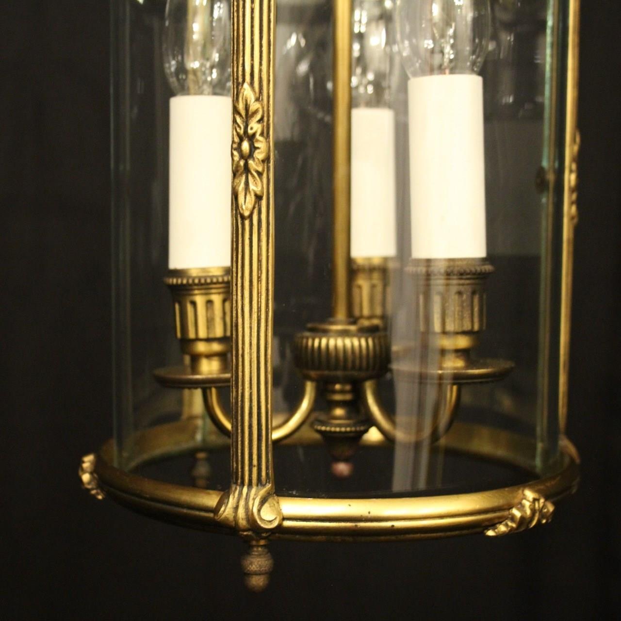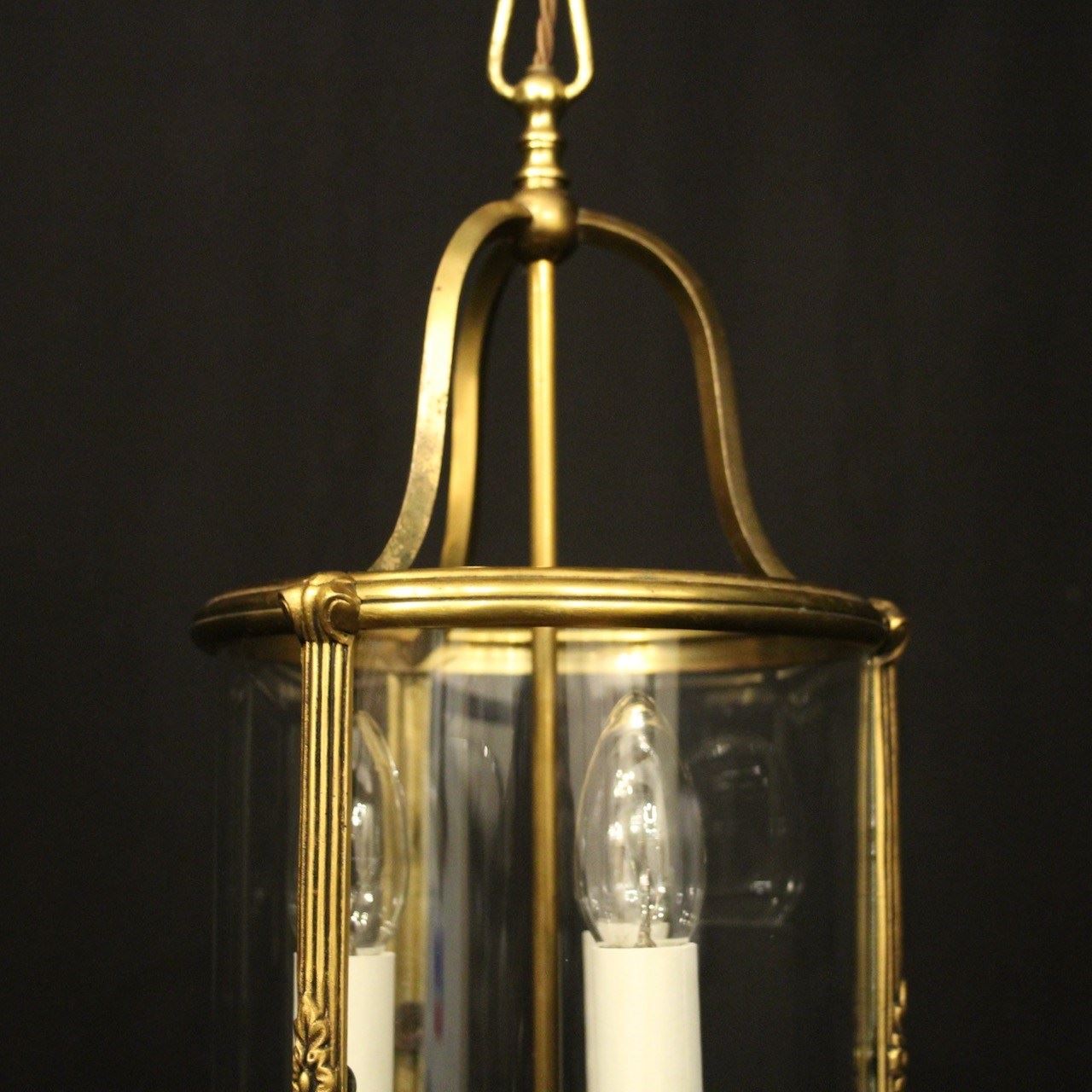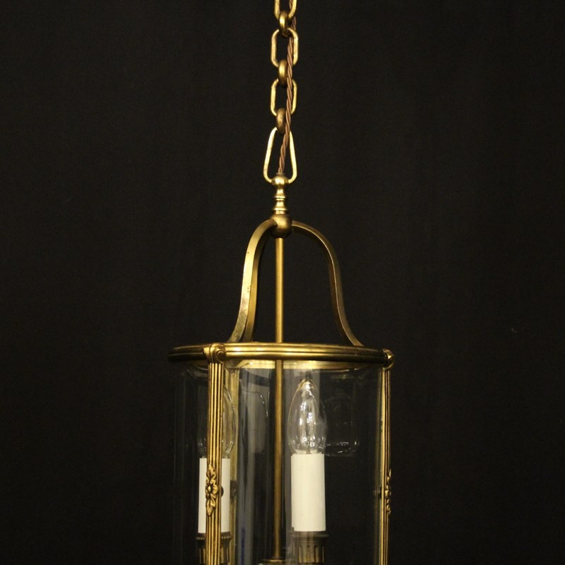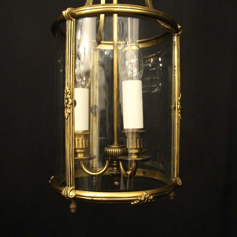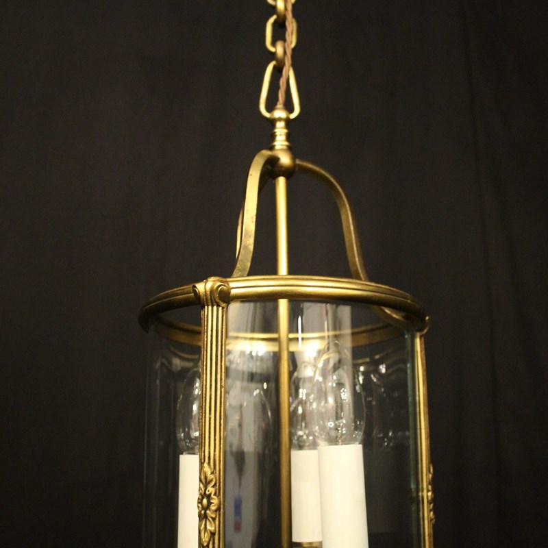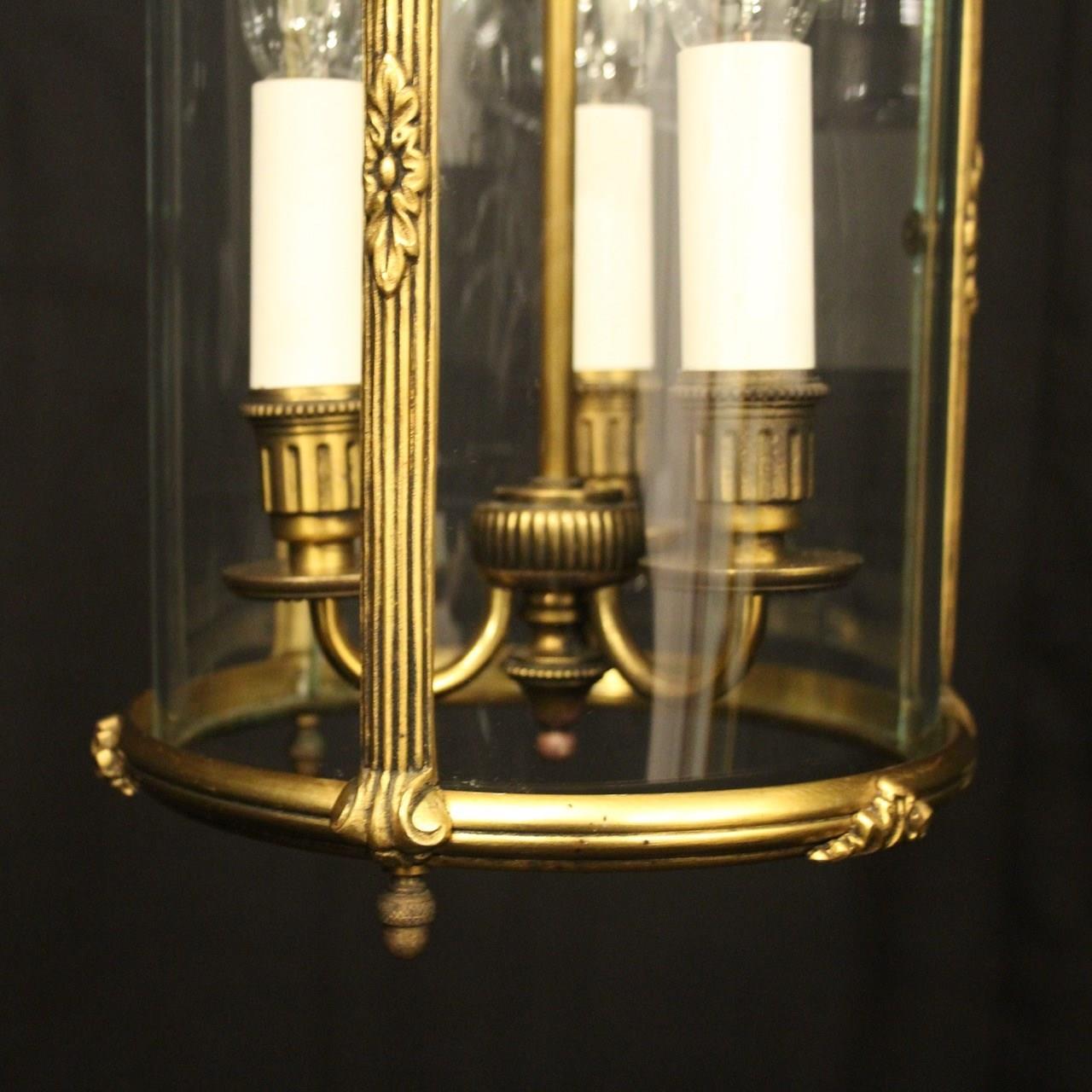 A French gilded bronze triple light antique hall lantern, the three scrolling light fittings with circular bobeche drip pans and reeded candle sconces, surrounded by a sectional circular convex glass panels and held within a decorative scrolling framework with reeded side panels, acorn finials and open scrolling canopy, having the original chain and ceiling rose. Fully rewired and PAT tested. All our lanterns come with bulbs and ceiling fixings.