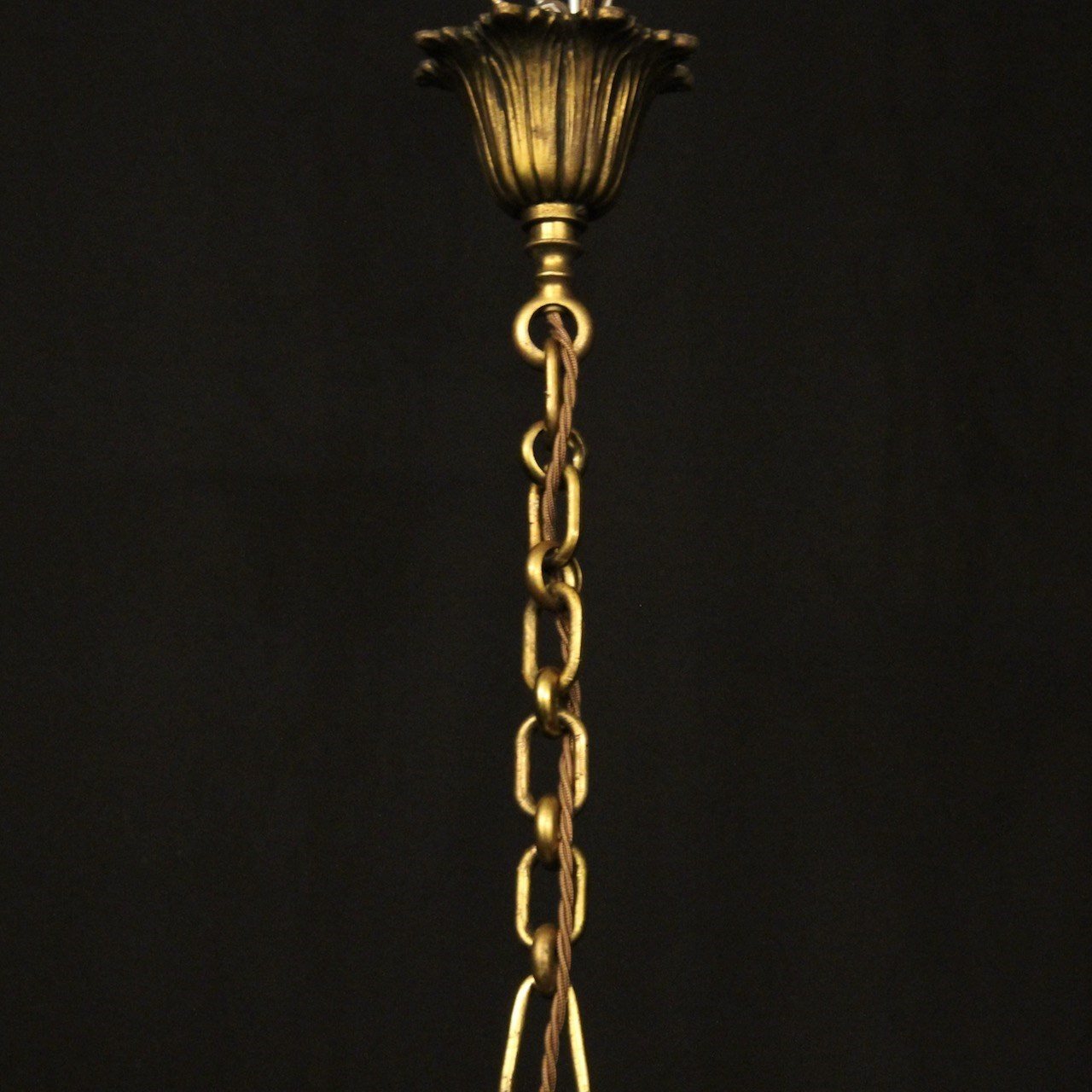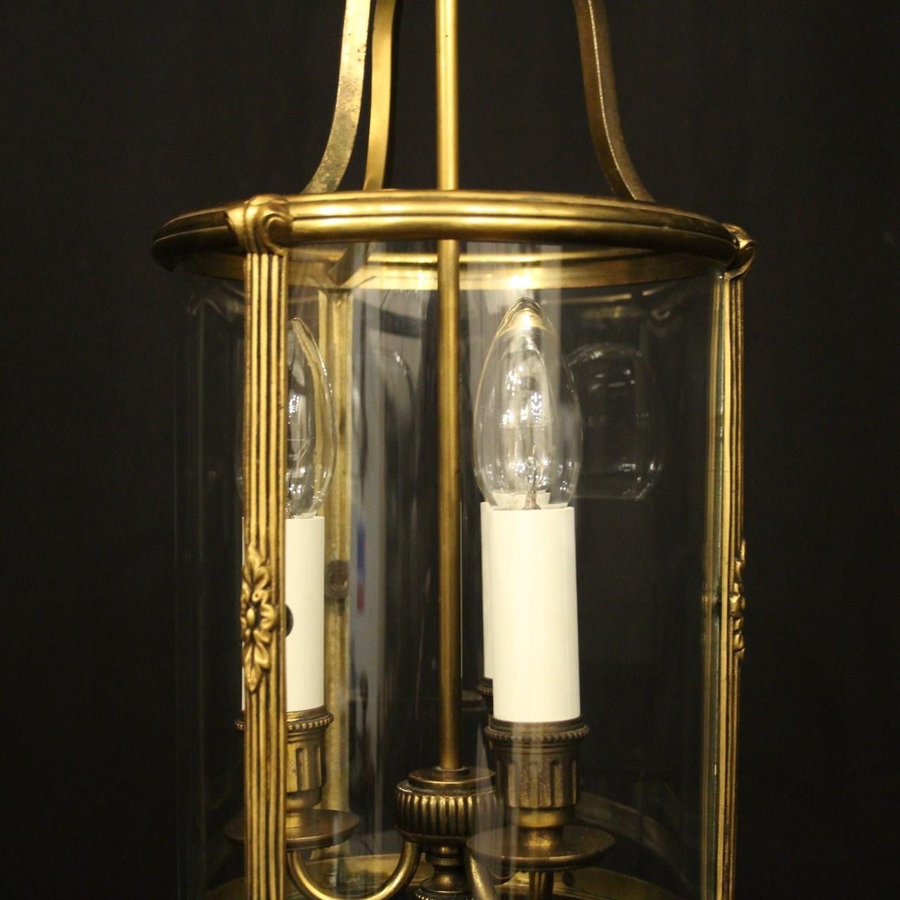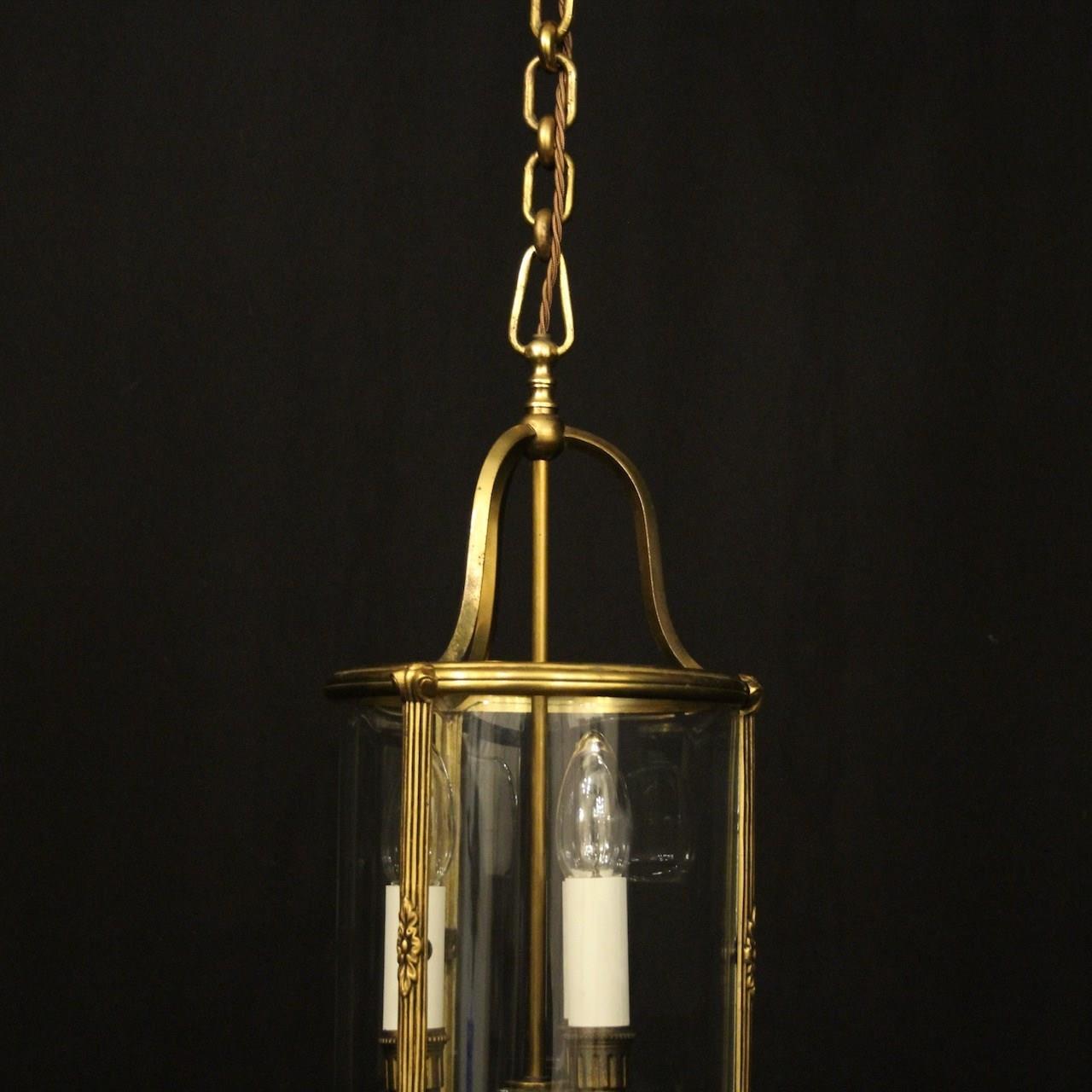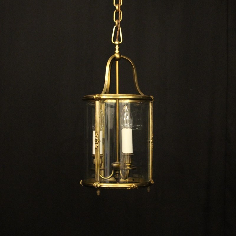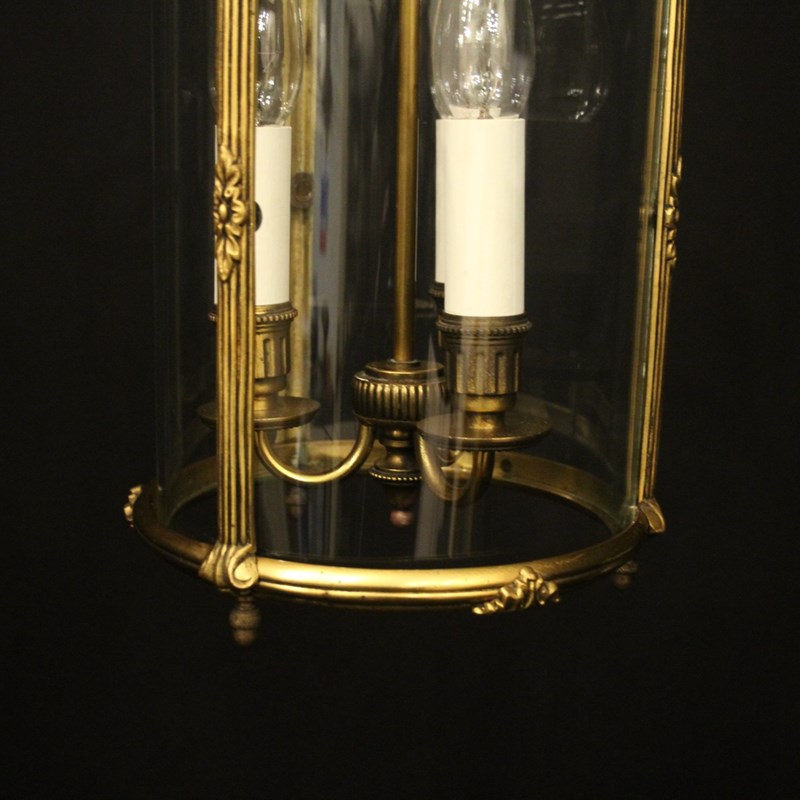 A French gilded bronze triple light antique hall lantern, the three scrolling light fittings with circular bobeche drip pans and reeded candle sconces, surrounded by a sectional circular convex glass panels and held within a decorative scrolling framework with reeded side panels, acorn finials and open scrolling canopy, having the original chain and ceiling rose. Fully rewired and PAT tested. All our lanterns come with bulbs and ceiling fixings.