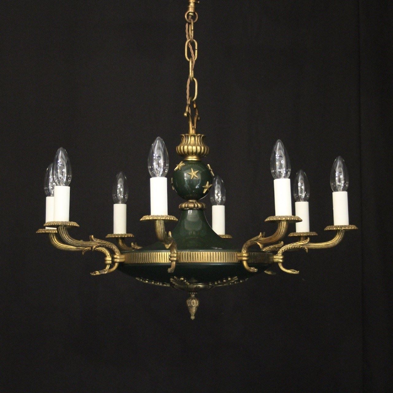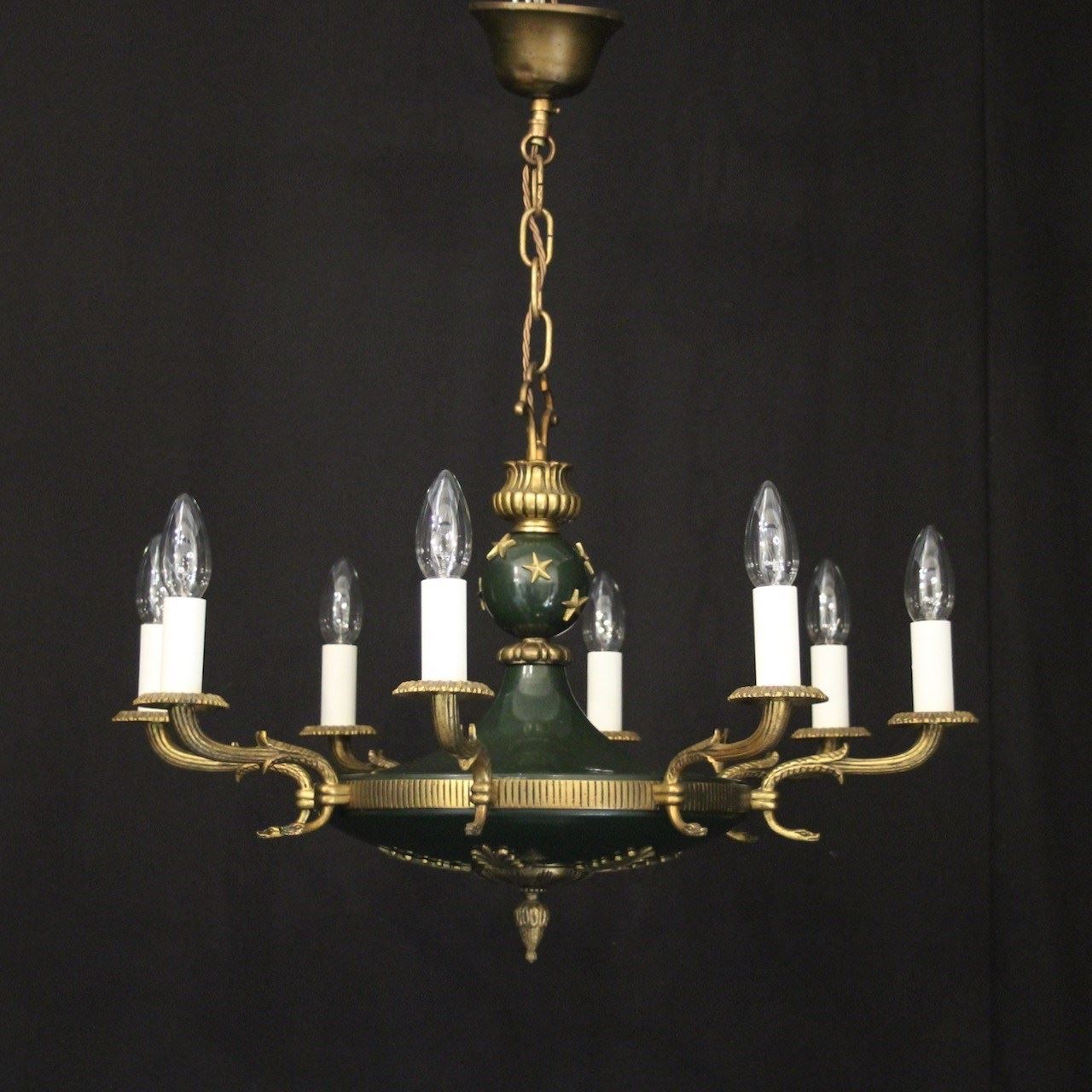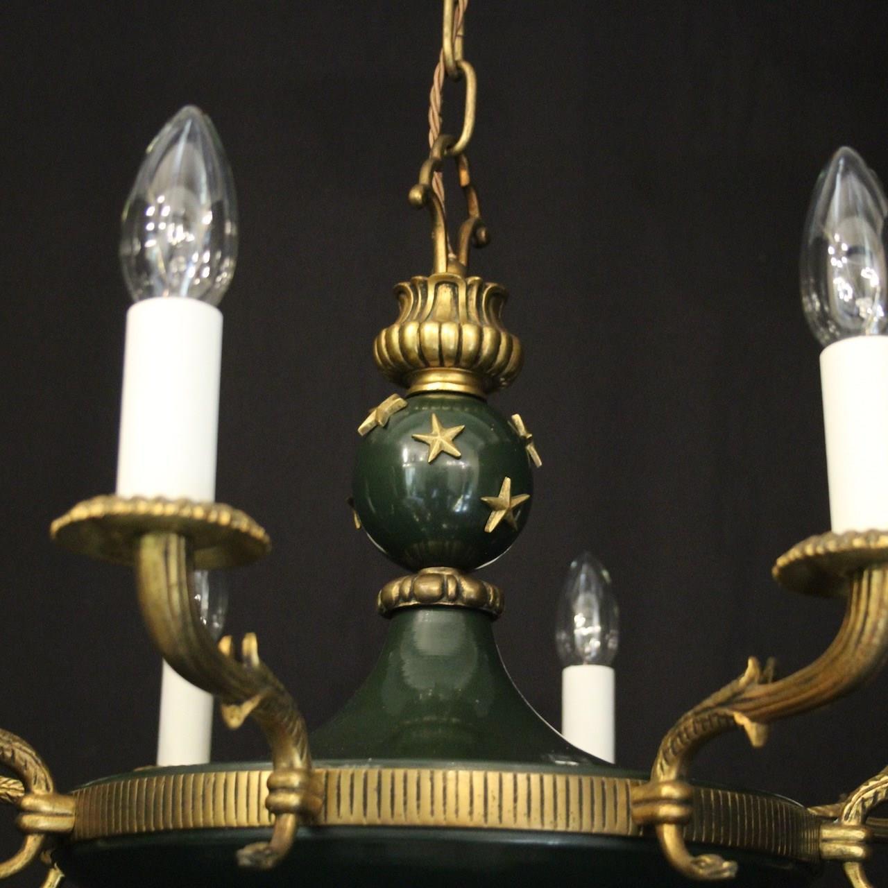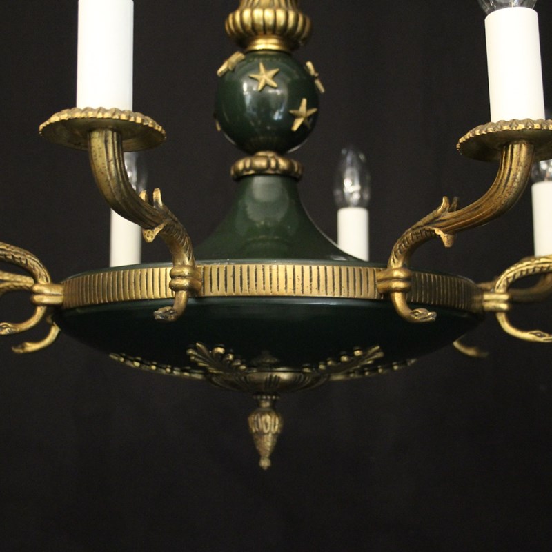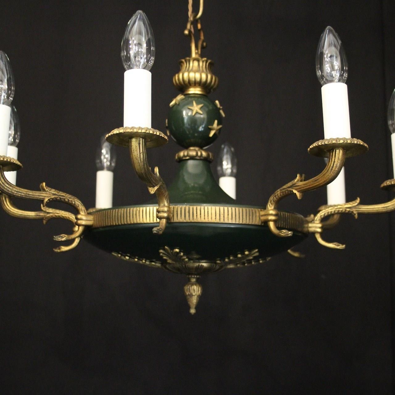 A French Empire gilded brass and dark green enamelled 8 light chandelier, the decorative tapering reeded leaf scrolling arms with circular bobeche drip pans, issuing from a bulbous star clad enamelled centre with pierced ring finial and ornate foliated Anthemion leaf base, with the original chain and ceiling rose. Fully rewired and PAT tested. All our chandeliers come with ceiling fixings and spare bulbs.