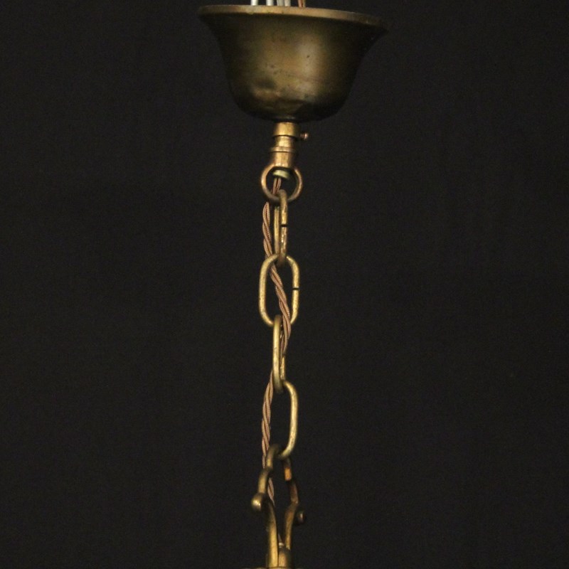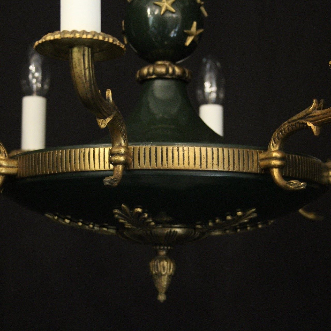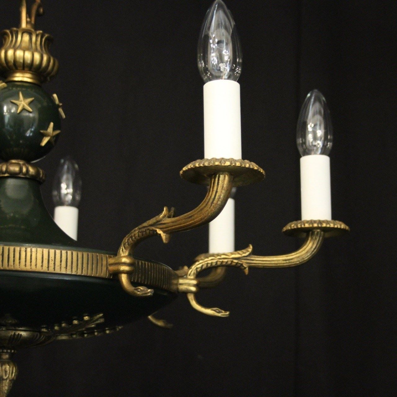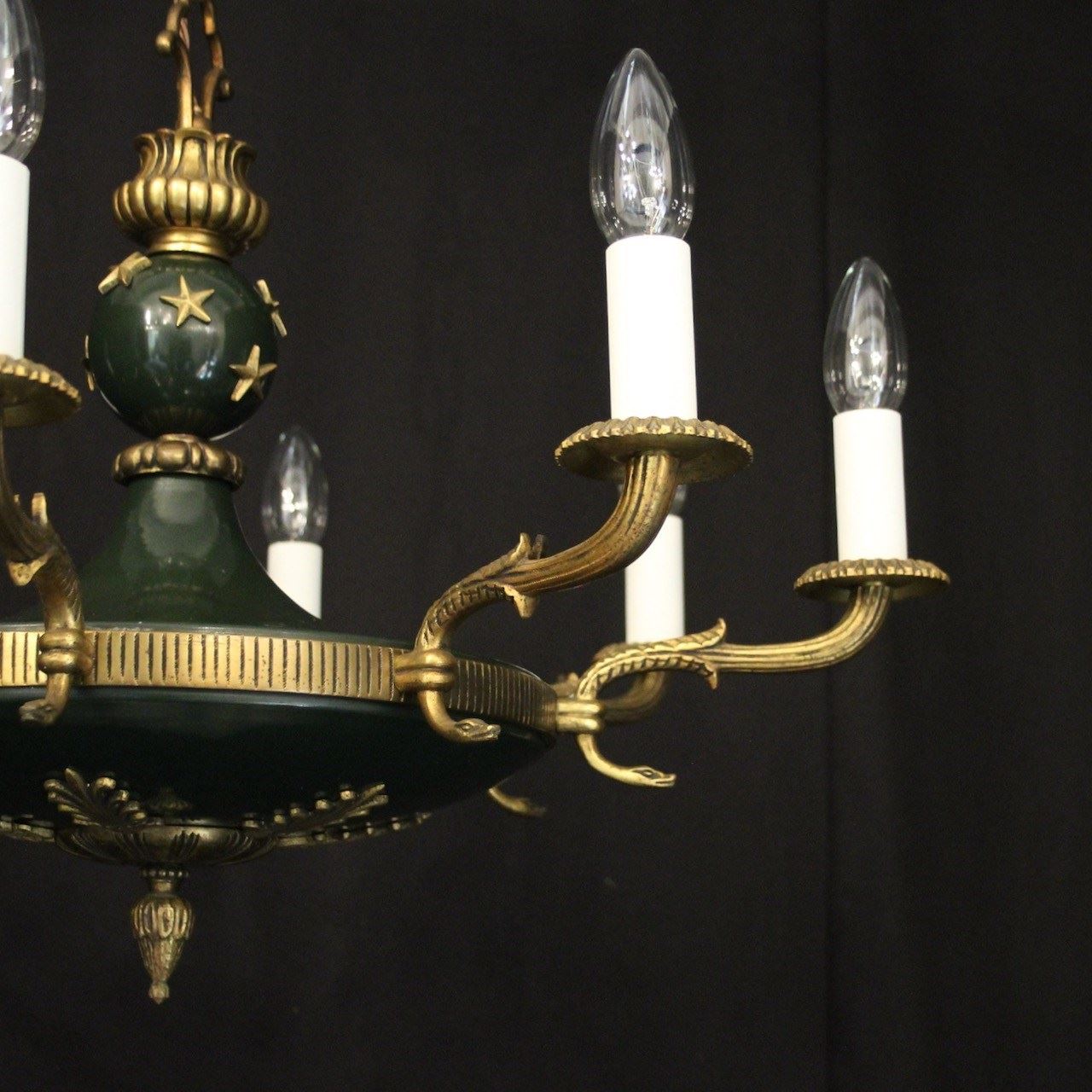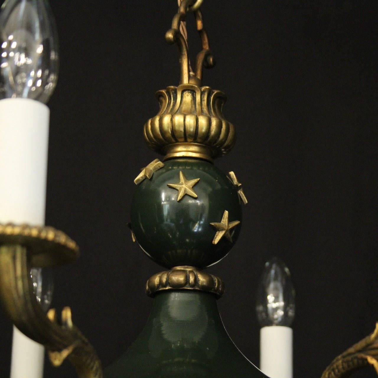 A French Empire gilded brass and dark green enamelled 8 light chandelier, the decorative tapering reeded leaf scrolling arms with circular bobeche drip pans, issuing from a bulbous star clad enamelled centre with pierced ring finial and ornate foliated Anthemion leaf base, with the original chain and ceiling rose. Fully rewired and PAT tested. All our chandeliers come with ceiling fixings and spare bulbs.