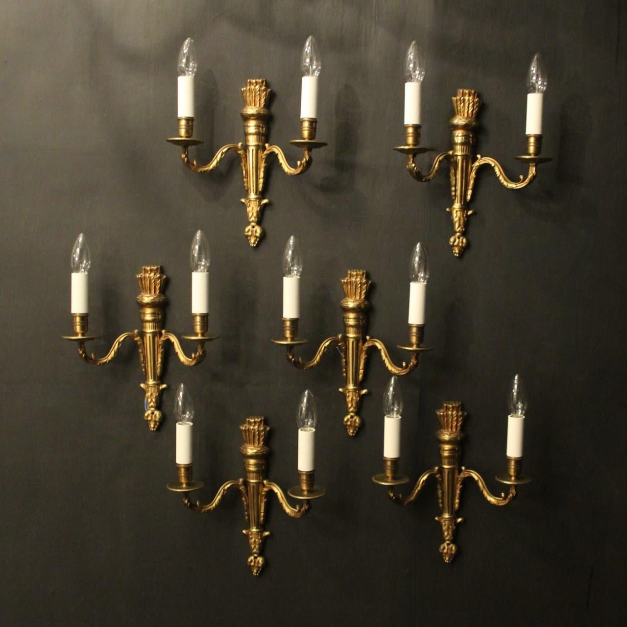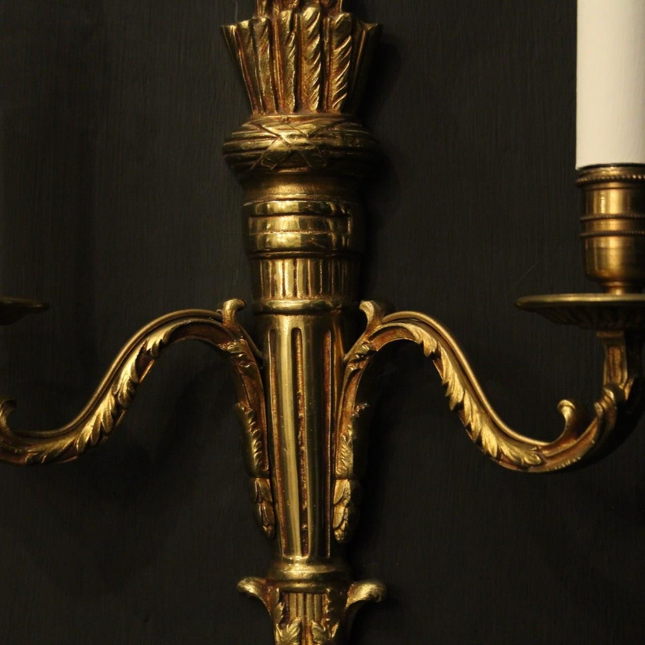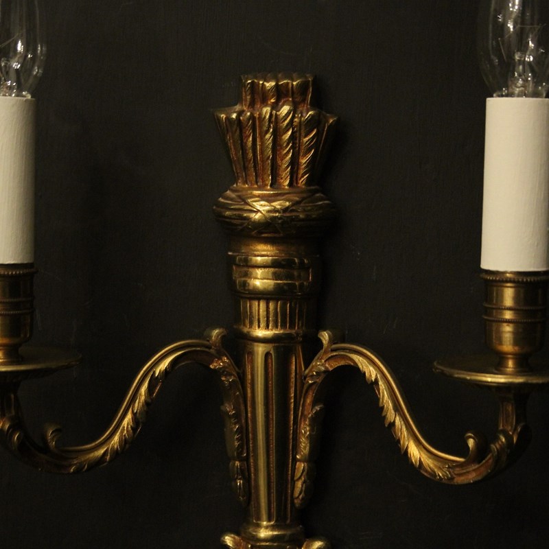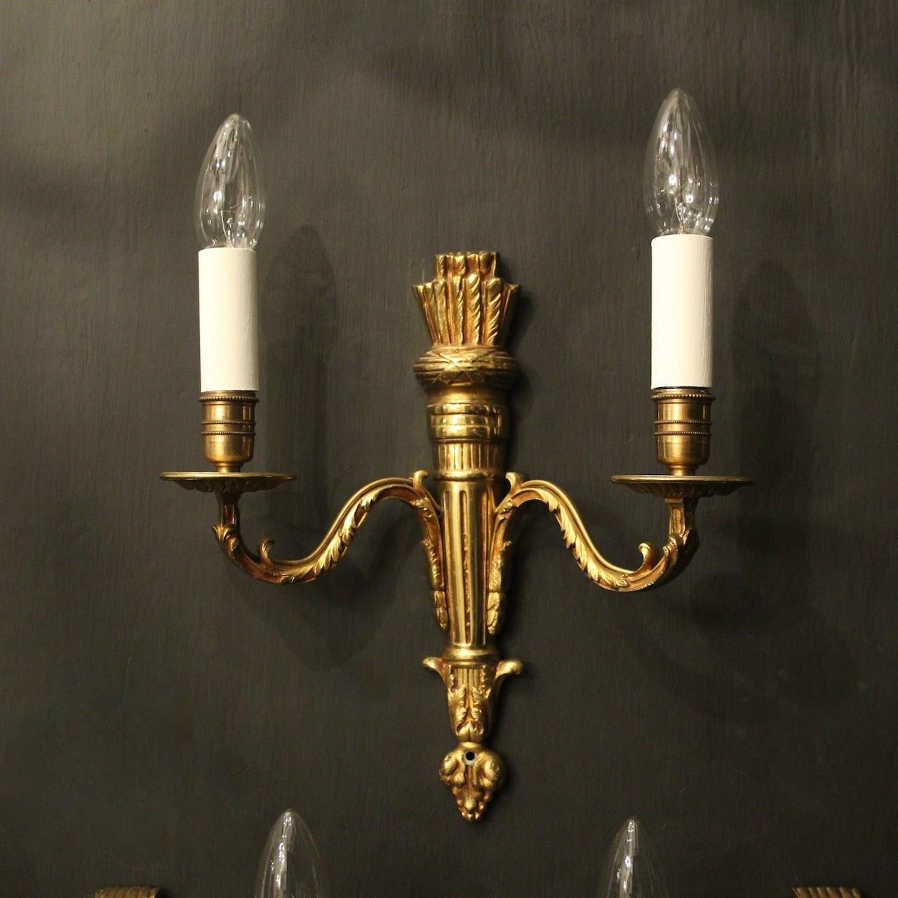 A French set of 6 Empire gilded brass twin arm antique wall lights, the leaf scrolling arms with circular leaf bobeche drip pans and reeded millgrain candle sconces, issuing from a tapering reeded arrow sheath backplate with arrow feather top, nice original gilded patination. Fully rewired and PAT tested. All our wall lights come with aged brass screws for fixing and spare bulbs.
