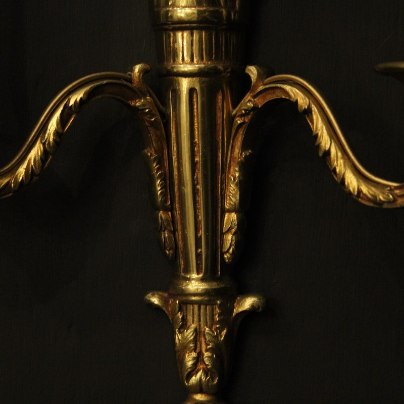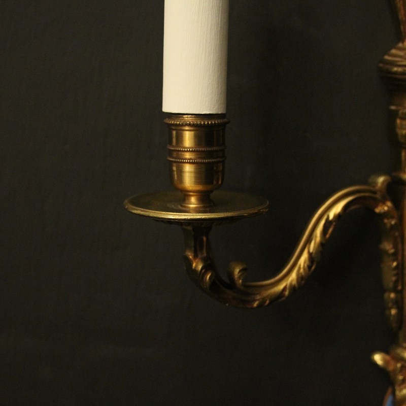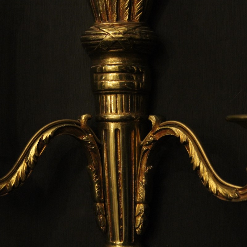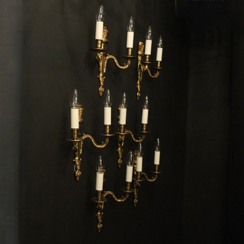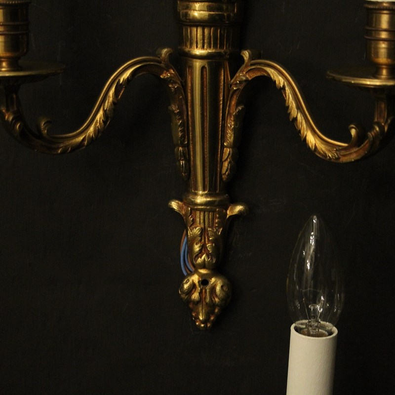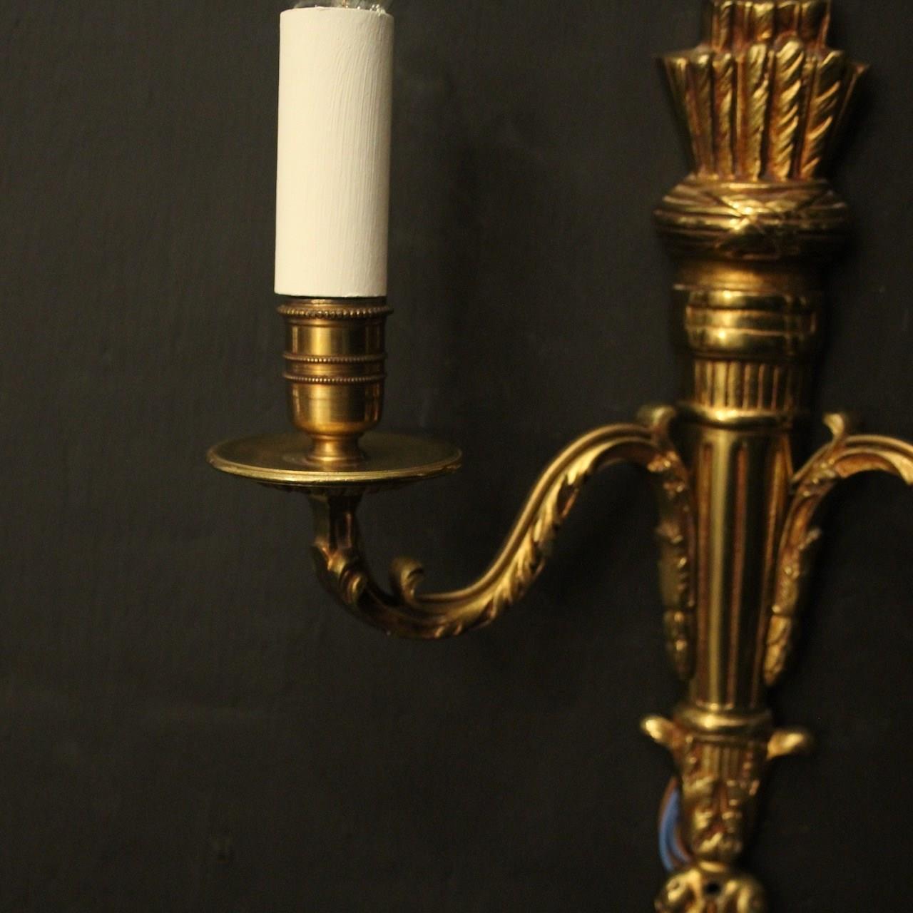 A French set of 6 Empire gilded brass twin arm antique wall lights, the leaf scrolling arms with circular leaf bobeche drip pans and reeded millgrain candle sconces, issuing from a tapering reeded arrow sheath backplate with arrow feather top, nice original gilded patination. Fully rewired and PAT tested. All our wall lights come with aged brass screws for fixing and spare bulbs.