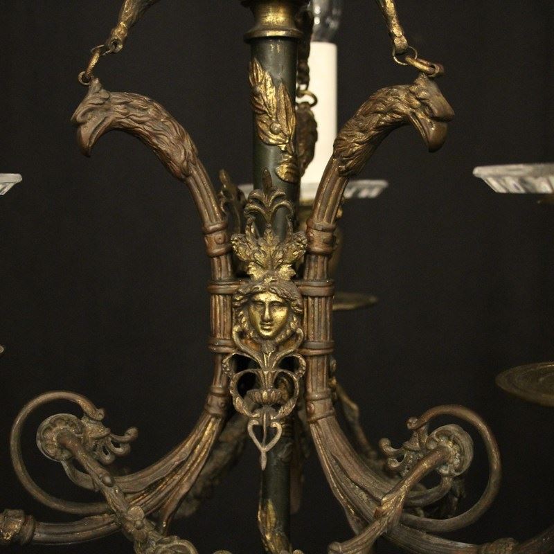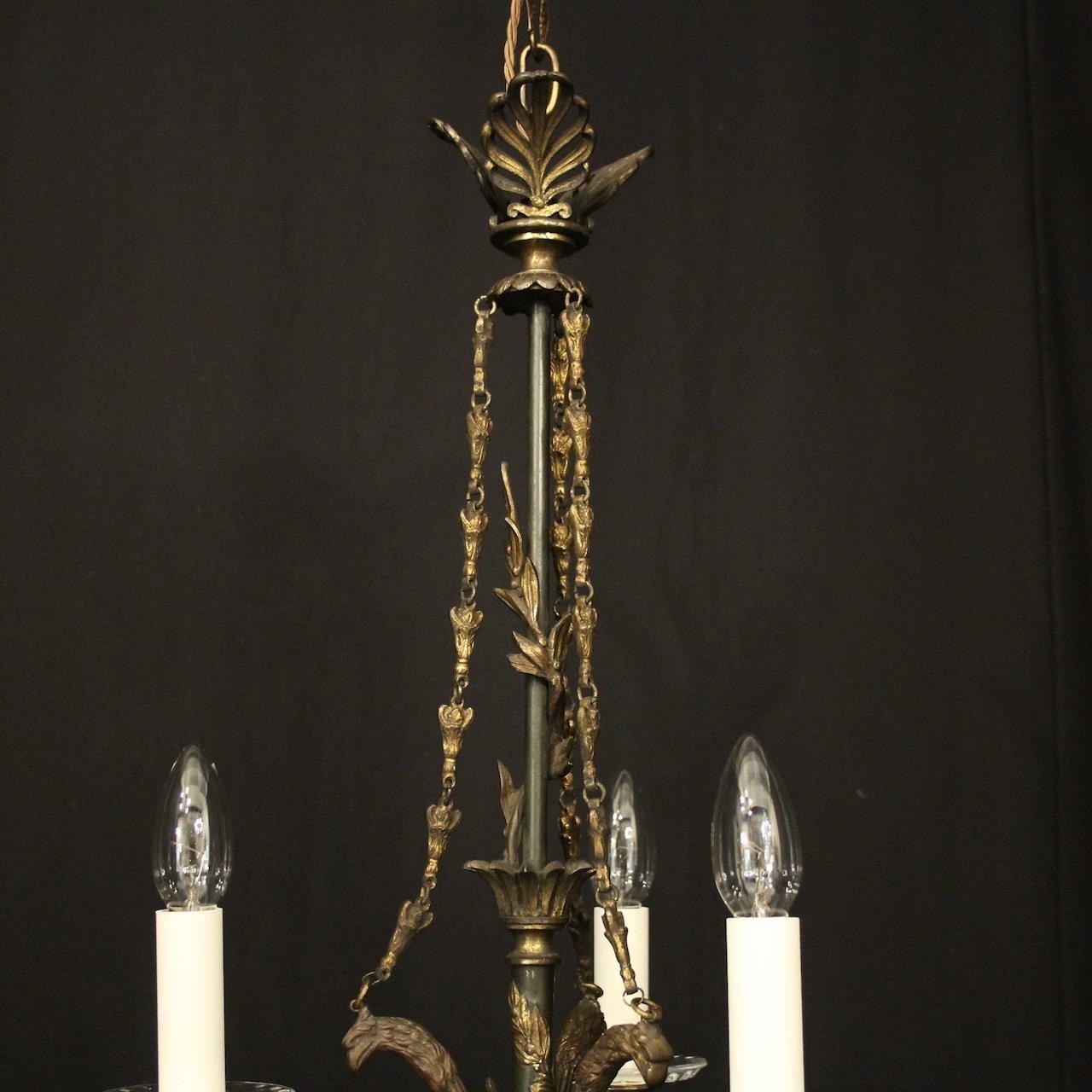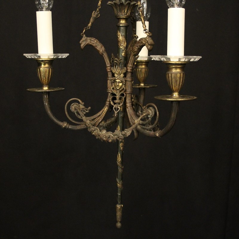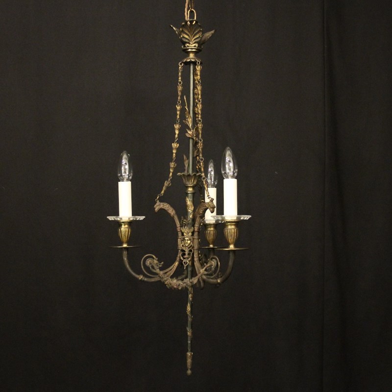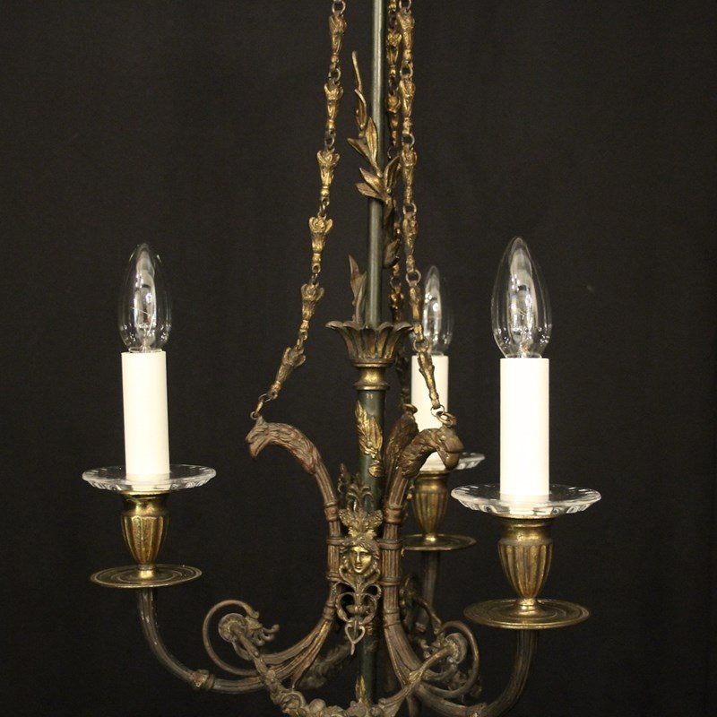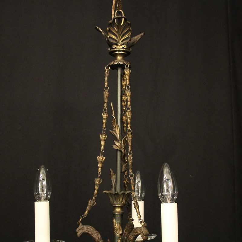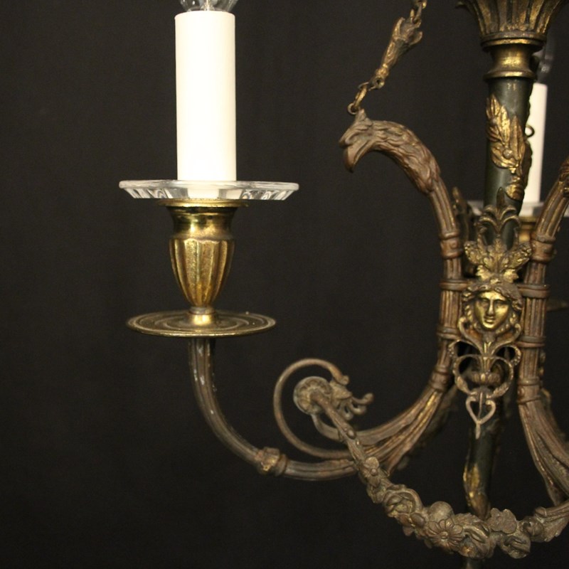 A lovely French Empire gilded bronze and dark green enamelled triple light late 19th Century antique chandelier, the eagle headed reeded scrolling arms with crystal bobeche drip pans and reeded bulbous candle sconces, issuing from a decorative leaf pierced mask headed centre, with tapering leaf base and having an ornate pierced Anthemion canopy, with the original chain and ceiling rose, nice quality and well cast. Fully rewired and PAT tested. All our chandeliers come with ceiling fixings and spare bulbs.