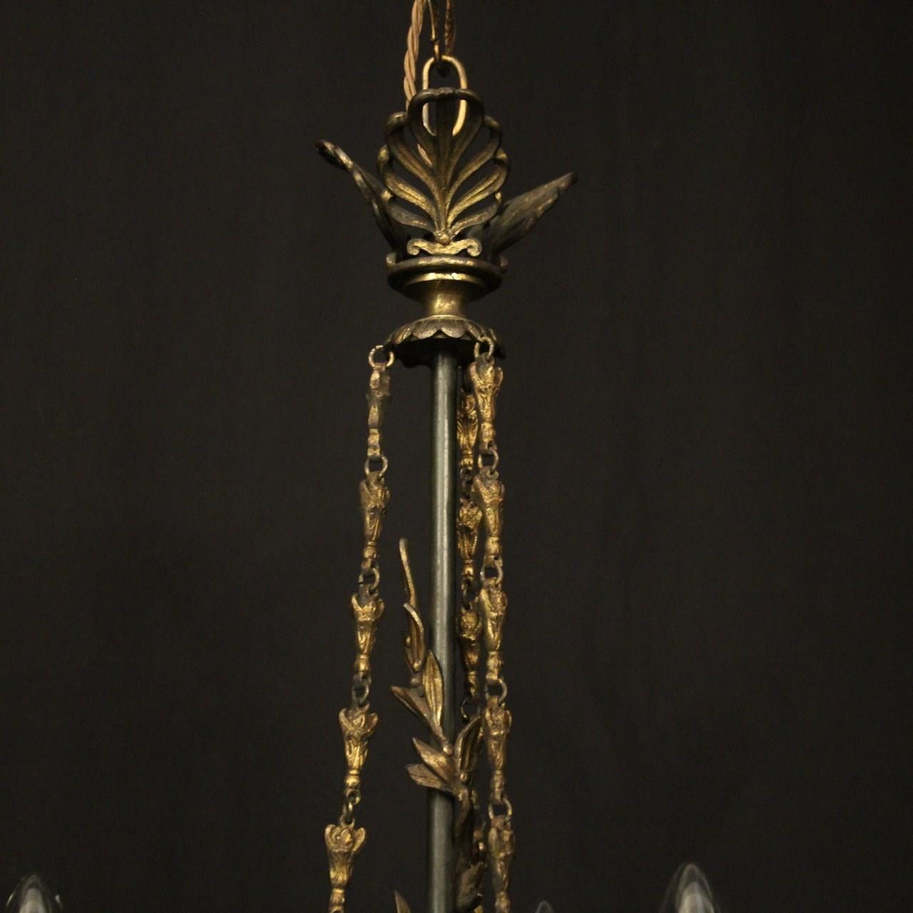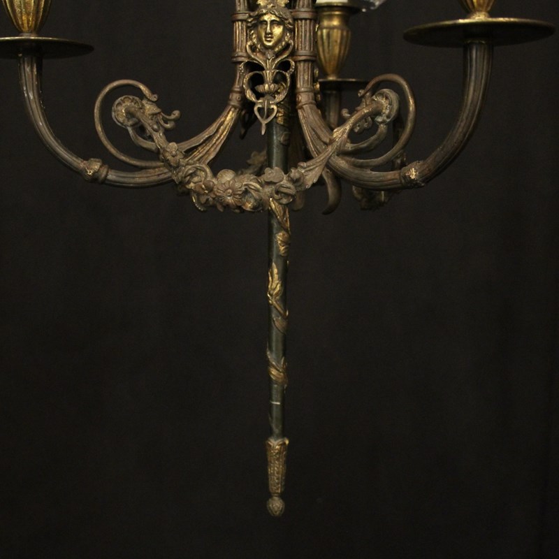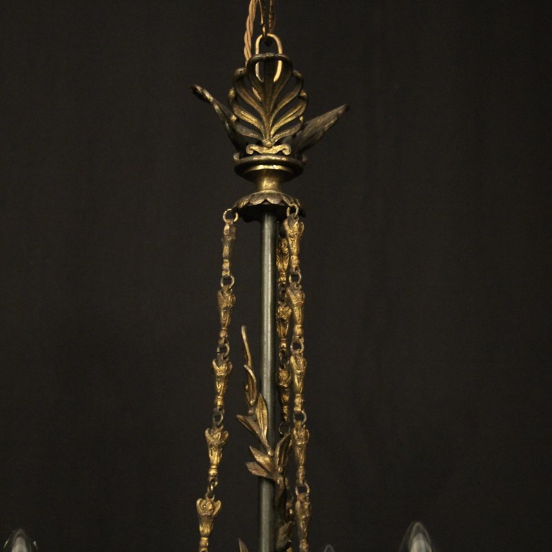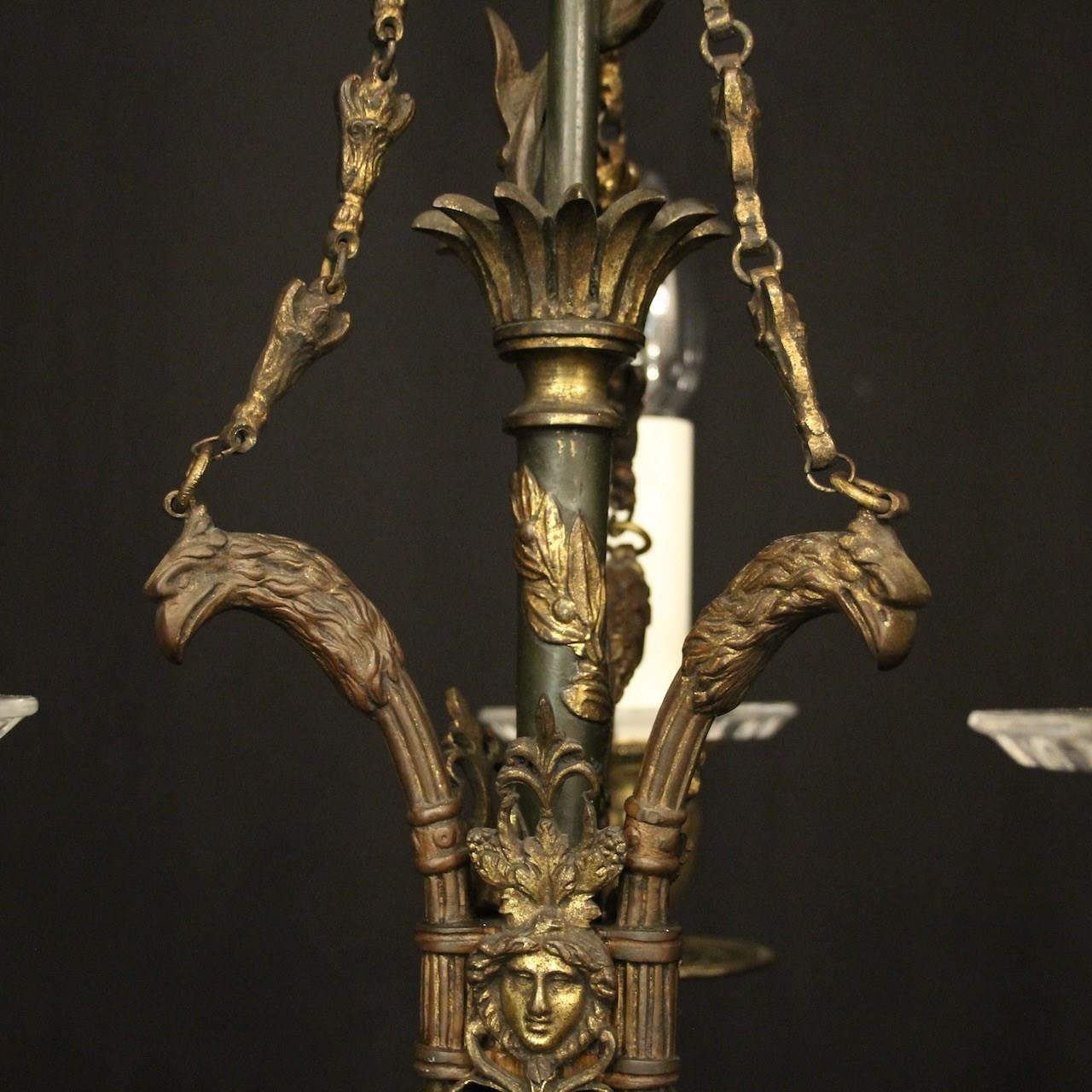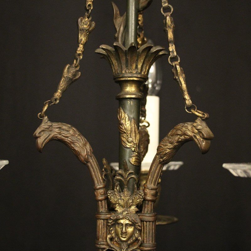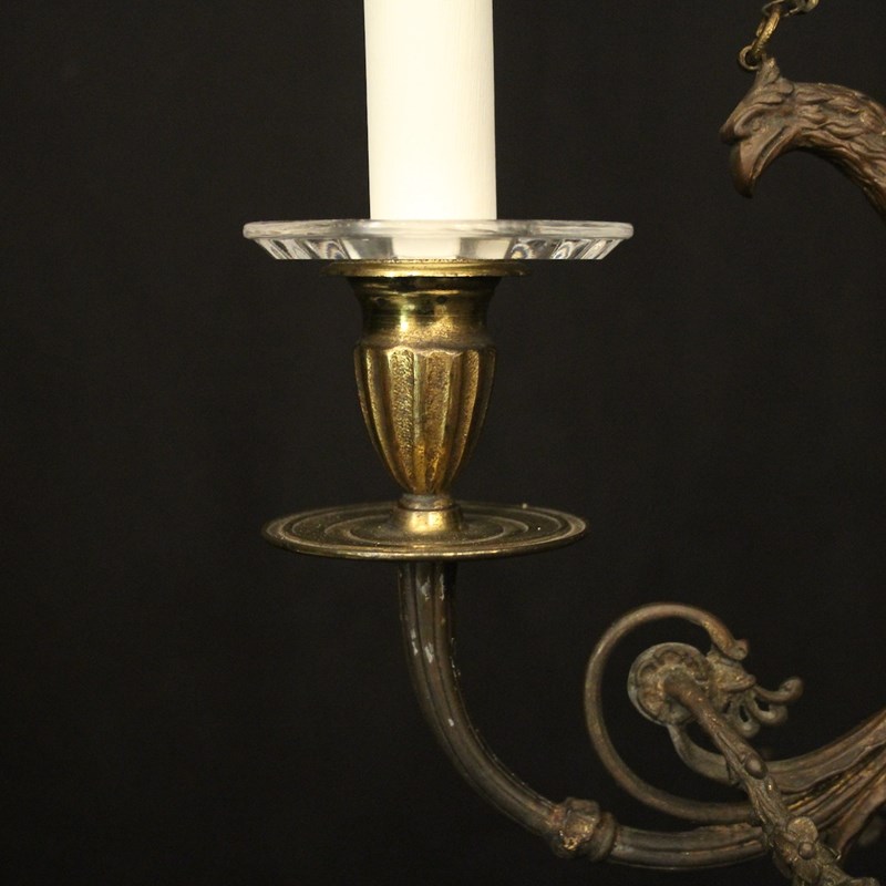 A lovely French Empire gilded bronze and dark green enamelled triple light late 19th Century antique chandelier, the eagle headed reeded scrolling arms with crystal bobeche drip pans and reeded bulbous candle sconces, issuing from a decorative leaf pierced mask headed centre, with tapering leaf base and having an ornate pierced Anthemion canopy, with the original chain and ceiling rose, nice quality and well cast. Fully rewired and PAT tested. All our chandeliers come with ceiling fixings and spare bulbs.