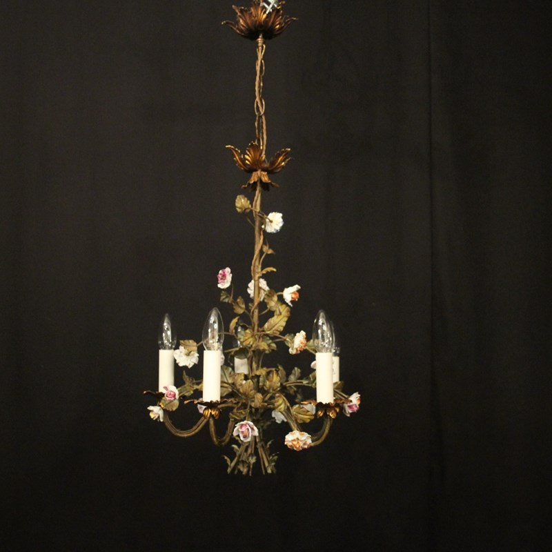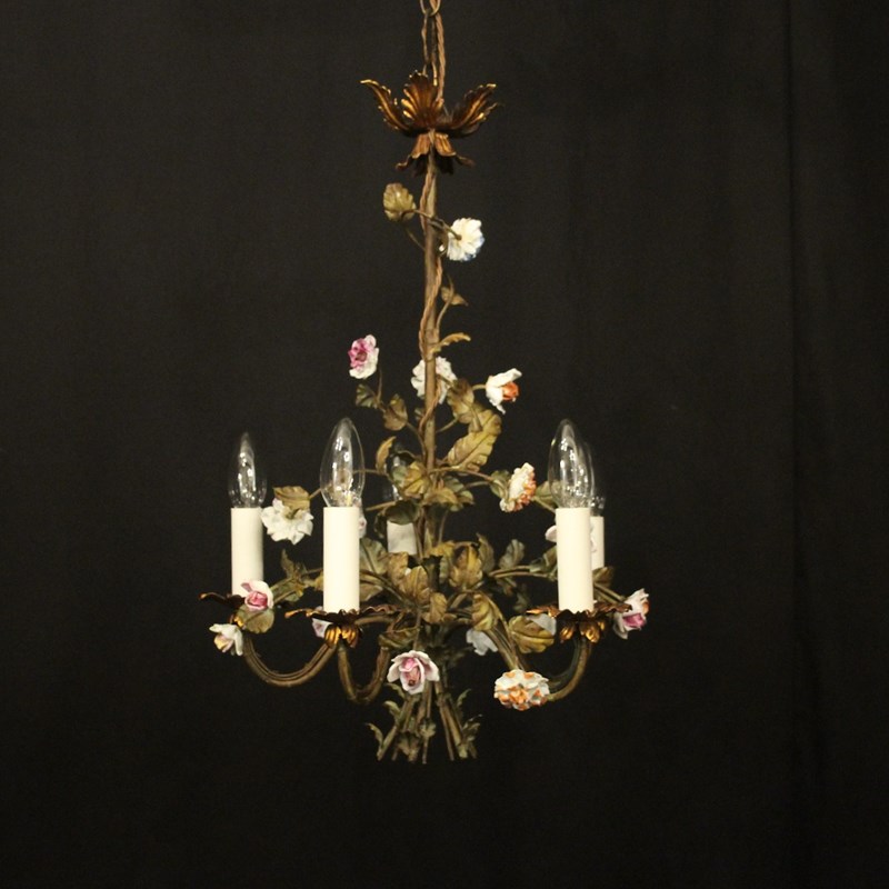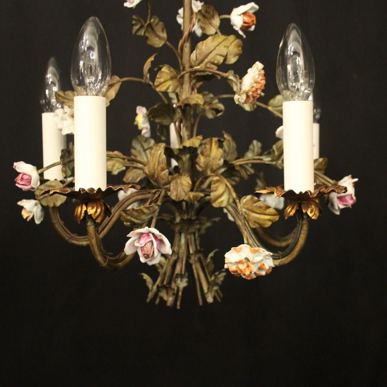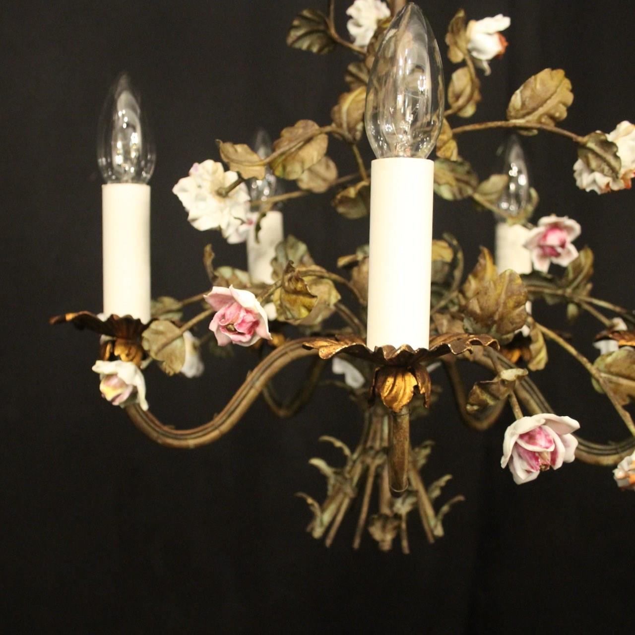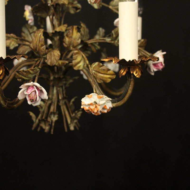 A decorative French polychrome toleware floral five light chandelier, the leaf scrolling arms with sectional leaf bobeche drip pans, issuing from an ornate leaf centre with polychrome porcelain flower heads and having the original chain and ceiling rose. Lovely original patination and very pretty. Fully rewired and PAT tested. All our chandeliers come with bulbs and ceiling fixings.
