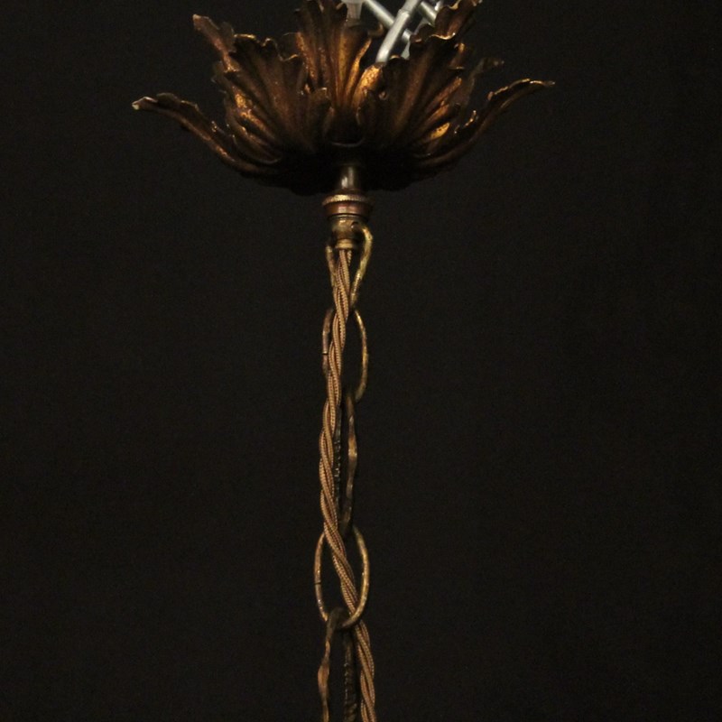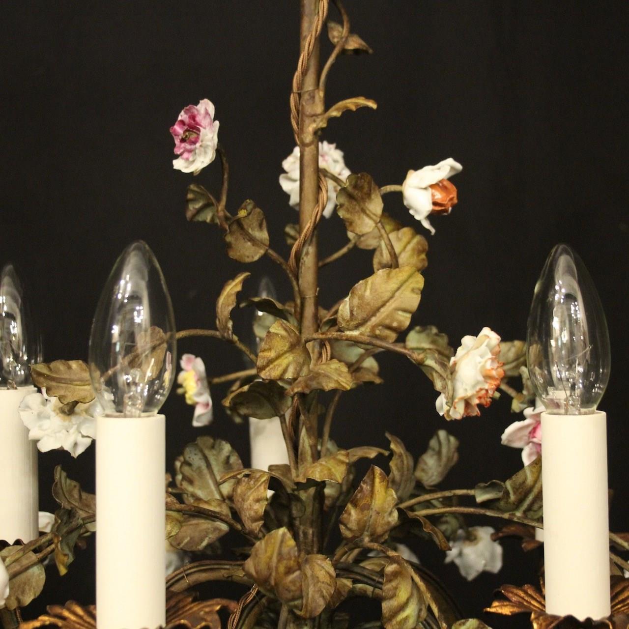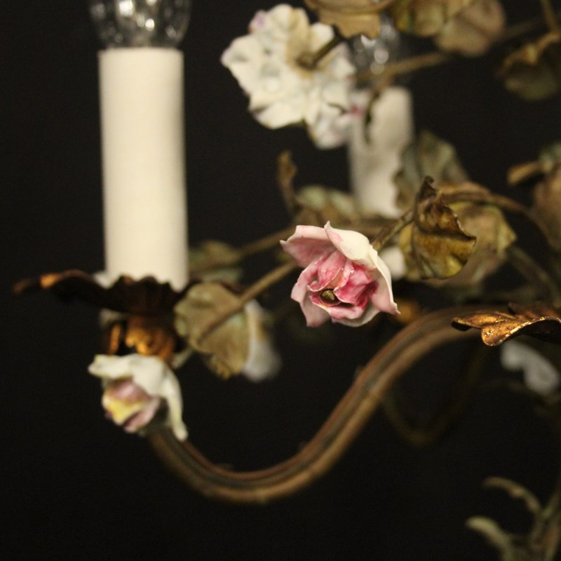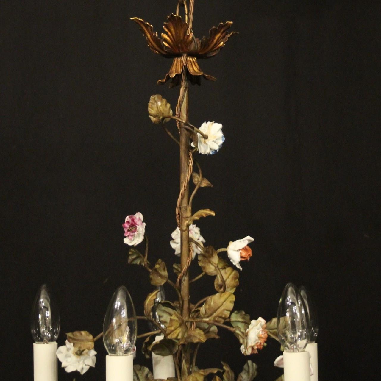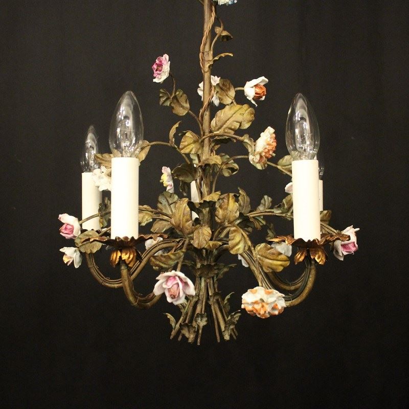A decorative French polychrome toleware floral five light chandelier, the leaf scrolling arms with sectional leaf bobeche drip pans, issuing from an ornate leaf centre with polychrome porcelain flower heads and having the original chain and ceiling rose. Lovely original patination and very pretty. Fully rewired and PAT tested. All our chandeliers come with bulbs and ceiling fixings.