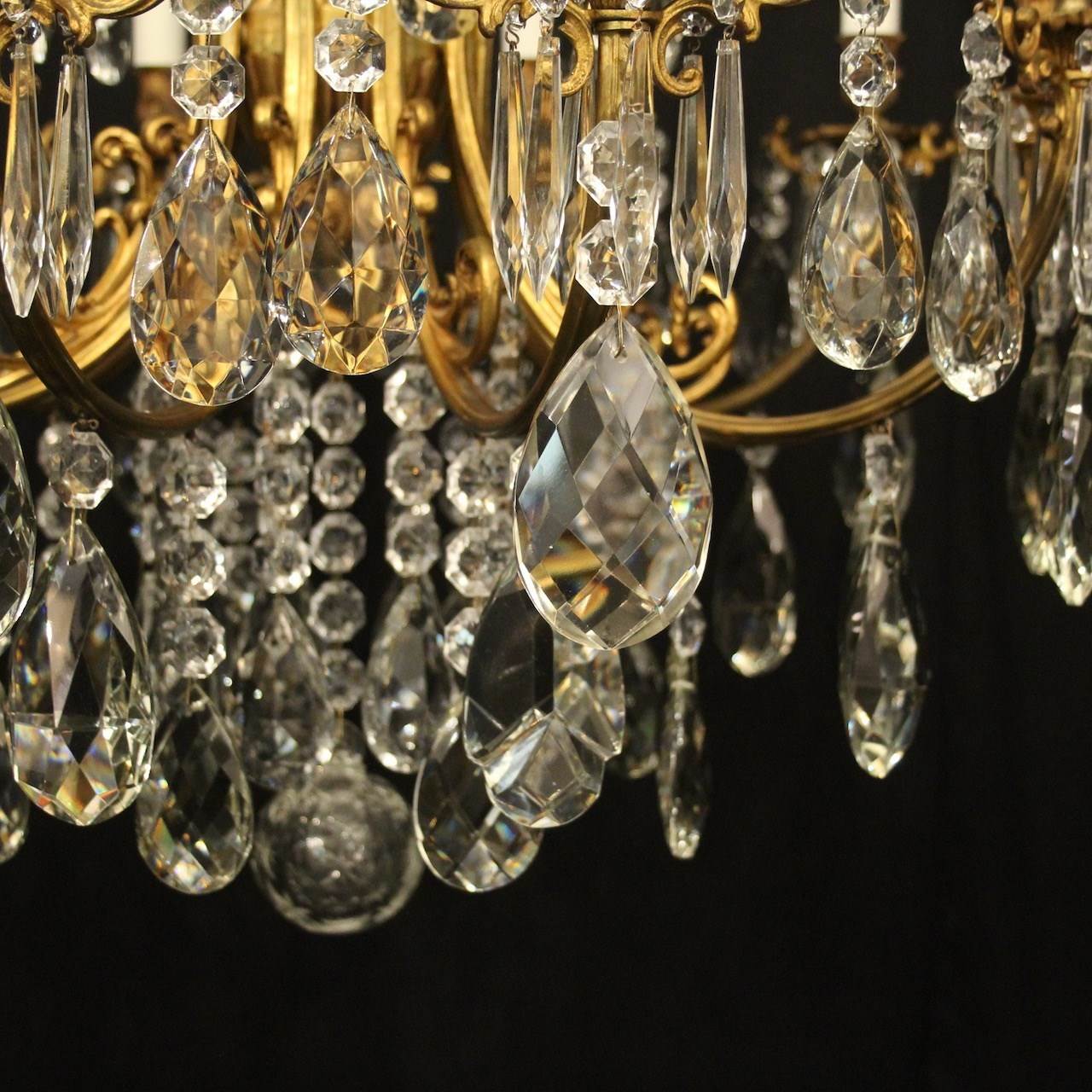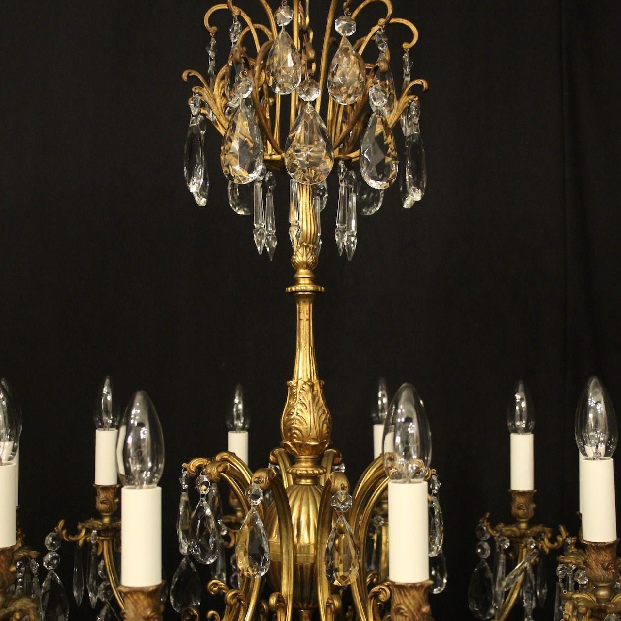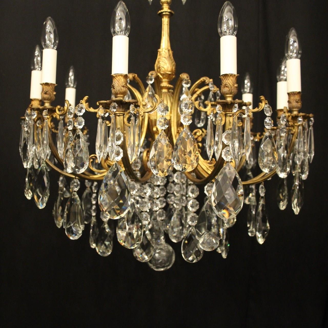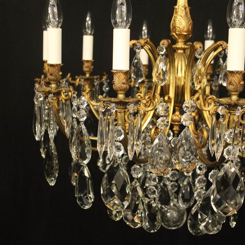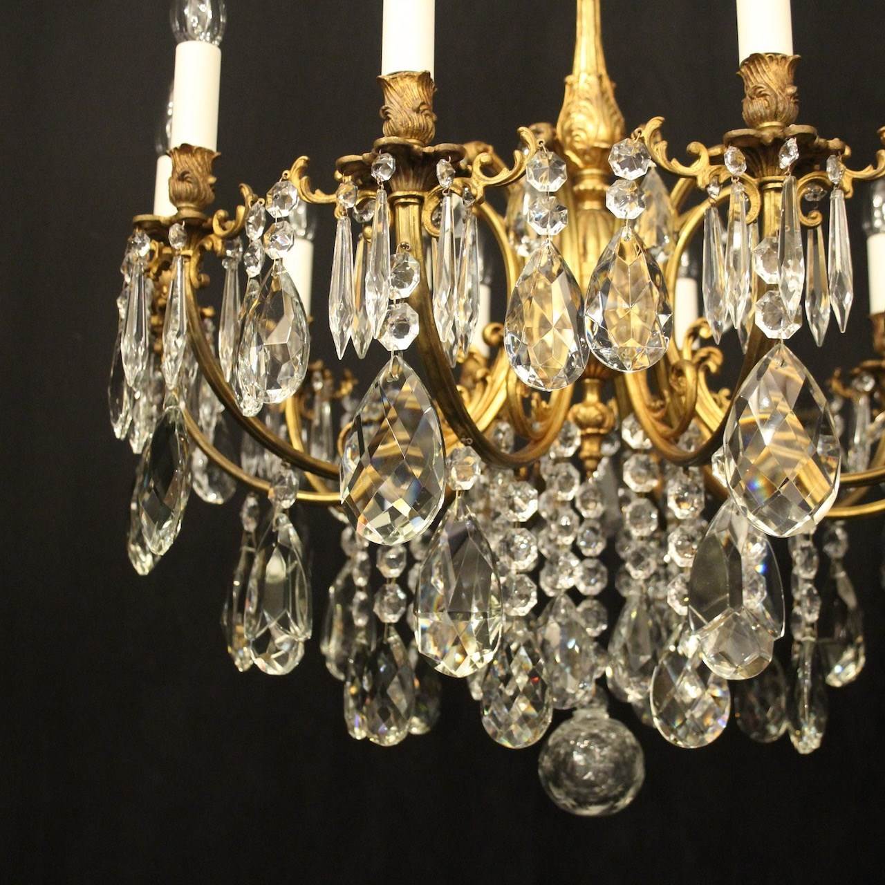 A quality French gilded bronze and crystal 10 light antique chandelier, the scrolling arms with trumpet leaf bobeche drip pans and bulbous candle sconces, issuing from a foliated central tapering column with ornate scrolling leaf canopy, decorated overall in faceted crystal pendants and having the original chain and ceiling rose. Great original patination and nice quality. Fully rewired and PAT tested. All our chandeliers come with ceiling fixings and spare bulbs.