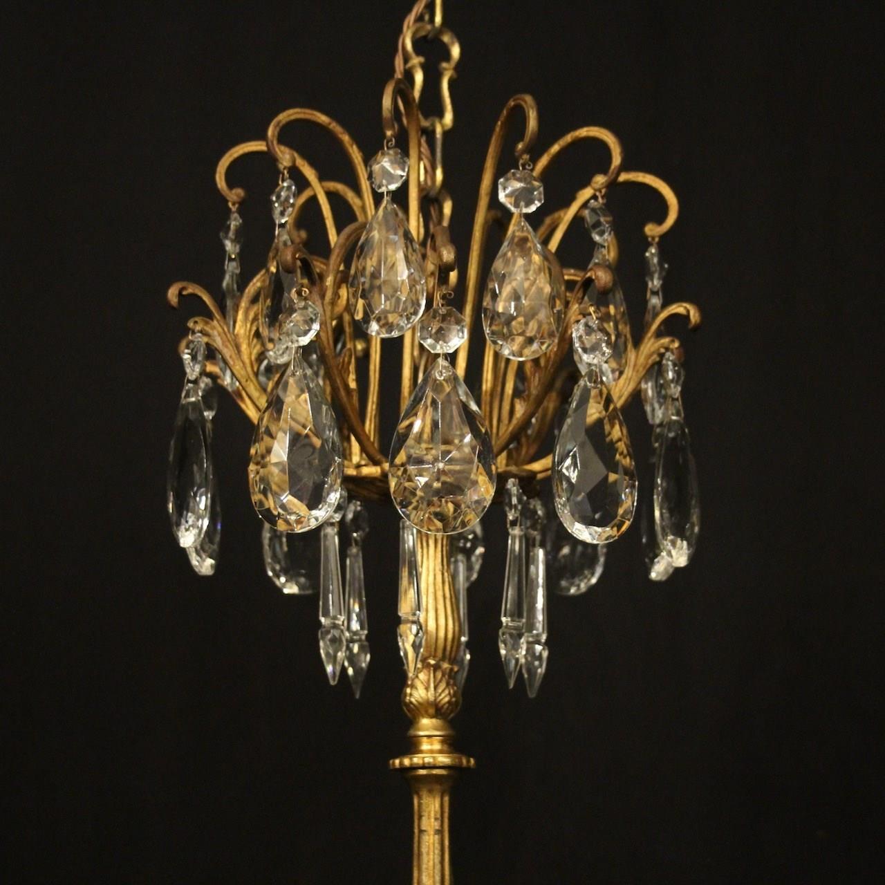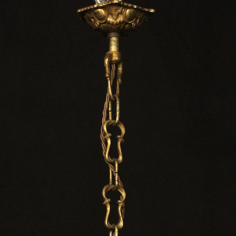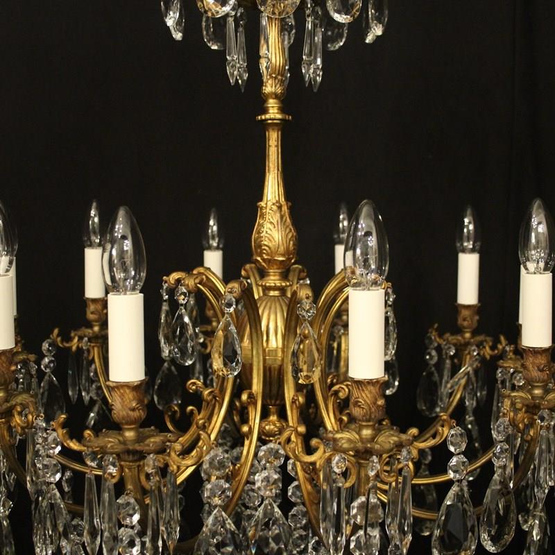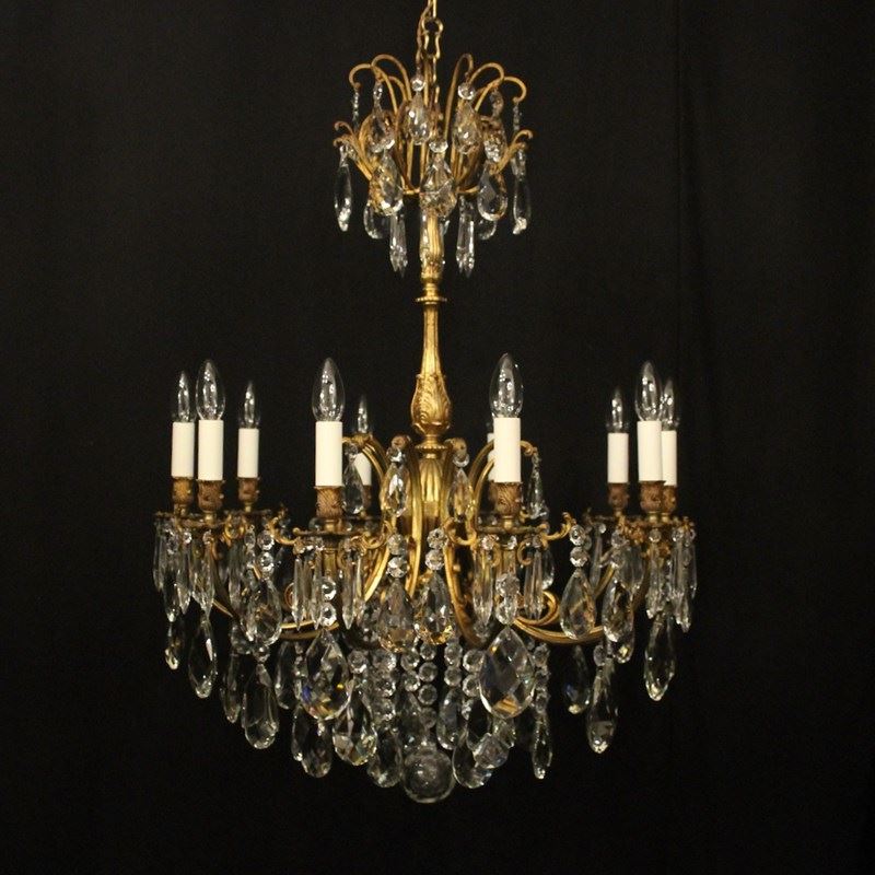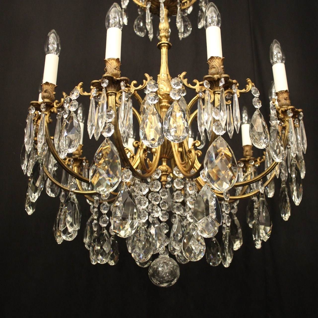 A quality French gilded bronze and crystal 10 light antique chandelier, the scrolling arms with trumpet leaf bobeche drip pans and bulbous candle sconces, issuing from a foliated central tapering column with ornate scrolling leaf canopy, decorated overall in faceted crystal pendants and having the original chain and ceiling rose. Great original patination and nice quality. Fully rewired and PAT tested. All our chandeliers come with ceiling fixings and spare bulbs.