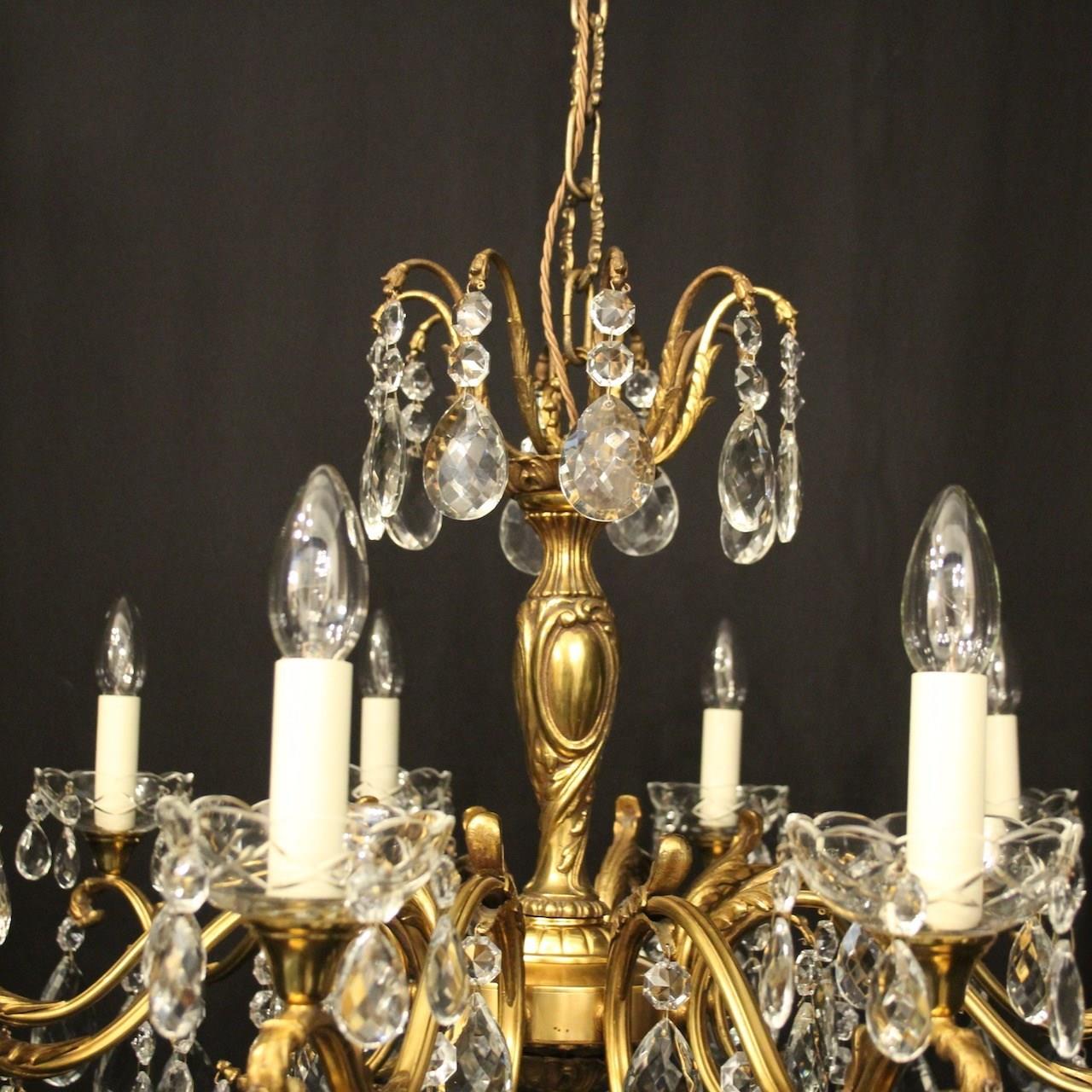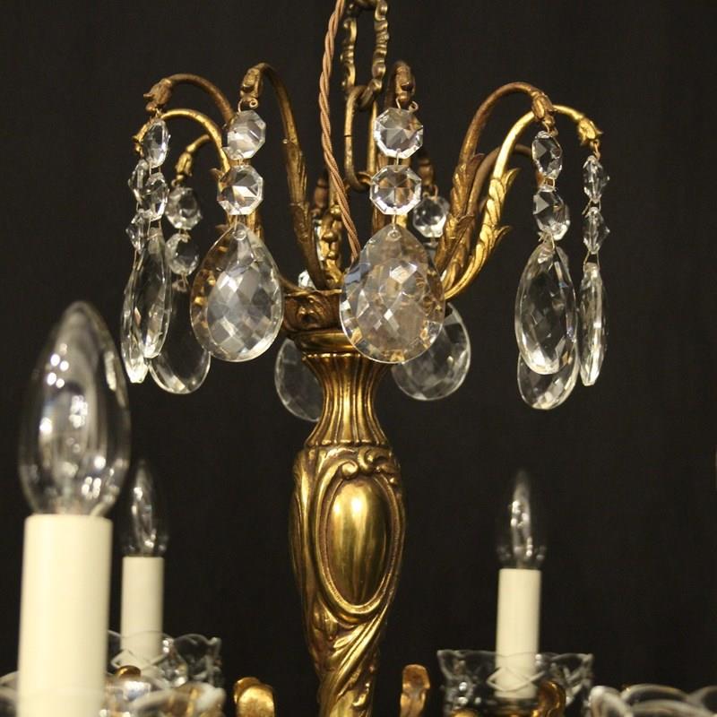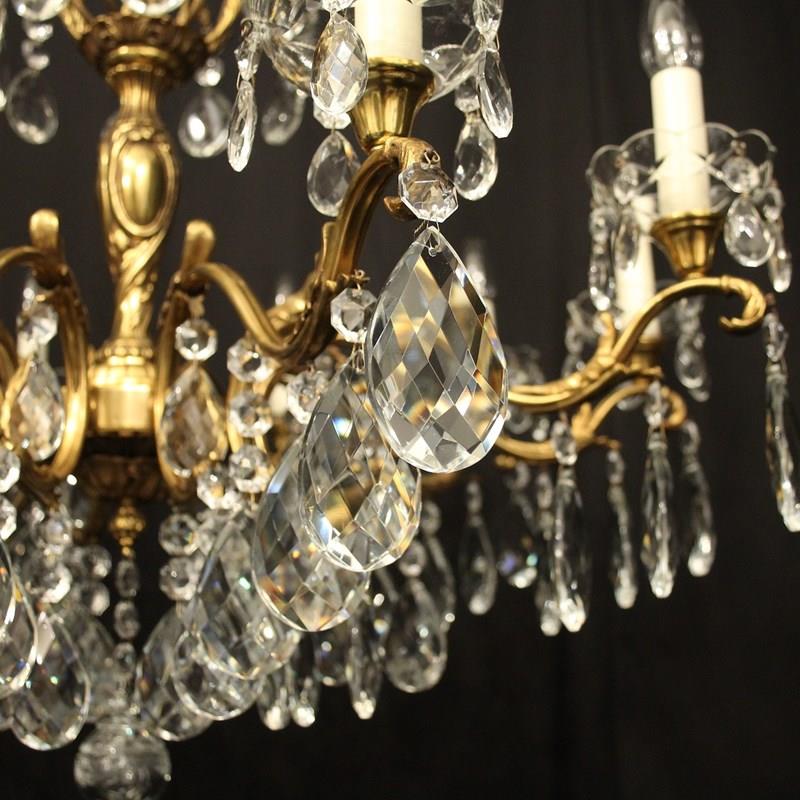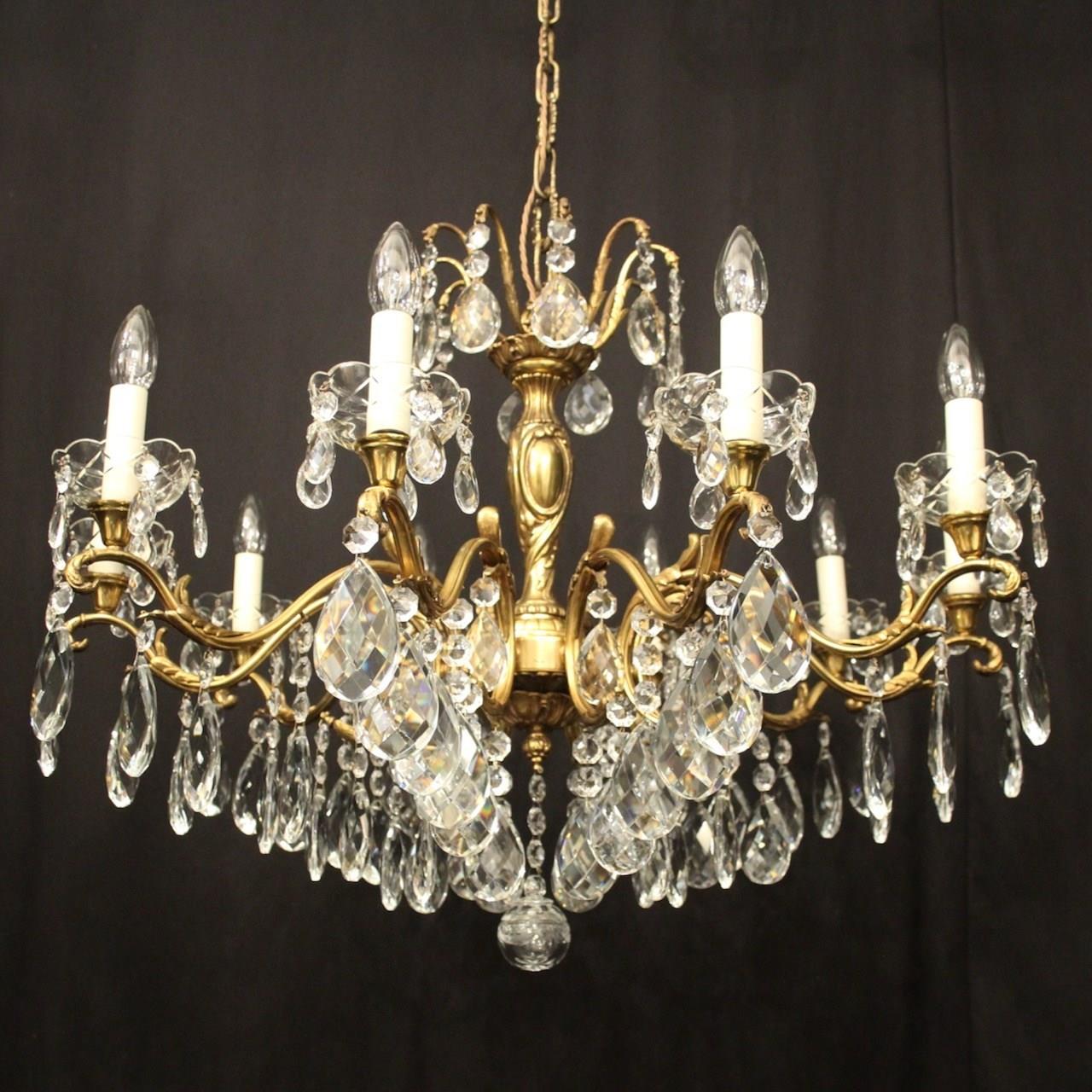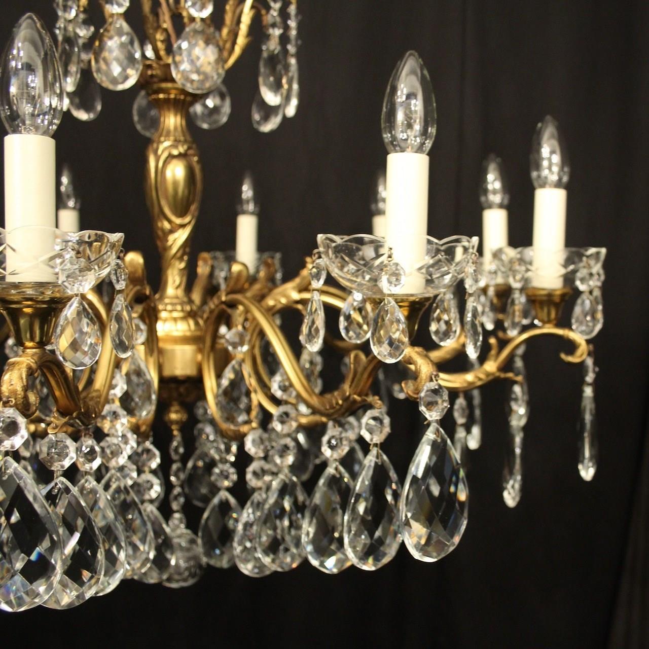 A French gilded brass and crystal 10 light antique chandelier, the leaf clad scrolling arms with crystal bobeche drip pans, issuing from an ornate foliated central column with scrolling leaf canopy, decorated overall in double pear faceted crystal pendants and having the original chain and ceiling rose. Great colour and nice wide proportions. Fully rewired and PAT tested. All our chandeliers come with ceiling fixings and spare bulbs.