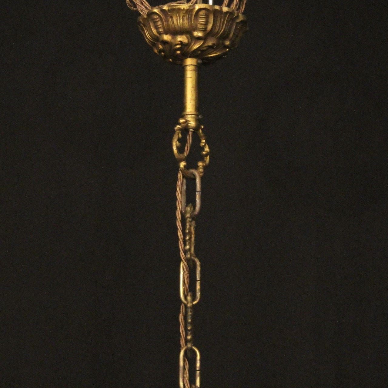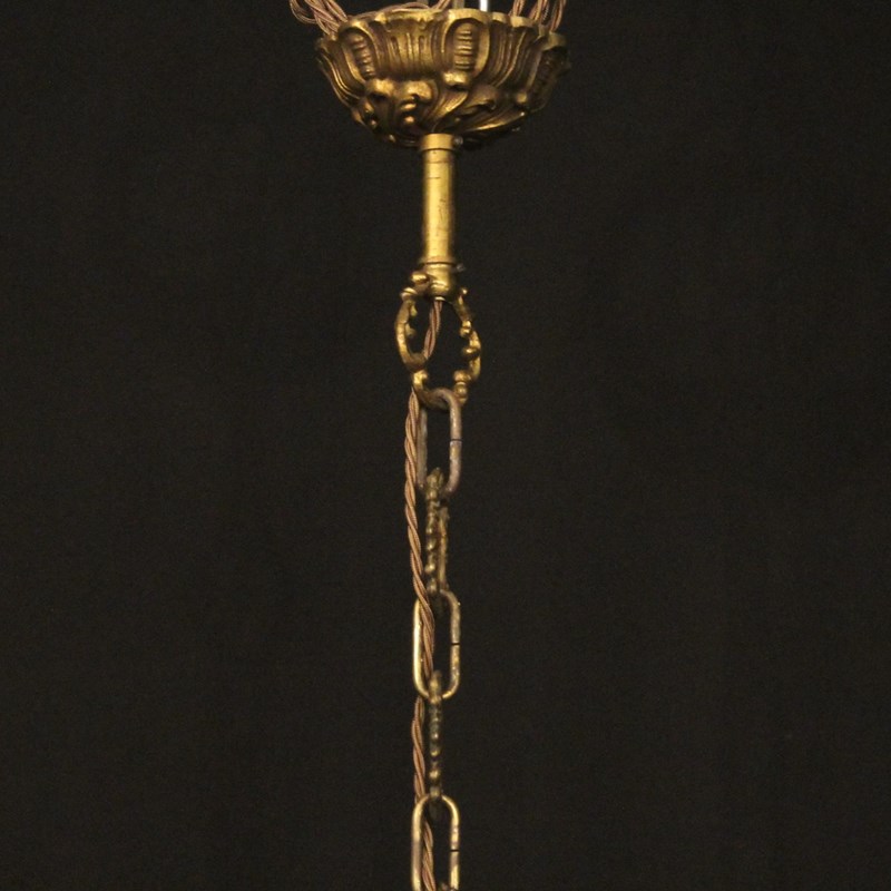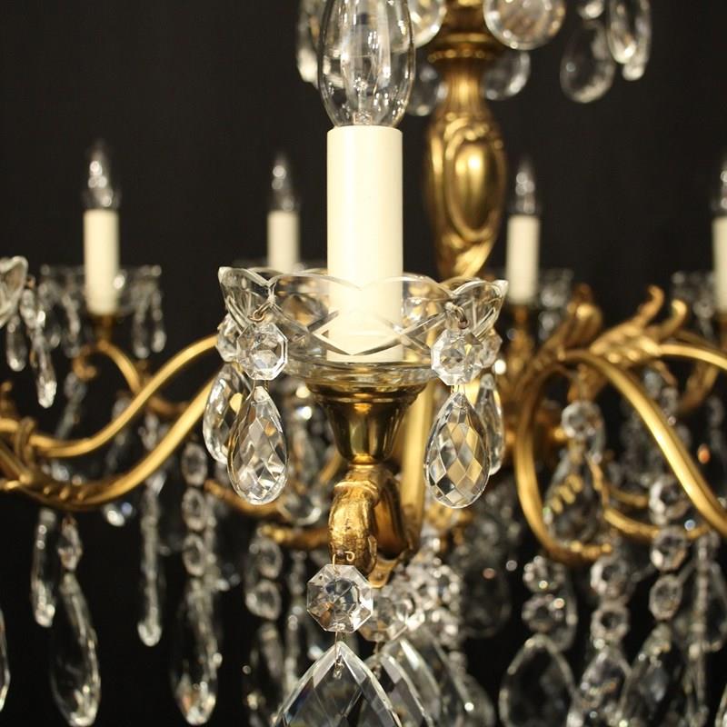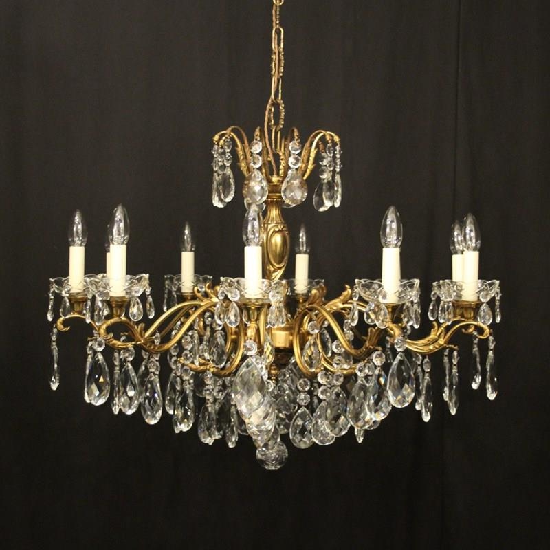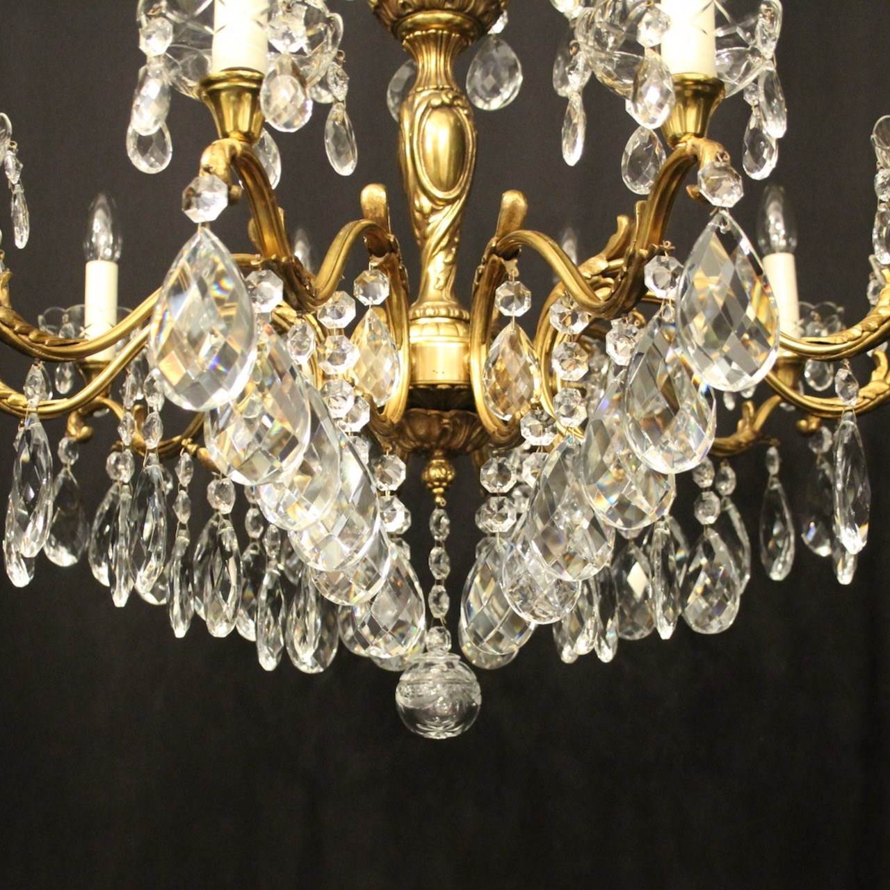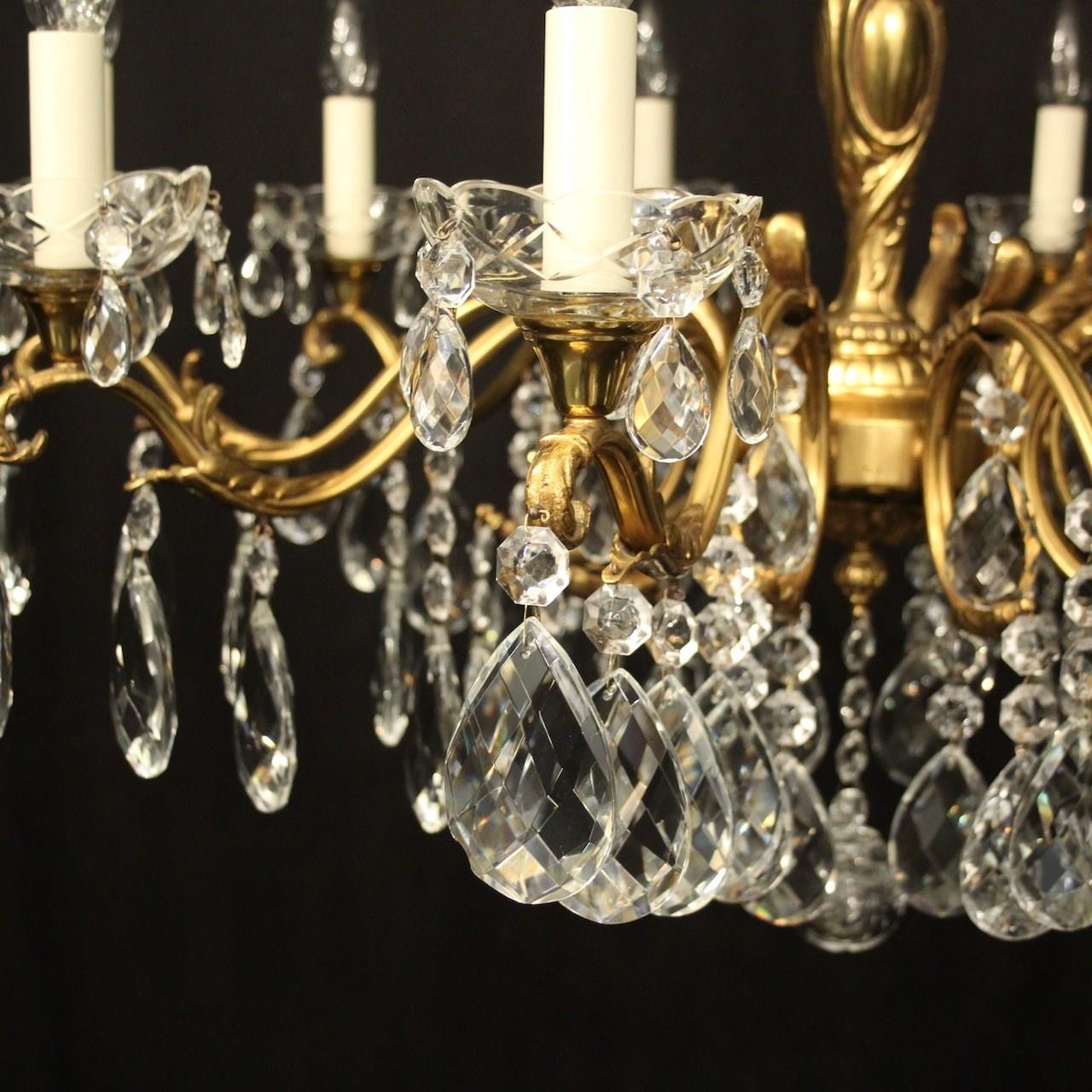 A French gilded brass and crystal 10 light antique chandelier, the leaf clad scrolling arms with crystal bobeche drip pans, issuing from an ornate foliated central column with scrolling leaf canopy, decorated overall in double pear faceted crystal pendants and having the original chain and ceiling rose. Great colour and nice wide proportions. Fully rewired and PAT tested. All our chandeliers come with ceiling fixings and spare bulbs.