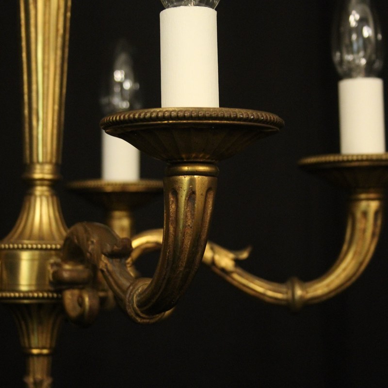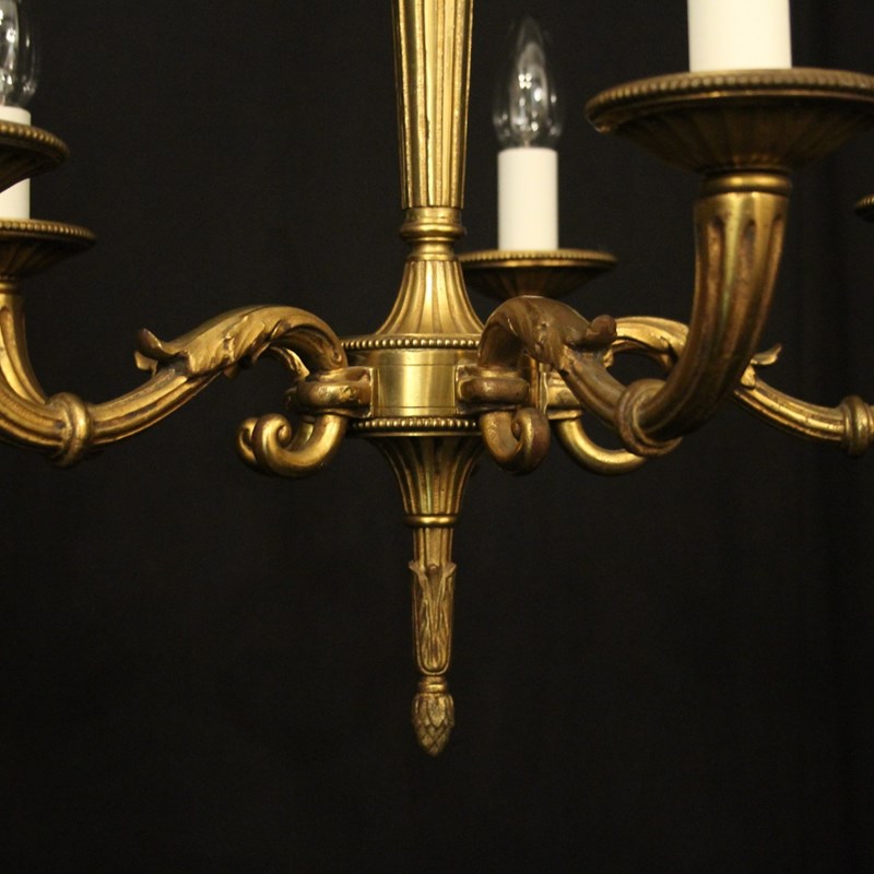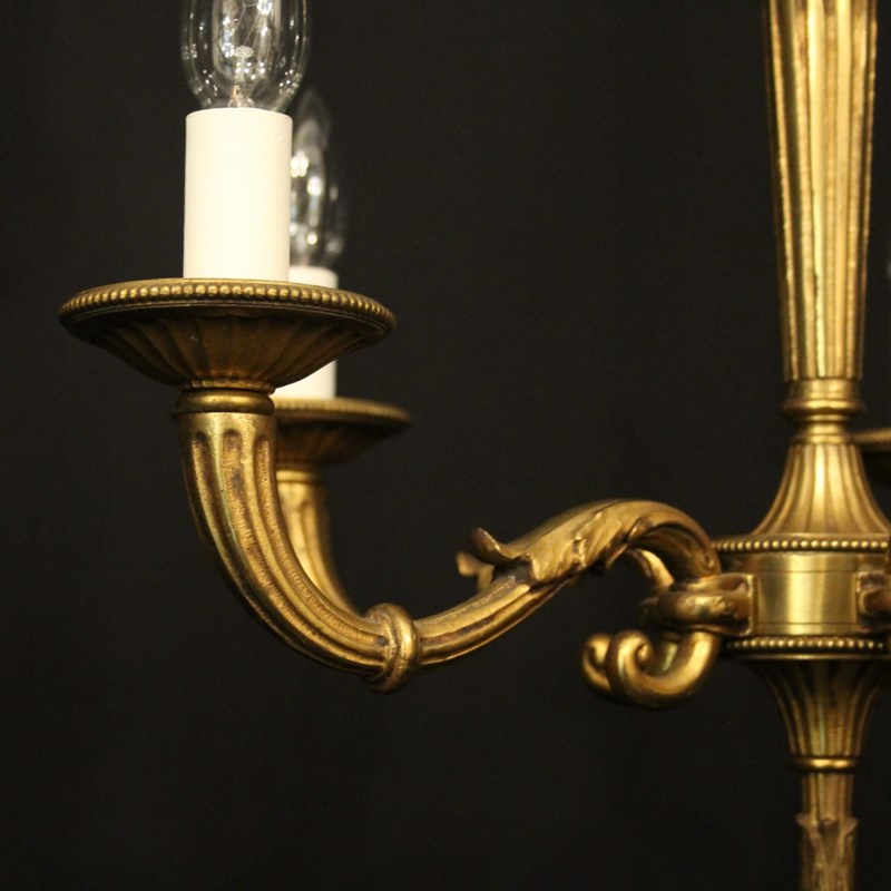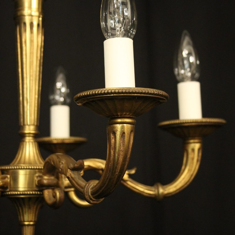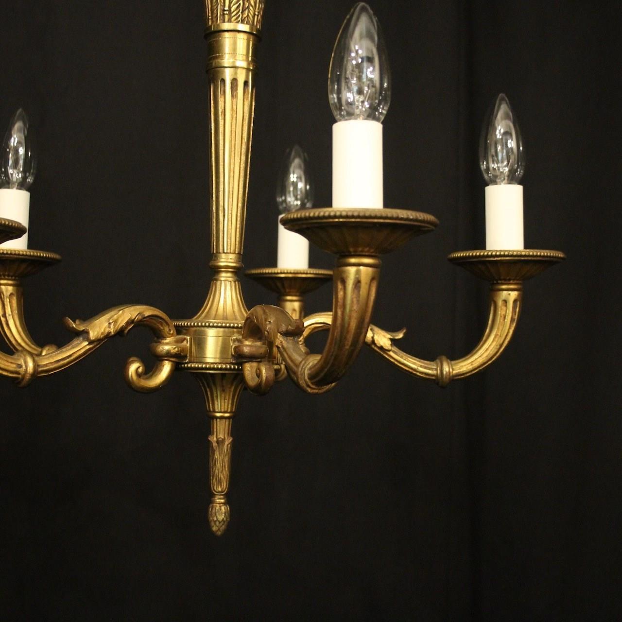 A French gilded bronze 5 light antique chandelier, the reeded tapering scrolling arms with circular millgrain bobeche drip pans, issuing from a reeded tapering central column with arrow head finial and having the original chain and ceiling rose, nice original crisp gilded patination. Fully rewired and PAT tested. All our chandeliers come with bulbs and ceiling fixings.