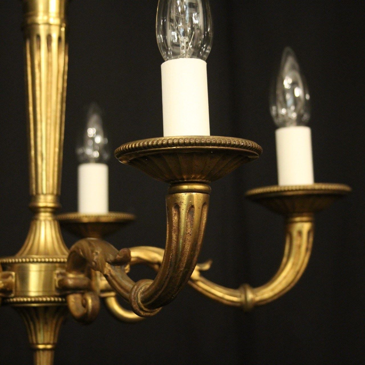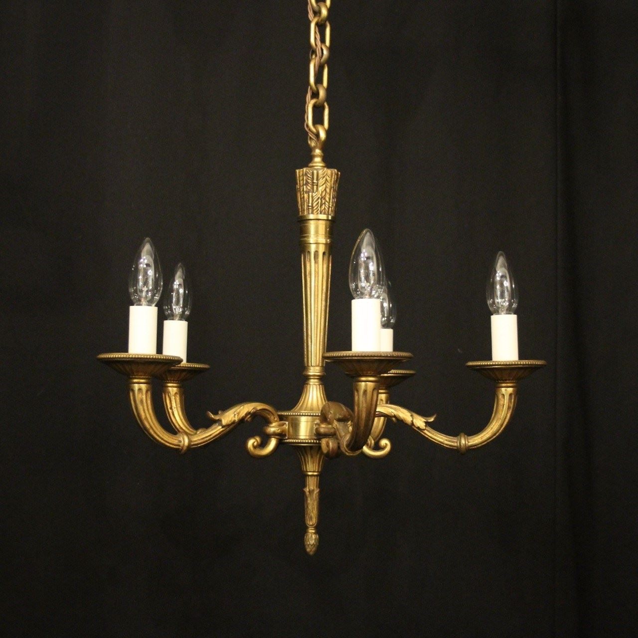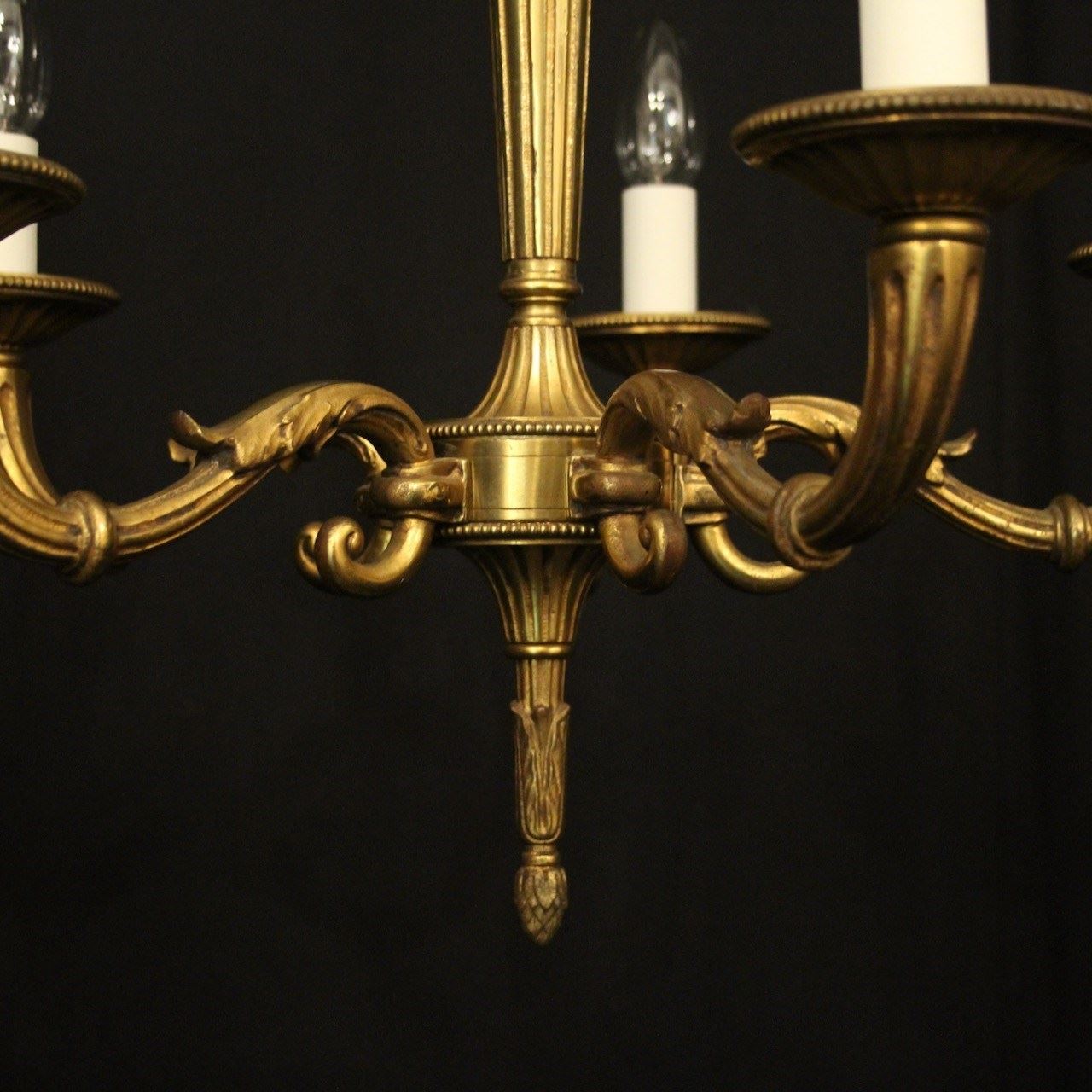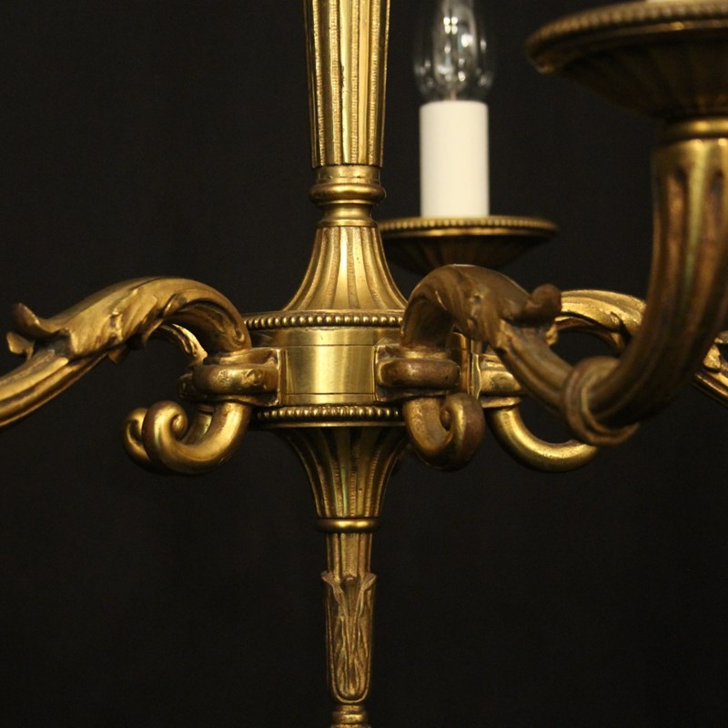 A French gilded bronze 5 light antique chandelier, the reeded tapering scrolling arms with circular millgrain bobeche drip pans, issuing from a reeded tapering central column with arrow head finial and having the original chain and ceiling rose, nice original crisp gilded patination. Fully rewired and PAT tested. All our chandeliers come with bulbs and ceiling fixings.