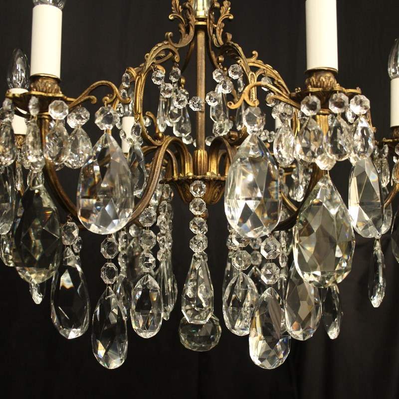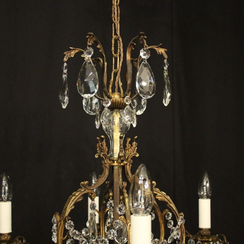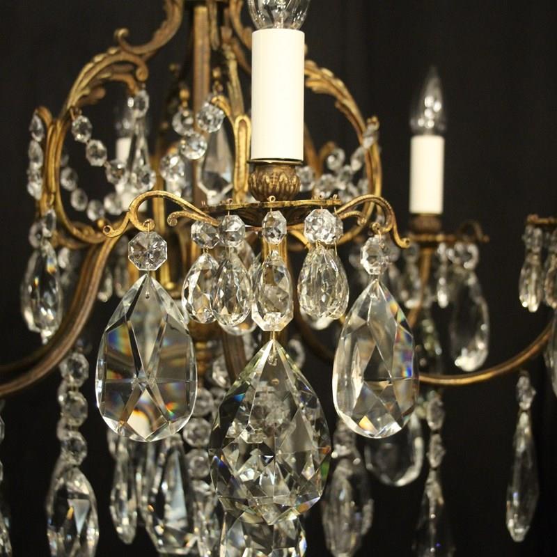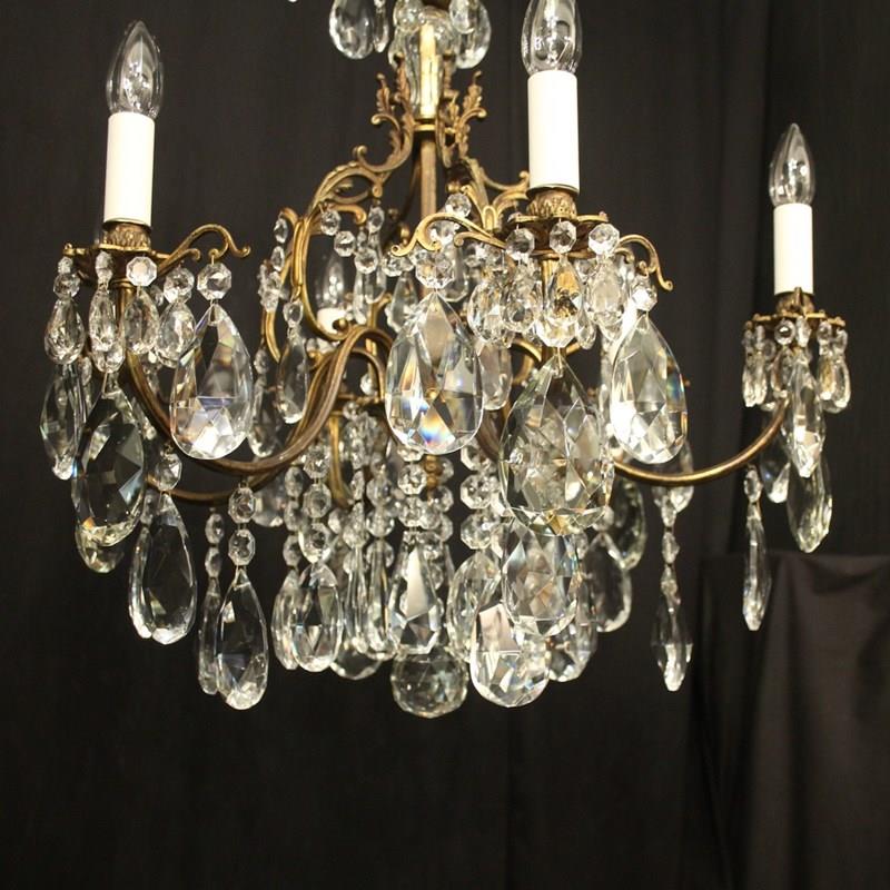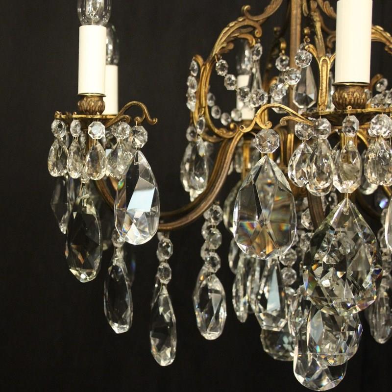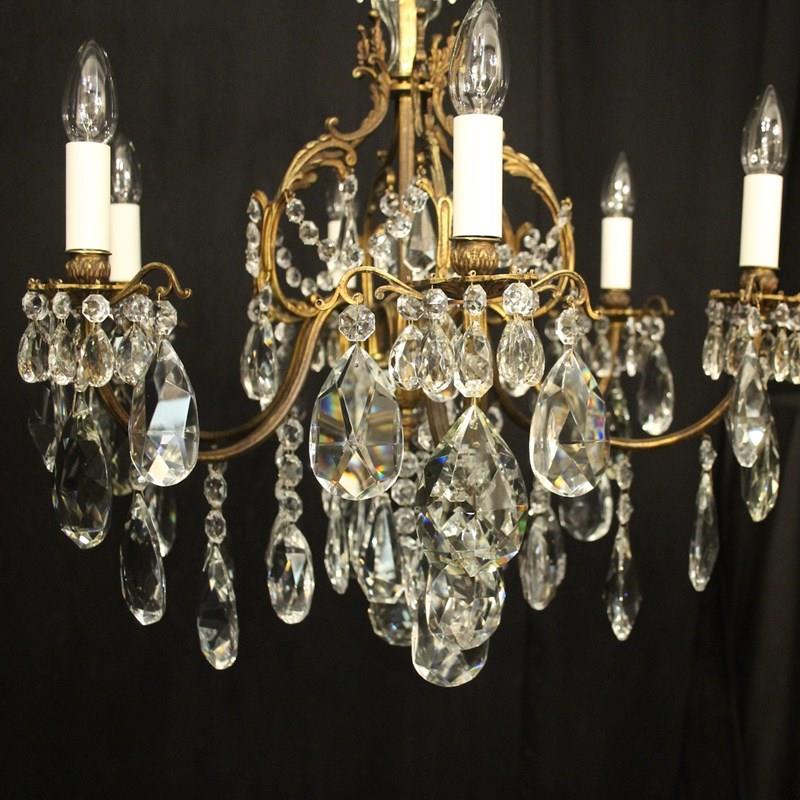 A French gilded brass and crystal 6 light antique chandelier, the scrolling arms with leaf bobeche drip pans and bulbous candle sconces, issuing from an open cage central column with scrolling glass baluster canopy, decorated overall in quality crystal faceted pendants and having the original chain and ceiling rose. Fully rewired and PAT tested. All our chandeliers come with ceiling fixings and spare bulbs.