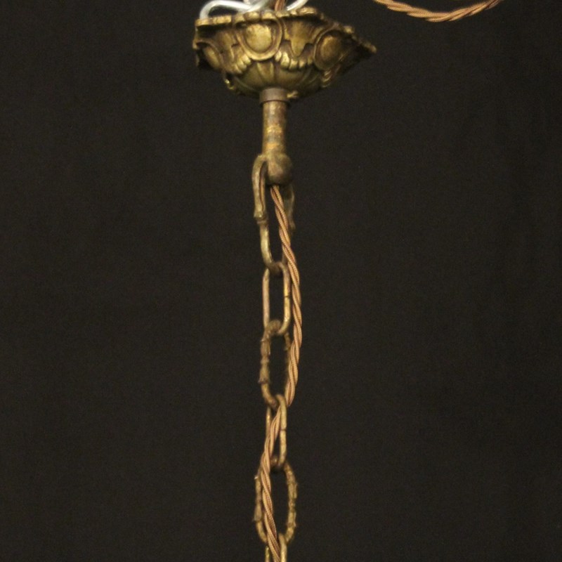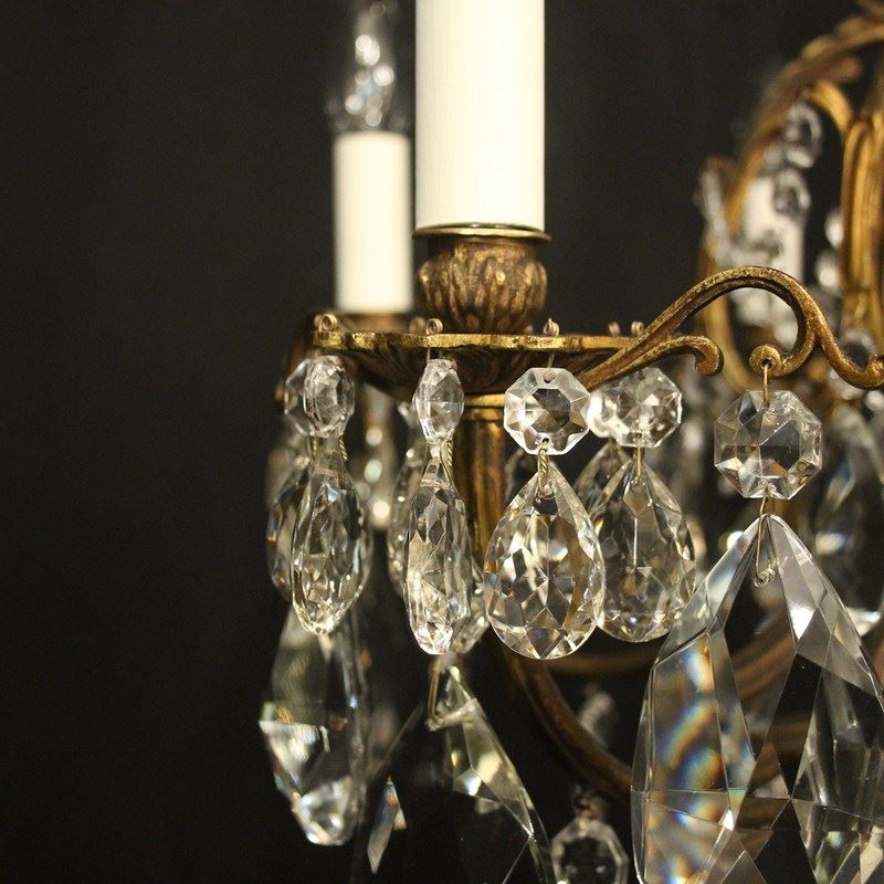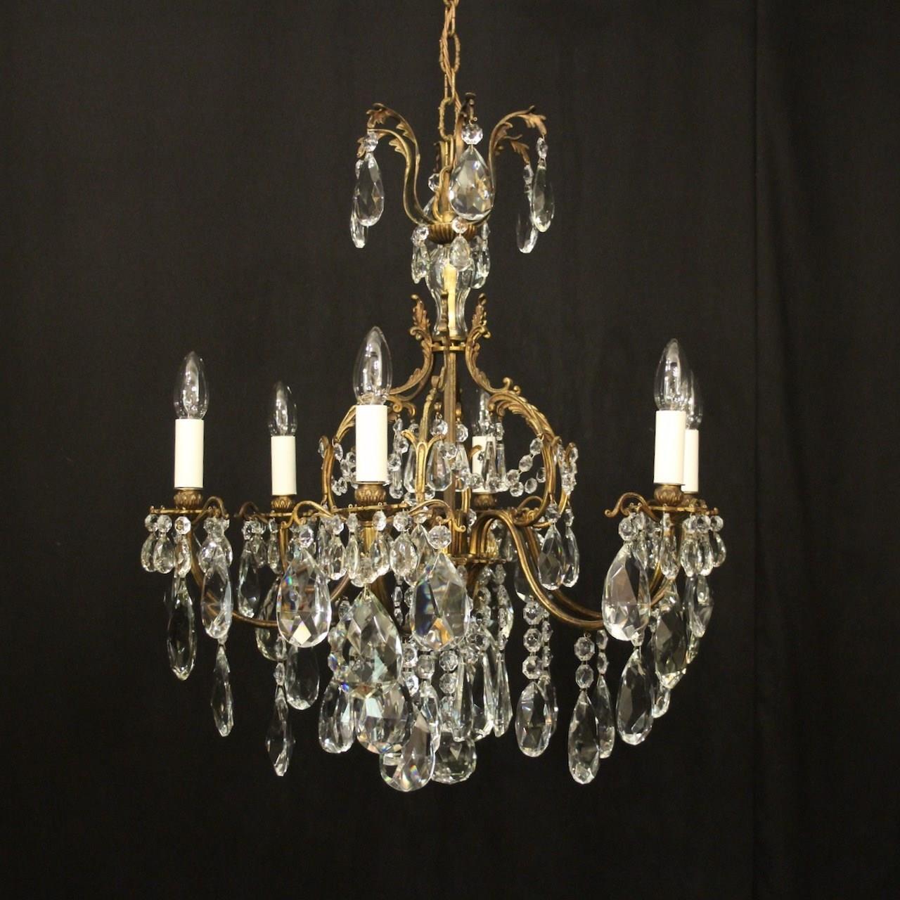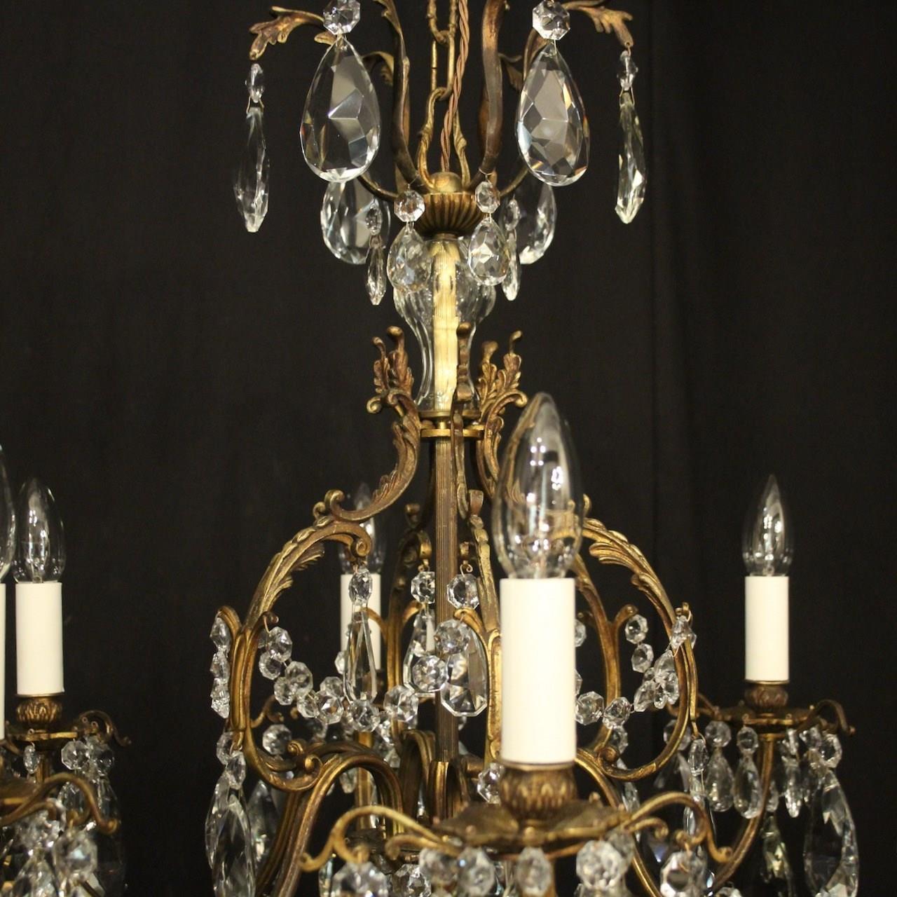 A French gilded brass and crystal 6 light antique chandelier, the scrolling arms with leaf bobeche drip pans and bulbous candle sconces, issuing from an open cage central column with scrolling glass baluster canopy, decorated overall in quality crystal faceted pendants and having the original chain and ceiling rose. Fully rewired and PAT tested. All our chandeliers come with ceiling fixings and spare bulbs.